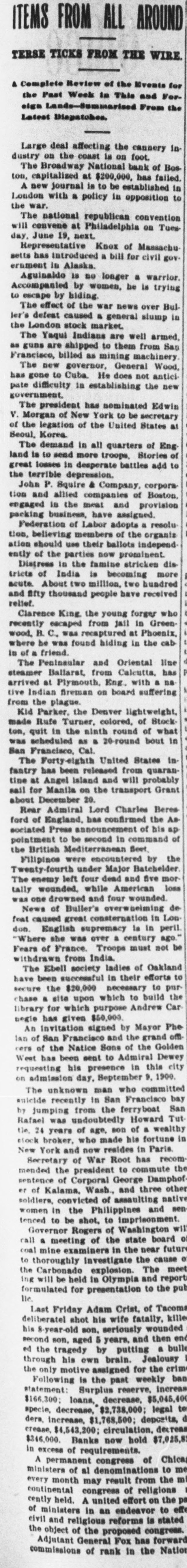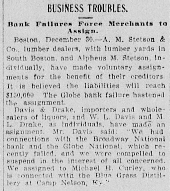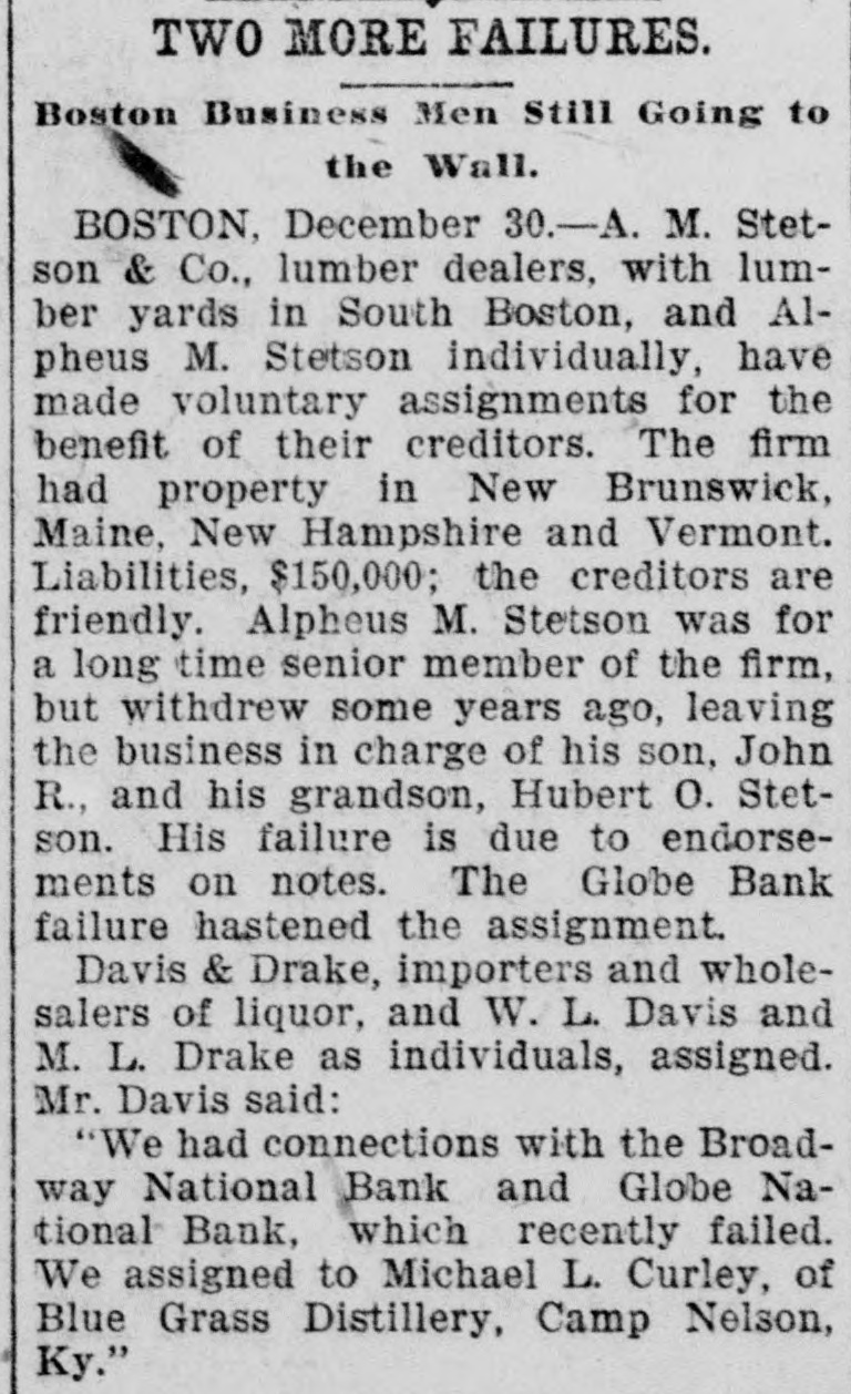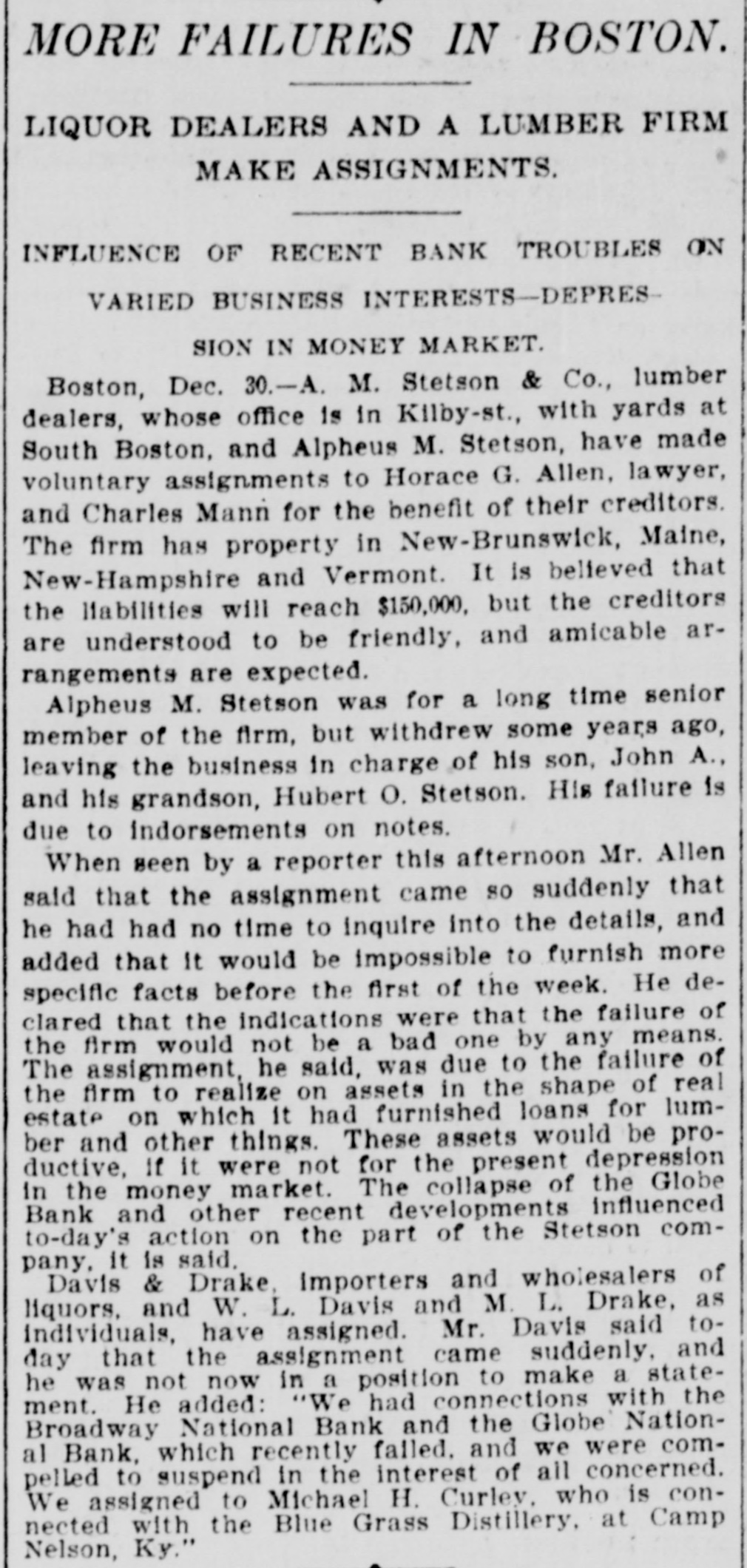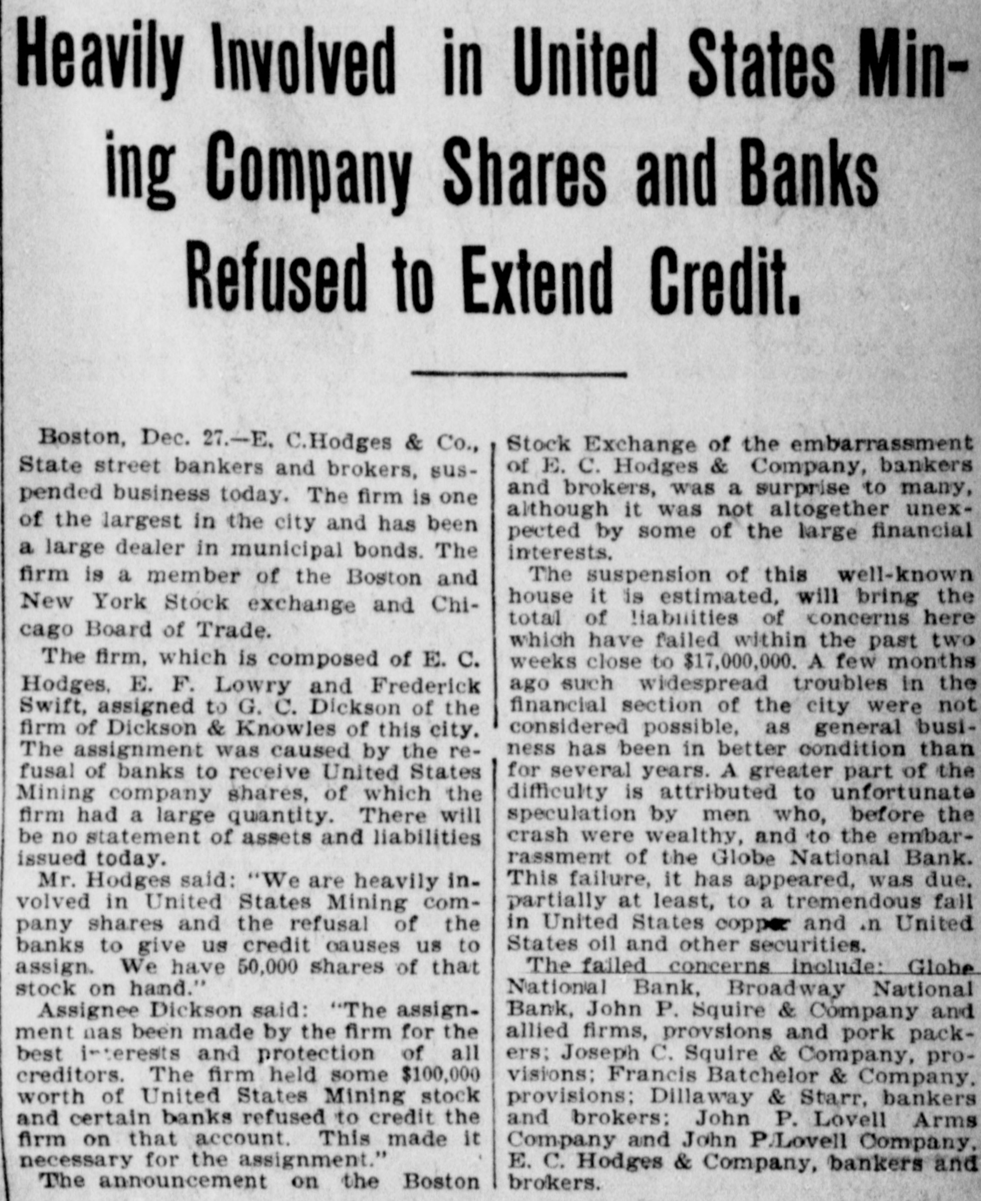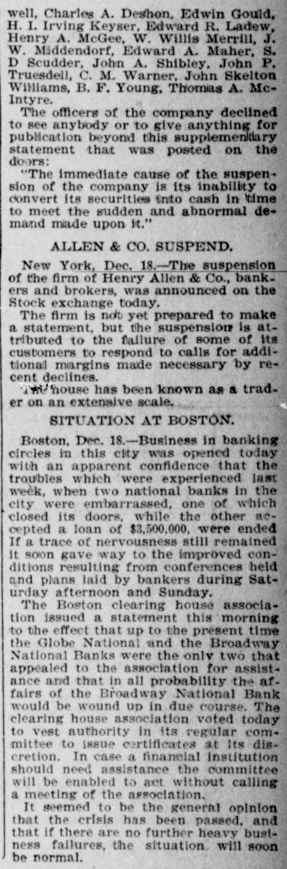Broadway National in Hands of Government Officials. BY FAILURE CAUSED SQUIRE Excitement in Financial Circles Followed Announcement. LAST PUBLIC STATEMENT BOSTON. December 16.-As a result of the failure of the John P. Squire Company (corporation) of Cambridge for $3,000,000, which was announced late yesterday afternoon. the Broadway National Bank here. in which the Squires were largely interested, did not open its doors today, and a notice at the entrance stated that the affairs of the bank were in the hands of the controller of the currency. The news that the bank had closed caused considerable excitement in financial circles, which had not entirely recovered from the disturbance occasioned by the announcement Thursday that the Globe National Bank had been given credit by the clearing house to the extent of $300,000. Wild Rumors Afloat. It did not take long for the news of the trouble to circulate widely, and all sorts of wild rumors were set afloat. These reports made mention of other banks with which the Squires were connected, and one or two institutions which it was said would be most likely to feel the influence of the disturbance. For an hour these conditions prevailed. but as one after the other of the banks mentioned were found to be doing business as usual. the agitation began to subside. and by 1 o'clock affairs apparently had resumed their normal state. The Broadway National Bank is located at the corner of Milk and Arch streets. Roswell C. Downer is its president. and Frank O. Squire, president and manager of the John P. Squire Company, is vice president. When it became known yesterday that the Squire firm was in trouble. the clearing house took up the question of giving assistance to the Broadway National Bank. After an investigation, which was not completed until last evening. it was decided to take no action. Controller Dawes Notified. The officials of the bank at once entered into conmunication with Controller Dawes, with the result that the institution was turned over into the controller's hands, Bank Examiner Wing being designated as temporary receiver. The Broadway National Bank was incorporated in 1853. Its last statement, presented at the close of business December 9, showed the following figures: Capital, $200.000: loans, $1,995,000; circulation, $45,000; individual deposits, $2,348,000; due banks, $131,000; due from reserve agents, $274,000; expenses, clearing house. $273,000; due from banks, $168,000: 5 per cent funds, $2,250; legal tender, $158,000; specie, $113,000. Besides President Downer and Vice Prestdent Squire, the directors of the bank include Henry L. Lawrence, John J. Graham and Frank W. Downer. No other Failures Expected. Members of the clearing house committee refused to discuss the Broadway Bank question today. It seemed to be the opinion among bankers that no important failures would follow the closing of the institution. The city of Boston was a depositor in the Broadway National, and $97,000 of city money is tied up. The commonwealth of Massachusetts also had a deposit in the bank amounting to about $50,000. Controller Dawes of the treasury last night ordered the doors of the Broadway National Bank of Boston closed. It was placed in the hands of Daniel G. Wing, national bank examiner, as temporary receiver.