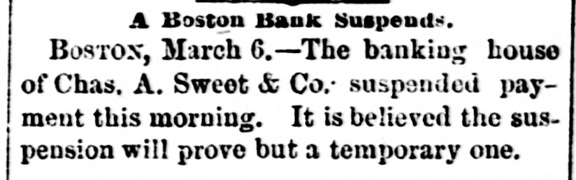 Suspension of a Banking House. BOSTON, March 6.-The banking house of Chas. A. Sweet & Co. suspended this morning, causing considerable excitement in financial circles. The house has been advancing money, it is stated, to the Massachusetts Central Railroad, taking bonds and placing them in the market. The road is a new one, and its bonds have shrunk in value, and the banks which have been carrying the bonds called on Sweet for additional funds. To this call the firm has been unable to respond.