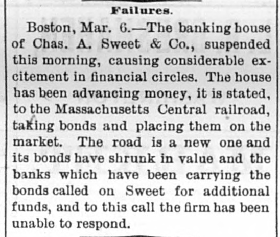 Failures. Boston, Mar. 6.-The banking house of Chas. A. Sweet & Co., suspended this morning, causing considerable excitement in financial circles. The house has been advancing money, it is stated, to the Massachusetts Central railroad, taking bonds and placing them on the market. The road is a new one and its bonds have shrunk in value and the banks which have been carrying the bonds called on Sweet for additional funds, and to this call the firm has been unable to respond.