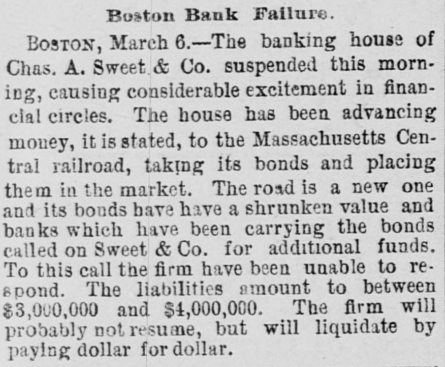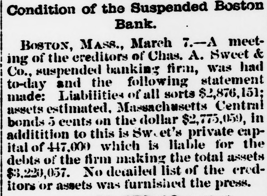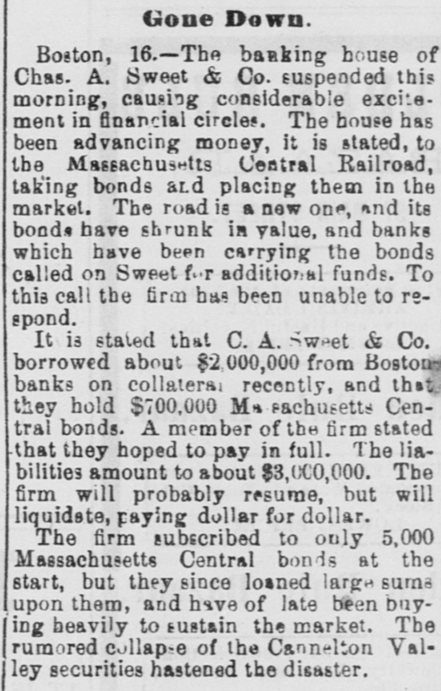 # Gone Down. Boston, 16.-The banking house of Chas. A. Sweet & Co. suspended this morning, causing considerable excitement in financial circles. The house has been advancing money, it is stated, to the Massachusetts Central Railroad, taking bonds and placing them in the market. The road is a new one, and its bonds have shrunk in value, and banks which have been carrying the bonds called on Sweet for additional funds. To this call the firm has been unable to respond. It is stated that C. A. Sweet & Co. borrowed about $2,000,000 from Boston banks on collateral recently, and that they hold $700,000 Massachusetts Central bonds. A member of the firm stated that they hoped to pay in full. The liabilities amount to about $3,000,000. The firm will probably resume, but will liquidate, paying dollar for dollar. The firm subscribed to only 5,000 Massachusetts Central bonds at the start, but they since loaned large sums upon them, and have of late been buying heavily to sustain the market. The rumored collapse of the Cannelton Valley securities hastened the disaster.