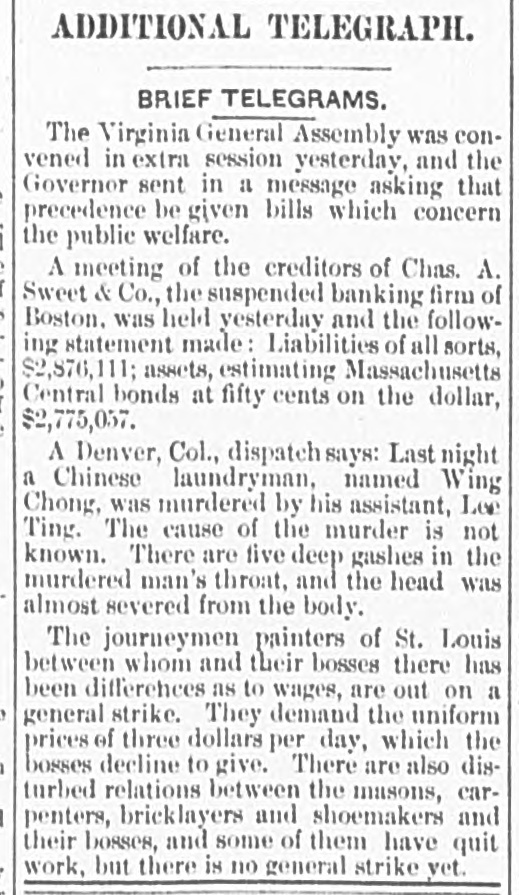 ADDITIONAL TELEGRAPH. BRIEF TELEGRAMS. The Virginia General Assembly was convened in extra session yesterday, and the Governor sent in a message asking that precedence be given bills which concern the public welfare. A meeting of the creditors of Chas. A. Sweet & Co., the suspended banking firm of Boston, was held yesterday and the following statement made: Liabilities of all sorts, $2,876,111; assets, estimating Massachusetts Central bonds at fifty cents on the dollar, $2,775,057. A Denver, Col., dispatch says: Last night a Chinese laundryman, named Wing Chong, was murdered by his assistant, Lee Ting. The cause of the murder is not known. There are five deep gashes in the murdered man's throat, and the head was almost severed from the body. The journeymen painters of St. Louis between whom and their bosses there has been differences as to wages, are out on a general strike. They demand the uniform prices of three dollars per day, which the bosses decline to give. There are also disturbed relations between the masons, carpenters, bricklayers and shoemakers and their bosses, and some of them have quit work, but there is no general strike yet.