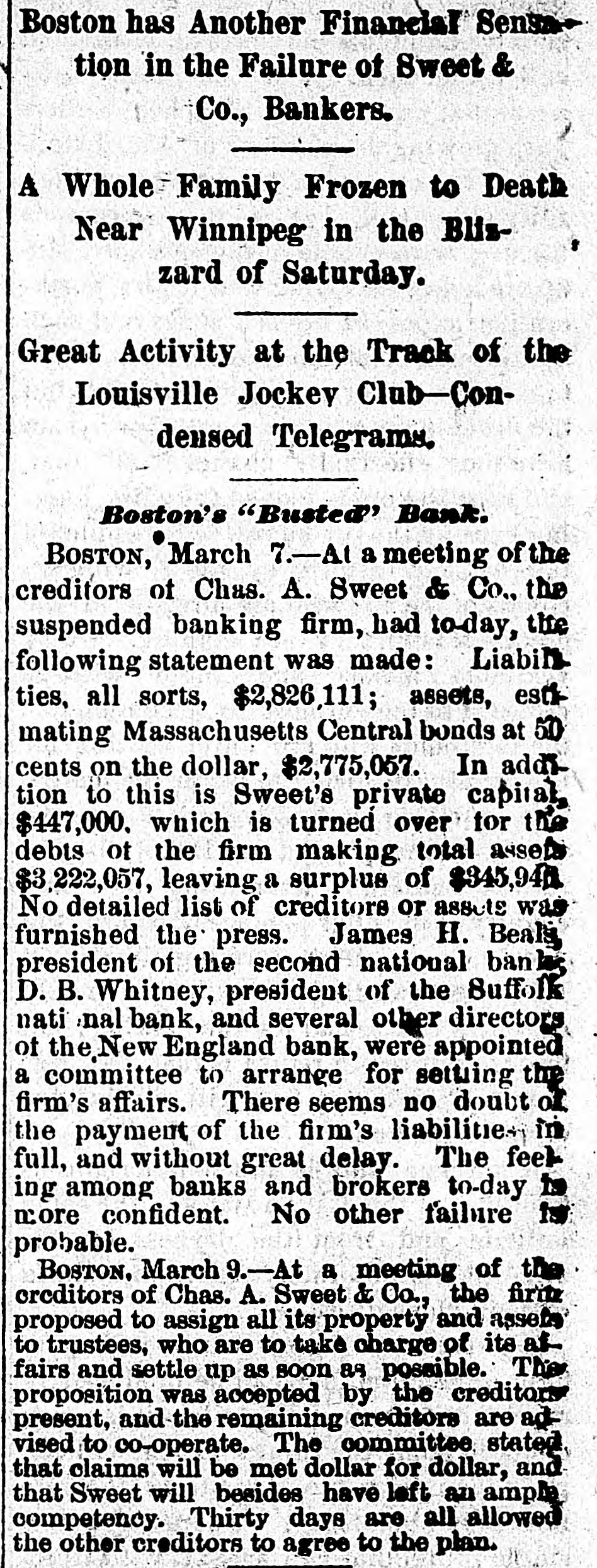 Boston has Another Financial Sensa tion in the Failure of Sweet & Co., Bankers. A Whole Family Frozen to Death Near Winnipeg in the Bliszard of Saturday. Great Activity at the Track of the Louisville Jockey Club-Condensed Telegrams. Boston's "Busted" Bank. BOSTON, March 7.-At a meeting of the creditors of Chas. A. Sweet & Co., the suspended banking firm, had today, the following statement was made: Liabils ties, all sorts, $2,826,111; assets, estkmating Massachusetts Central bonds at 50 cents on the dollar, $2,775,057. In add's tion to this is Sweet's private capital, $447,000. which is turned over for the debts ot the firm making total assets $3,222,057, leaving a surplus of $345,94h No detailed list of creditors or assute was furnished the press. James H. Beals president of the second national banl D. B. Whitney, president of the Suffolk nati nal bank, and several other directors of the New England bank, were appointed a committee to arrange for setting the firm's affairs. There seems no doubt of the payment of the firm's liabilities in full, and without great delay. The feel ing among banks and brokers to-day more confident. No other failure fa probable. BOSTON. March 9.-At a meeting of the creditors of Chas. A. Sweet & Co., the firm proposed to assign all its property and assets to trustees, who are to take charge of its atfairs and settle up as soon as possible. The proposition was accepted by the creditors present, and-the remaining creditors are advised to co-operate. The committee. stated that claims will be met dollar for dollar, and that Sweet will besides have left an amplia competency. Thirty days are all allowed the other creditors to agree to the plan.