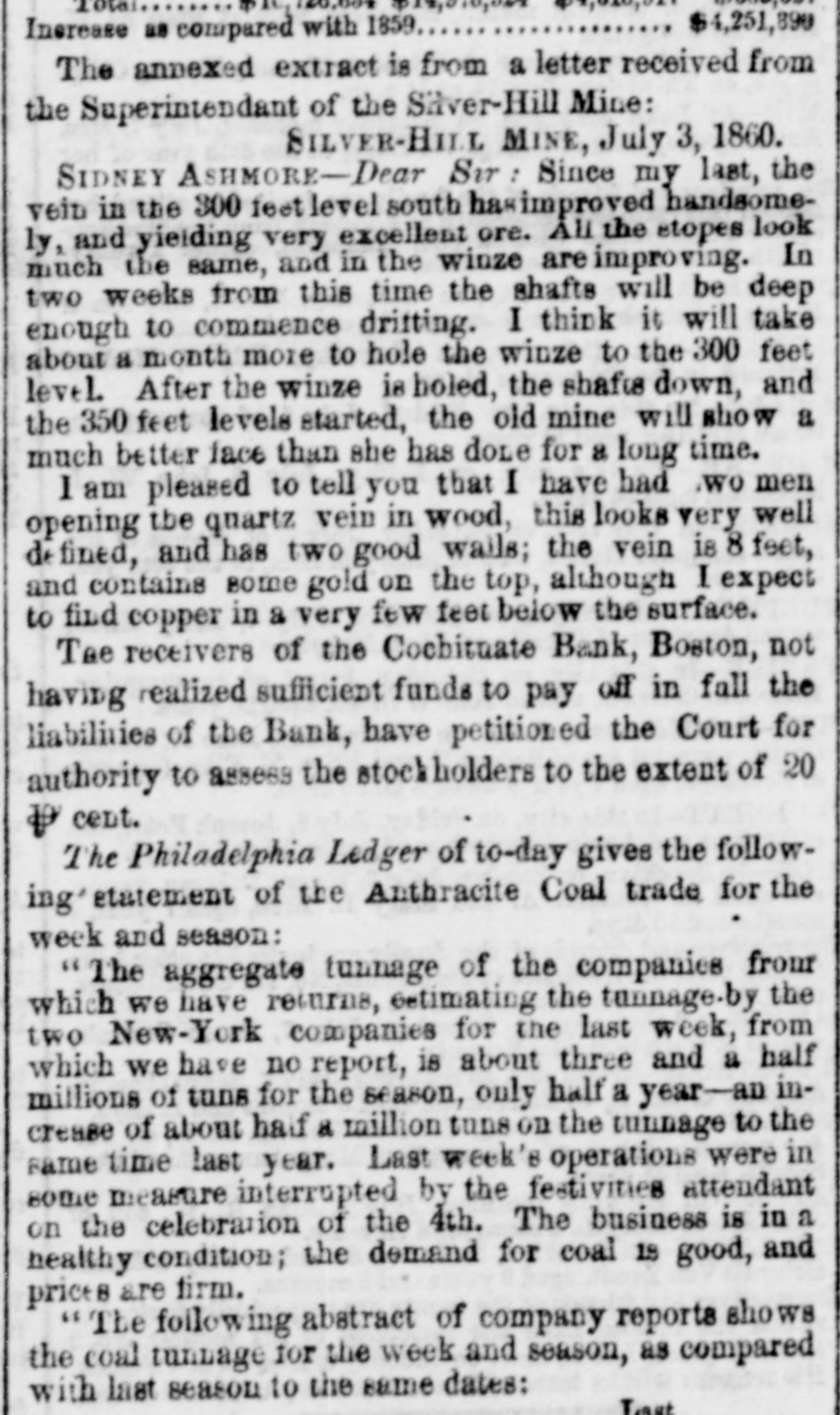 $4,251,890 Increase as compared with 1859 The annexed extract is from a letter received from the Superintendant of the Silver-Hill Mine: SILVER-HILL MINE, July 3, 1860. SIDNEY ASHMORE-Dear Sir: Since my last, the vein in the 300 feet level south hasimproved handsomely, and yielding very excellent ore. All the stopes look much the same, and in the winze are improving. In two weeks from this time the shafts will be deep enough to commence dritting. I think it will take about a month more to hole the winze to the 300 feet level. After the winze is holed, the shafts down, and the 350 feet levels started, the old mine will show a much better face than she has done for a long time. I am pleased to tell you that I have had .WO men opening the quartz vein in wood, this looks very well de fined, and has two good wails; the vein is 8 feet, and contains some gold on the top, although I expect to find copper in a very few feet below the surface. Tae receivers of the Cochituate Bank, Boston, not having realized sufficient funds to pay off in fall the liabilities of the Bank, have petitioned the Court for authority to assess the stock holders to the extent of 20 P cent. The Philadelphia Ledger of to-day gives the following' statement of the Anthracite Coal trade for the week and season: "The aggregate tunnage of the companies from which we have returns, estimating the tunnage.by the two New-York companies for the last week, from which we have no report, is about three and a half millions of tuns for the season, only half a year-an increase of about half a million tuns on the tunnage to the same time last year. Last week's operations were in some measure interrupted by the festivities attendant on the celebration of the 4th. The business is in a healthy condition; the demand for coal 18 good, and prices are firm. "The following abstract of company reports shows the coal tunnage for the week and season, as compared with last season to the same dates: Last