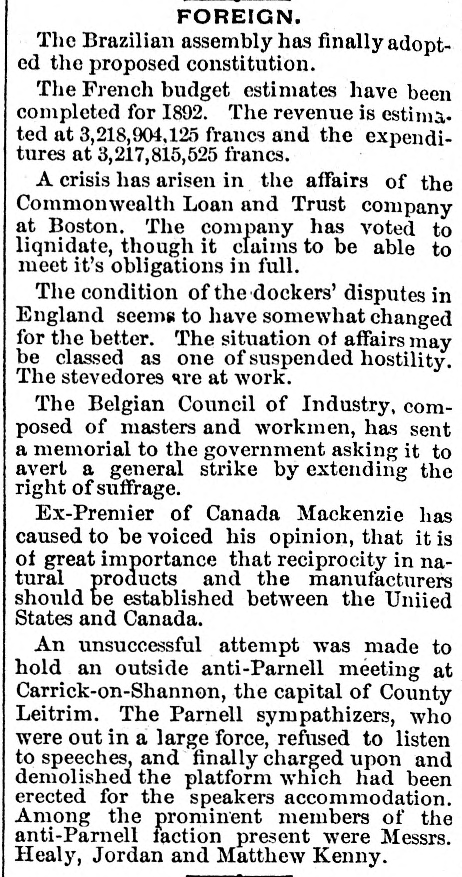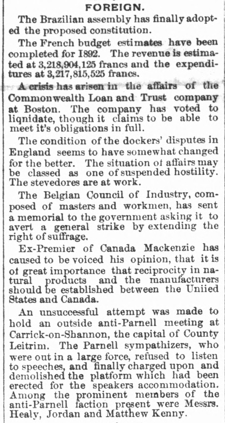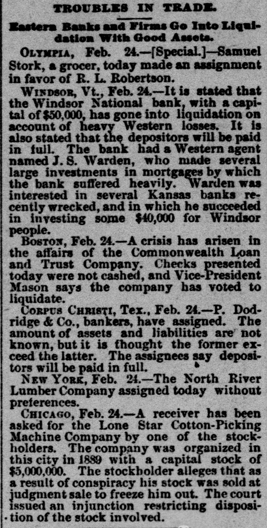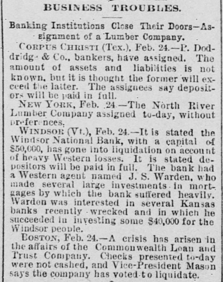 BUSINESS TROUBLES. Banking Institutions Close Their Doors-Assignment of a Lumber Company. CORPUS CHRISTI (Tex.), Feb. 24.-P. Doddridg- & Co., bankers, have assigned. The amount of assets and liabilities is not known, but it is thought the former will exceed the latter. The assignees say depositors will be paid in full. NEW YORK, Feb. 24 - The North River Lumber Company assigned to-day, without preferences. WINDSOR (Vt.), Feb. 24.-It is stated the Windsor National Bank, with a capital of $50,000, has gone into liquidation on account of heavy Western losses. It is stated depositors will be paid in full. The bank had a Western agent named J.S. Warden, who made several large investments in mortgages by which the bank suffered heavily. Wardon was interested in several Kansas banks recently wrecked and in which he succeeded in investing some $40,000 for the Windsor people. BOSTON, Feb. 24.-A crisis has arisen in the affairs of the Commonwealth Loan and Trust Company. Checks presented to-day were not cashed, and Vice-President Mason says the company has voted to liquidate.