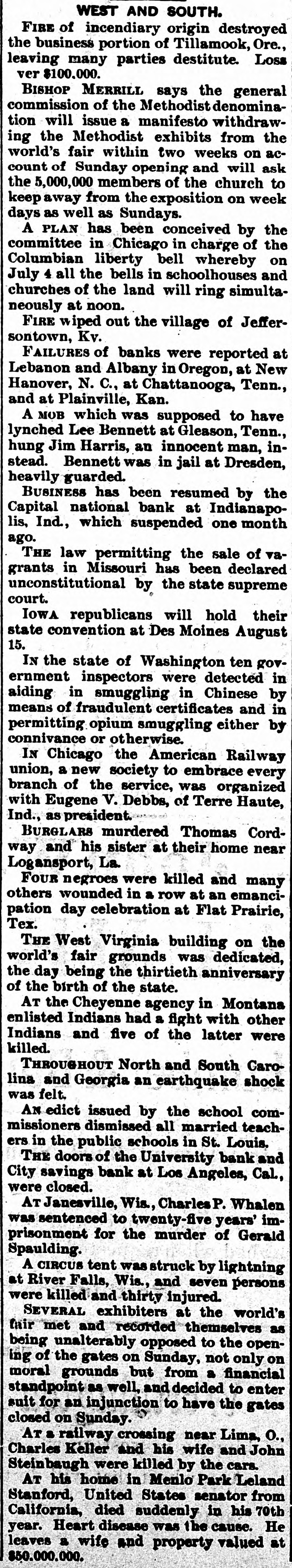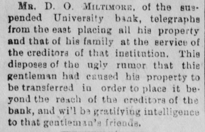 BANK SUSPENSIONS. The Stringency in the Money Market Continues With Bad Results. Eugene, June 20.-The Lane county bank, the oldest financial institution in this county, failed to open its doors this morning, having become cramped by the stringency of the money market. Hovey, Humphry and Co. have posted a notice that depositors will be paid in full. No statement has yet been made as to the assets and liabilities, but depositors do not seem to have any fears, and many say that if the bank should open this afternoon they would not draw. The cashier stated in an interview today that the assets, notes and property would amount to nearly three times the liablities. No attachments have been issued and, probably, there will be none. The bank strongly asserts that it will pay every dollar to the depositors, but in order to realize on their credits at once they would be compelled to go into court and crowd their patrons. This they did not feel disposed to do, and when they failed to secure assistance from Portland and San Francisco banks, they concluded to take plenty of time to it, and let matters shape themselves when the money market should be easier. Some excitement was created on the streets and a run was threatened on the other banks, but they were fully able to pay every demand promptly. Albany, Or., June 20.-The excitement over the financial flurry has quieted down. The official statement of the suspended bank's condition will show, it is stated, assets sufficient to pay depositors every dollar. Los Angeles, June 20.-The University Bank and the City Savings Bank closed their doors this morning. The president of the City Bank says that the bank has closed temporarily in order to collect money from its loans and securities. He says depositors will be paid in full. The closing of the University Bank, which is a commercial bank, was a surprise. It has a notice on the door to the effect that depositors will be paid in full. Washington, June 20.-The comptroller today received Messrs. Newberry and Wood, of the Citizens' National Bank of Spokane, Wash., who wish to make some arrangement for reopening that bank. No agreement satisfactory to Eckles could be made. The bank will either go into voluntary liquidation or a receiver will be appointed. Nashua, N. H., June 20.-The Colony Manufacturing Company has failed, liabilities, $168,000, assets, about half. The company was engaged in the manufacture of woolens. Chattanooga, Tenn., a June 20.-The City Savings bank, as a result of a run, has been forced to suspend. Assets, $475,000, liabilities, $225,000. All depositors will be paid in full.