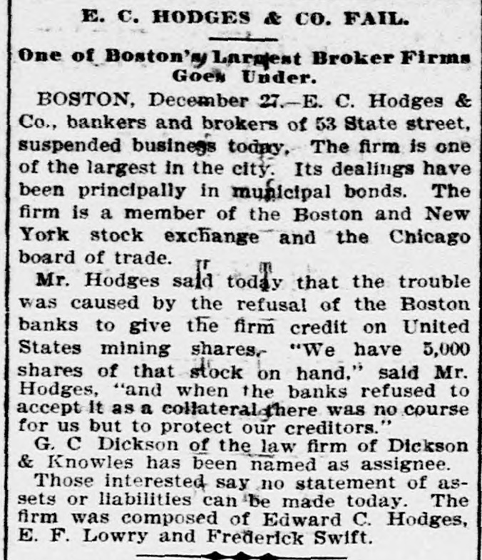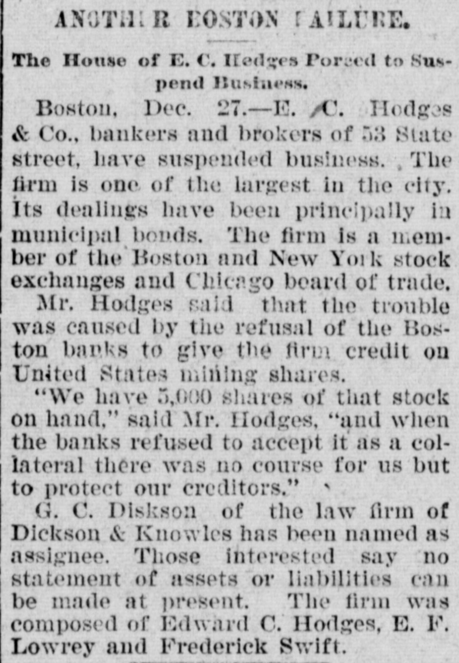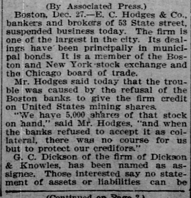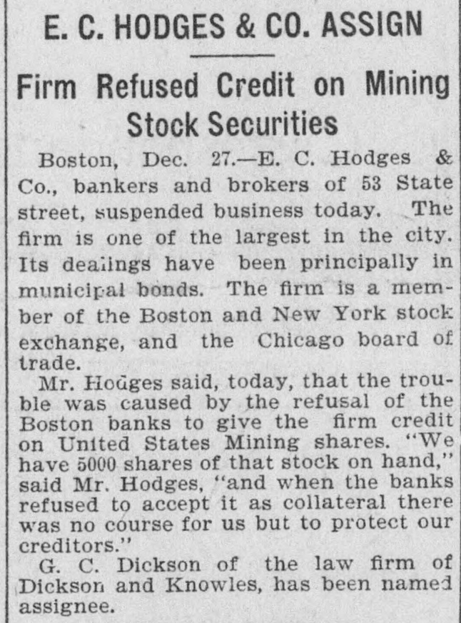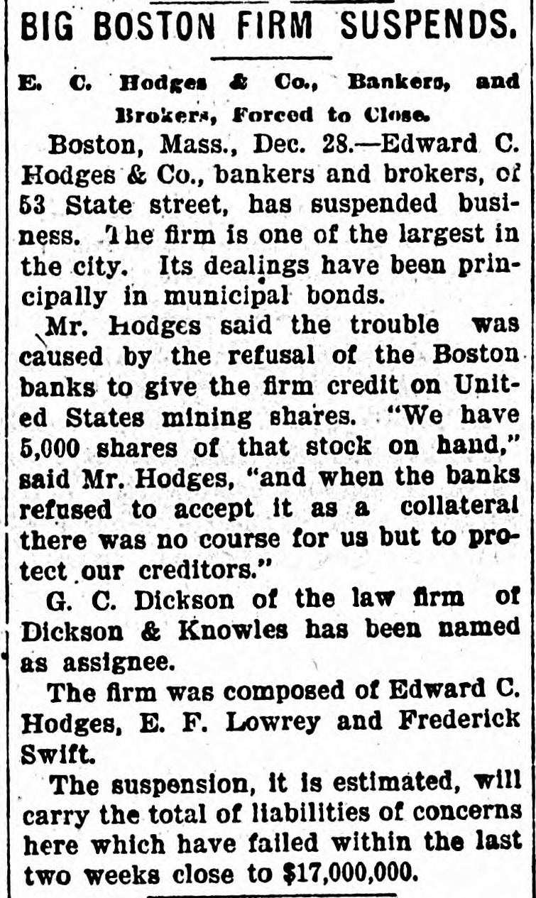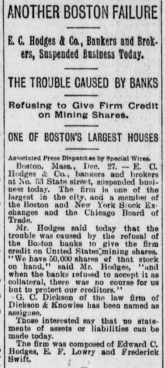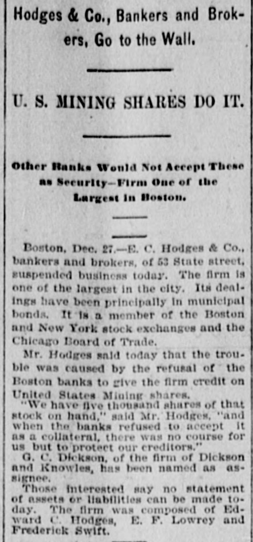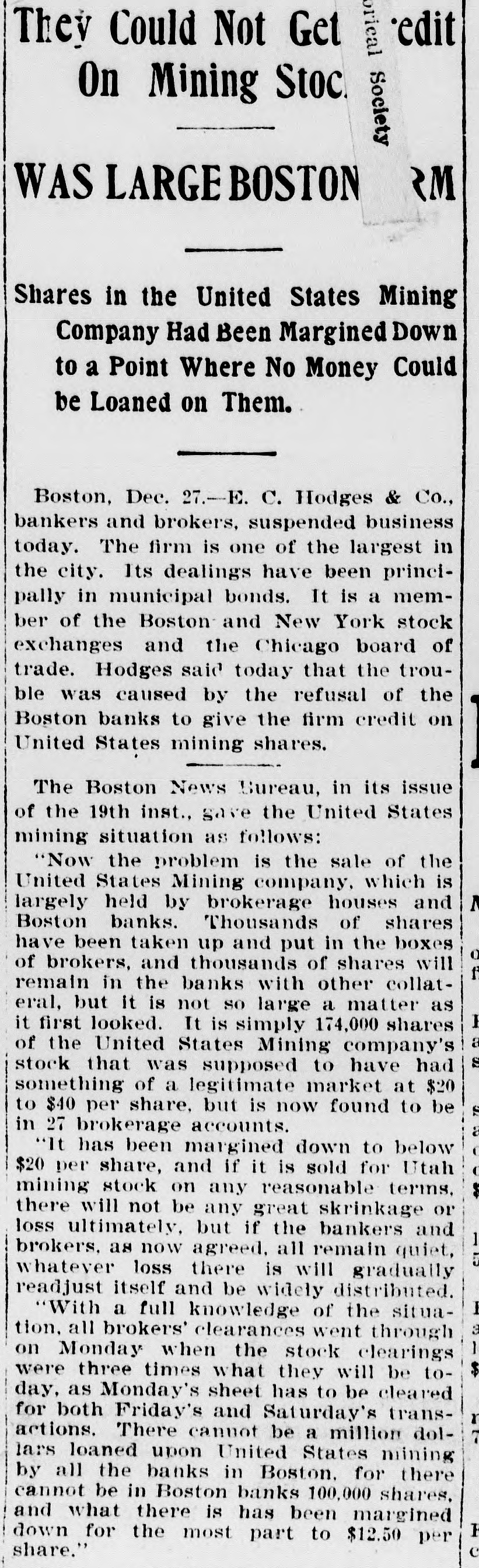 edit They Could Not Get On Mining Stoc. WAS LARGE BOSTON RM Shares in the United States Mining Company Had Been Margined Down to a Point Where No Money Could be Loaned on Them. Boston, Dec. 27.-E. C. Hodges & Co., bankers and brokers, suspended business today. The firm is one of the largest in the city. Its dealings have been principally in municipal bonds. It is a member of the Boston and New York stock exchanges and the Chicago board of trade. Hodges said today that the trouble was caused by the refusal of the Boston banks to give the firm credit on United States mining shares. The Boston News Bureau, in its issue of the 19th inst., save the United States mining situation as follows: "Now the problem is the sale of the United States Mining company, which is largely held by brokerage houses and Boston banks. Thousands of shares have been taken up and put in the boxes of brokers, and thousands of shares will remain in the banks with other collateral, but it is not so large a matter as it first looked. It is simply 174,000 shares of the United States Mining company's stock that was supposed to have had something of a legitimate market at $20 to $40 per share, but is now found to be in 27 brokerage accounts. "It has been margined down to below $20 per share, and if it is sold for Utah mining stock on any reasonable terms. there will not be any great skrinkage or loss ultimately, but if the bankers and brokers, as now agreed, all remain quiet, whatever loss there is will gradually readjust itself and be widely distributed. "With a full knowledge of the situation. all brokers' clearances went through on Monday when the stock clearings were three times what they will be today, as Monday's sheet has to be cleared for both Friday's and Saturday's transactions. There cannot be a million dollars loaned upon United States mining by all the banks in Boston. for there cannot be in Boston banks 100,000 shares, and what there is has been margined down for the most part to $12.50 per share." C