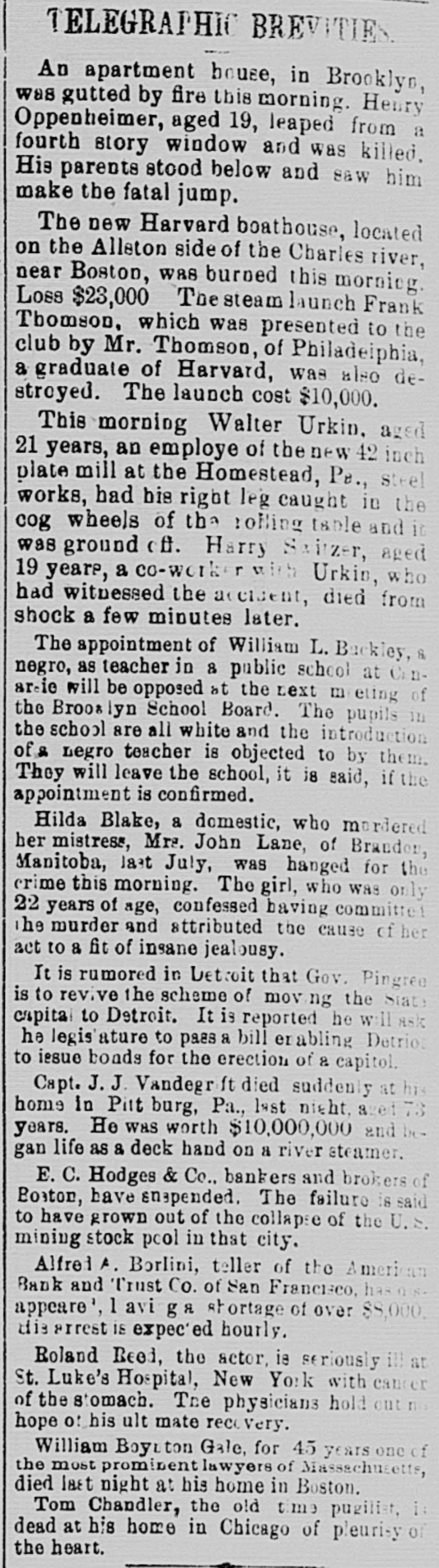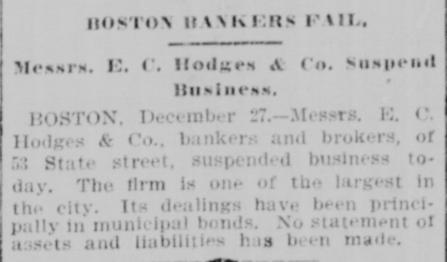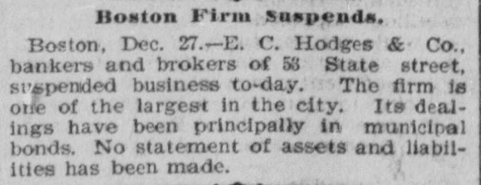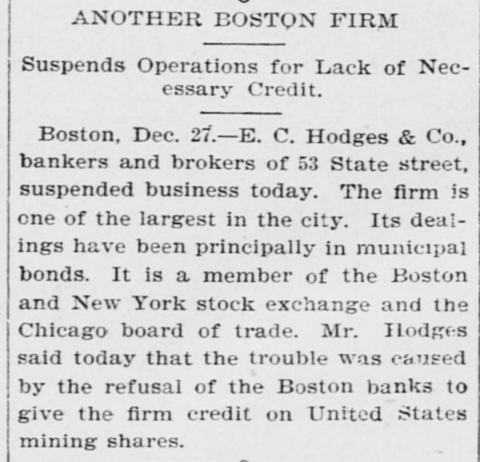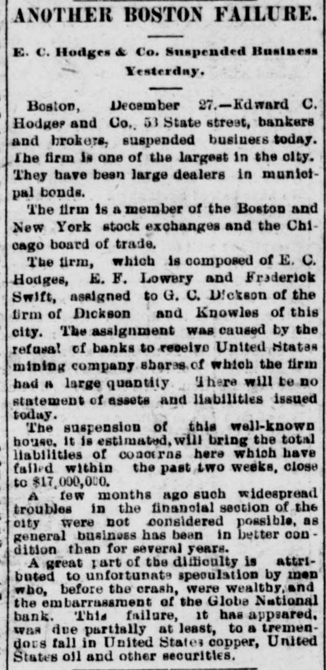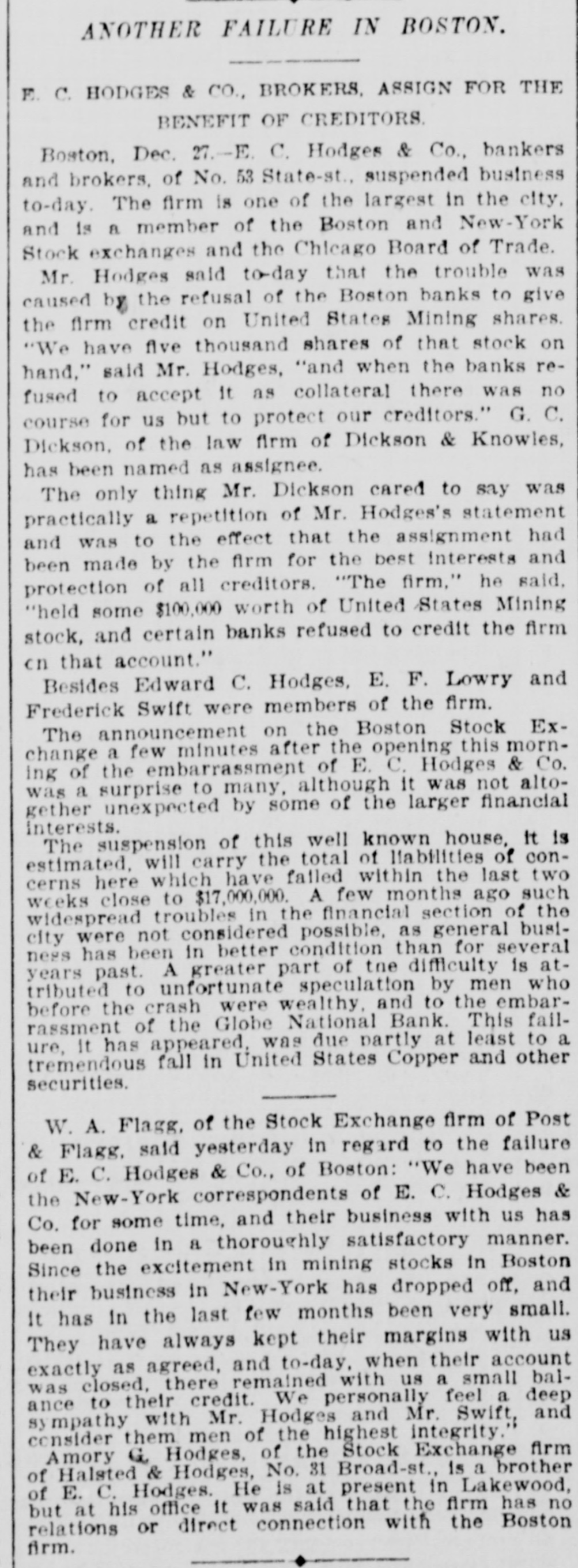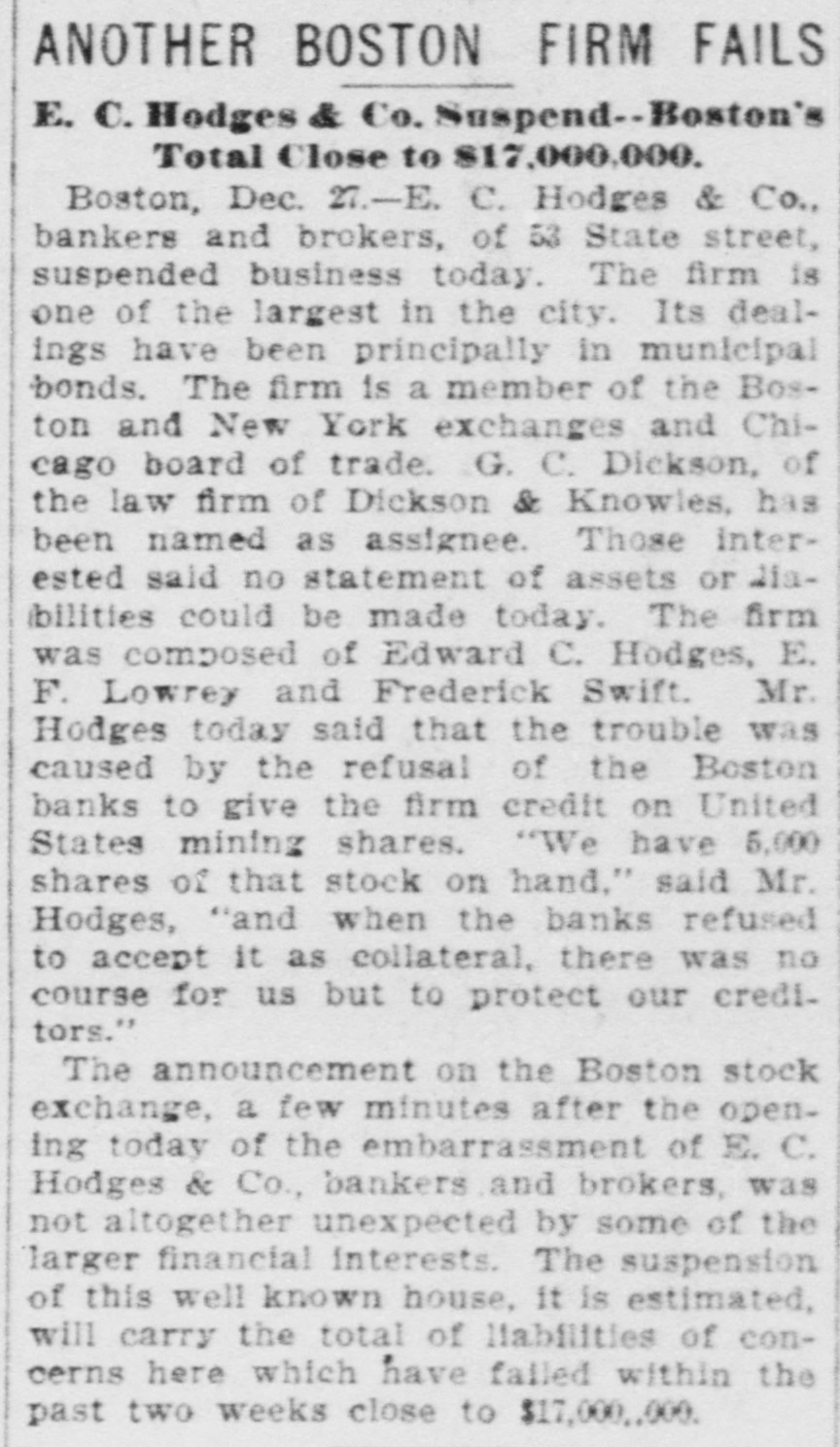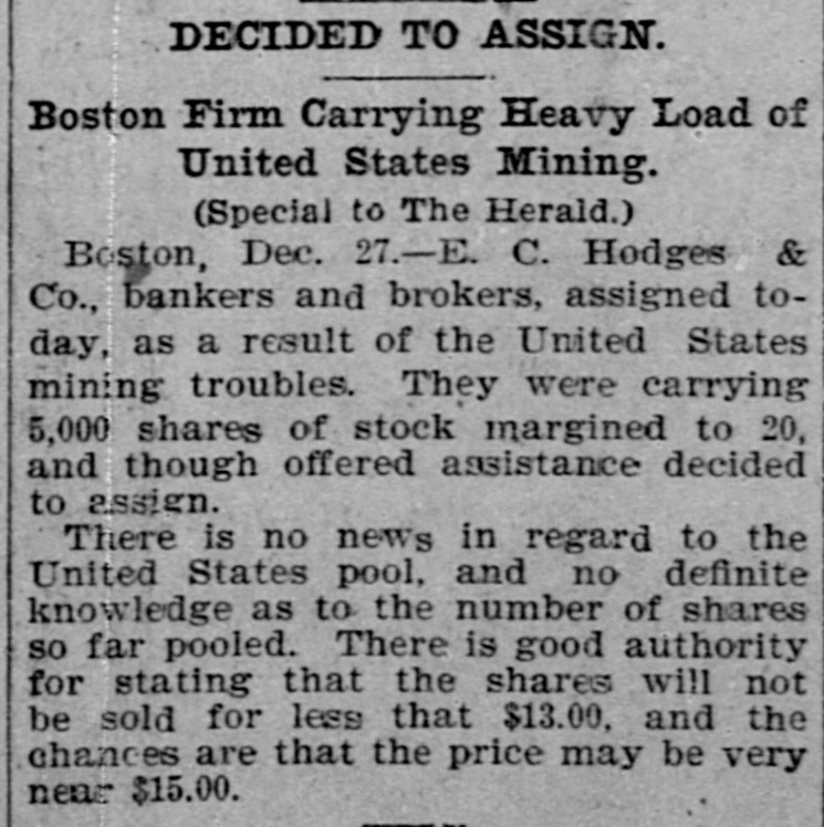 edit They Could Not Get On Mining Stoc. WAS LARGE BOSTON RM Shares in the United States Mining Company Had Been Margined Down to a Point Where No Money Could be Loaned on Them. Boston, Dec. 27.-E. C. Hodges & Co., bankers and brokers, suspended business today. The firm is one of the largest in the city. Its dealings have been principally in municipal bonds. It is a member of the Boston and New York stock exchanges and the Chicago board of trade. Hodges said today that the trouble was caused by the refusal of the Boston banks to give the firm credit on United States mining shares. The Boston News Bureau, in its issue of the 19th inst., save the United States mining situation as follows: "Now the problem is the sale of the United States Mining company, which is largely held by brokerage houses and Boston banks. Thousands of shares have been taken up and put in the boxes of brokers, and thousands of shares will remain in the banks with other collateral, but it is not so large a matter as it first looked. It is simply 174,000 shares of the United States Mining company's stock that was supposed to have had something of a legitimate market at $20 to $40 per share, but is now found to be in 27 brokerage accounts. "It has been margined down to below $20 per share, and if it is sold for Utah mining stock on any reasonable terms. there will not be any great skrinkage or loss ultimately, but if the bankers and brokers, as now agreed, all remain quiet, whatever loss there is will gradually readjust itself and be widely distributed. "With a full knowledge of the situation. all brokers' clearances went through on Monday when the stock clearings were three times what they will be today, as Monday's sheet has to be cleared for both Friday's and Saturday's transactions. There cannot be a million dollars loaned upon United States mining by all the banks in Boston. for there cannot be in Boston banks 100,000 shares, and what there is has been margined down for the most part to $12.50 per share." C