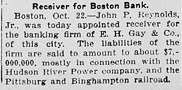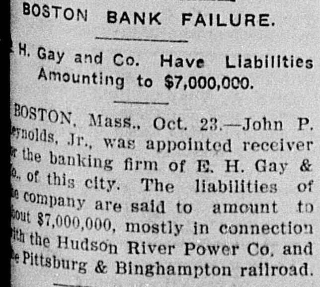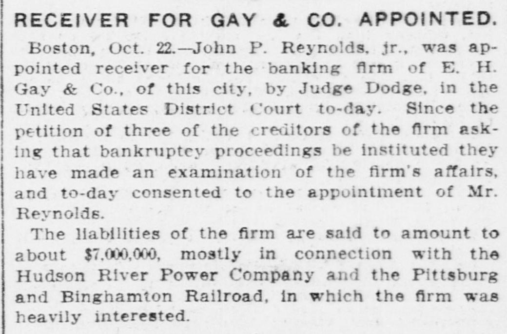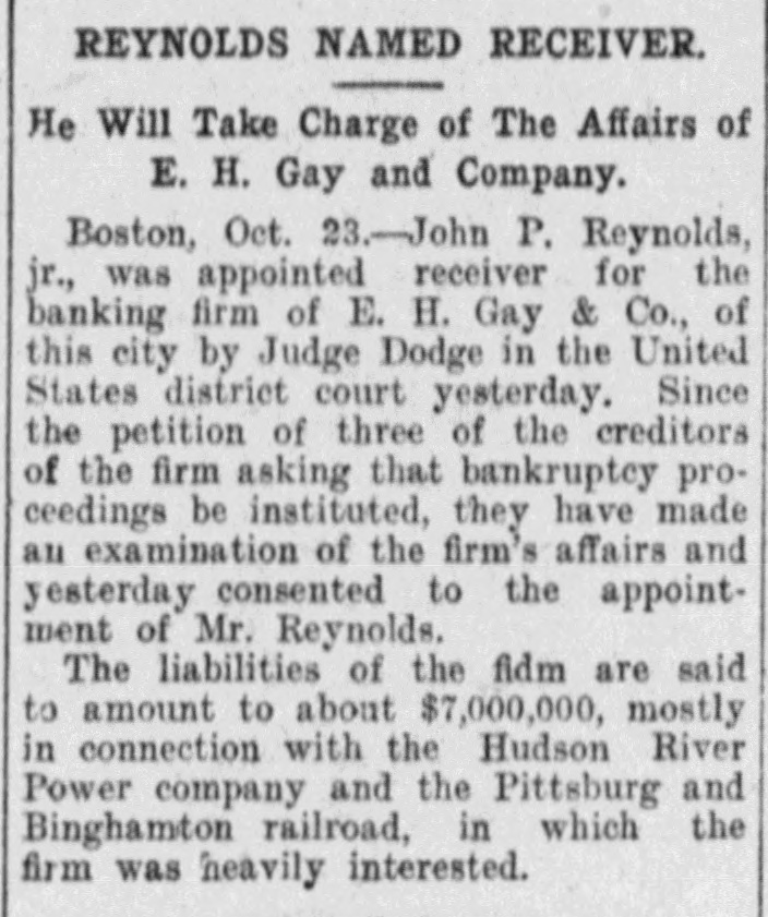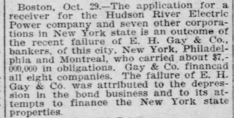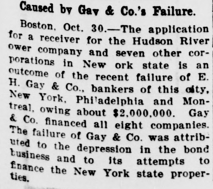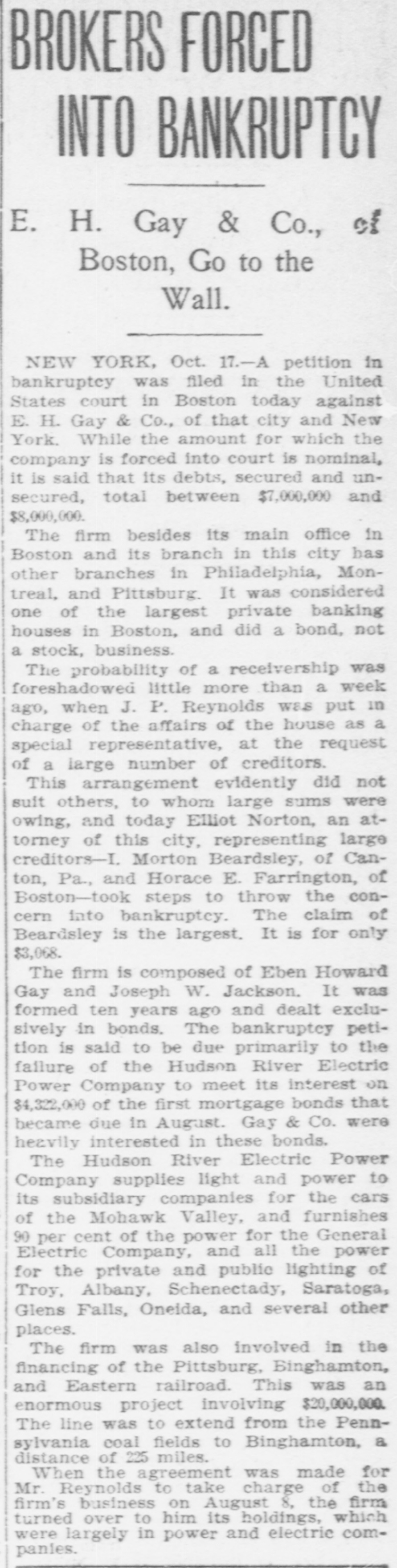 BROKERS FORCED INTO BANKRUPTCY E. H. Gay & Co., of Boston, Go to the Wall. NEW YORK, Oct. 17.-A petition in bankruptcy was filed in the United States court in Boston today against E. H. Gay & Co., of that city and New York. While the amount for which the company is forced into court is nominal, it is said that its debts, secured and unsecured, total between $7,000,000 and $8,000,000. The firm besides its main office in Boston and its branch in this city has other branches in Philadelphia, Montreal, and Pittsburg. It was considered one of the largest private banking houses in Boston, and did a bond, not a stock, business. The probability of a receivership was foreshadowed little more than a week ago, when J. P. Reynolds was put in charge of the affairs of the house as a special representative, at the request of a large number of creditors. This arrangement evidently did not suit others, to whom large sums were owing, and today Elliot Norton, an attorney of this city, representing large creditors-I. Morton Beardsley, of Canton, Pa., and Horace E. Farrington, of Boston-took steps to throw the concern into bankruptcy. The claim of Beardsley is the largest. It is for only $3,068. The firm is composed of Eben Howard Gay and Joseph W. Jackson. It was formed ten years ago and dealt exclusively in bonds. The bankruptcy petition is said to be due primarily to the failure of the Hudson River Electric Power Company to meet its interest on $4,322,000 of the first mortgage bonds that became due in August. Gay & Co. were heavily interested in these bonds. The Hudson River Electric Power Company supplies light and power to its subsidiary companies for the cars of the Mohawk Valley, and furnishes 90 per cent of the power for the General Electric Company, and all the power for the private and public lighting of Troy, Albany, Schenectady, Saratoga, Glens Falls, Oneida, and several other places. The firm was also involved in the financing of the Pittsburg, Binghamton, and Eastern railroad. This was an enormous project involving $20,000,000. The line was to extend from the Pennsylvania coal fields to Binghamton, a distance of 225 miles. When the agreement was made for Mr. Reynolds to take charge of the firm's business on August 8, the firm turned over to him its holdings, which were largely in power and electric companies.