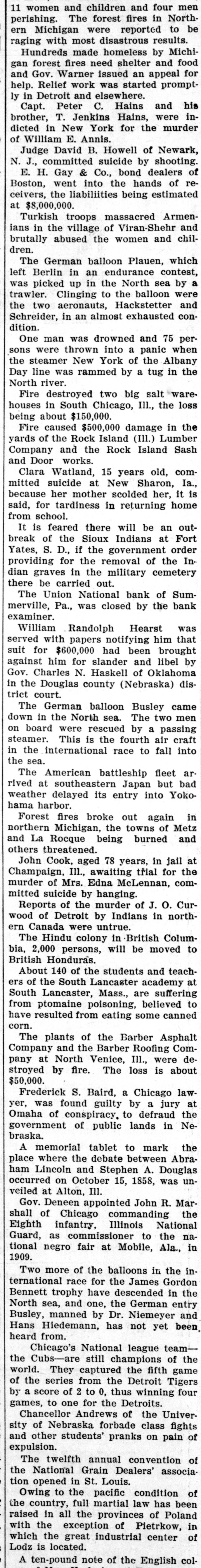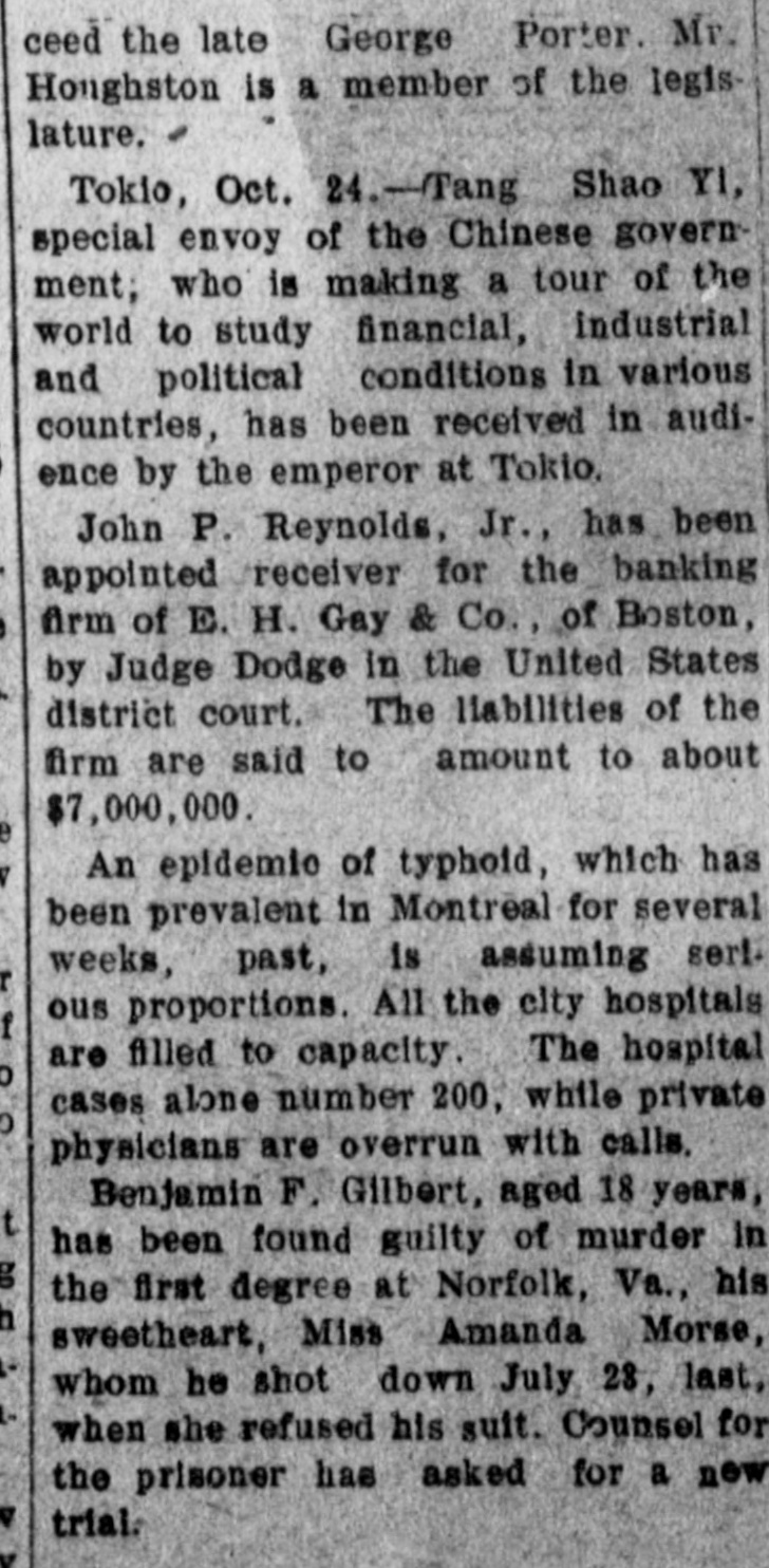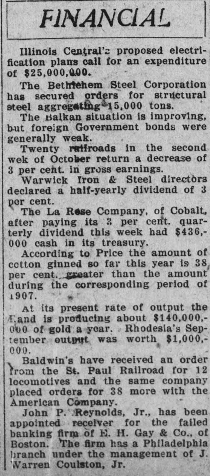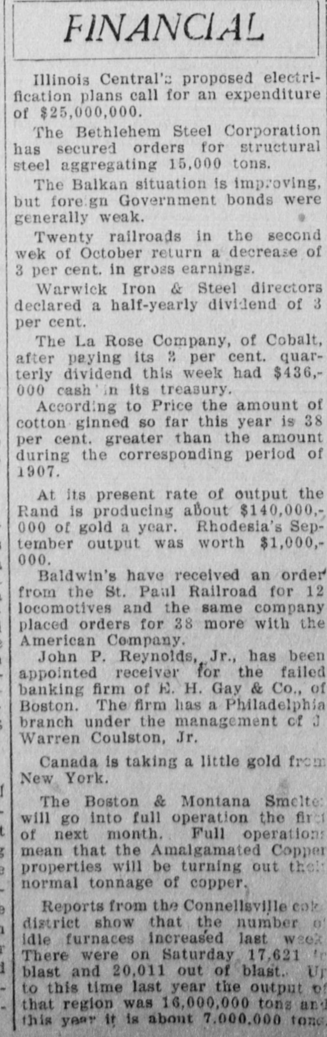 BROKERS FORCED INTO BANKRUPTCY E. H. Gay & Co., of Boston, Go to the Wall. NEW YORK, Oct. 17.-A petition in bankruptcy was filed in the United States court in Boston today against E. H. Gay & Co., of that city and New York. While the amount for which the company is forced into court is nominal, it is said that its debts, secured and unsecured, total between $7,000,000 and $8,000,000. The firm besides its main office in Boston and its branch in this city has other branches in Philadelphia, Montreal, and Pittsburg. It was considered one of the largest private banking houses in Boston, and did a bond, not a stock, business. The probability of a receivership was foreshadowed little more than a week ago, when J. P. Reynolds was put in charge of the affairs of the house as a special representative, at the request of a large number of creditors. This arrangement evidently did not suit others, to whom large sums were owing, and today Elliot Norton, an attorney of this city, representing large creditors-I. Morton Beardsley, of Canton, Pa., and Horace E. Farrington, of Boston-took steps to throw the concern into bankruptcy. The claim of Beardsley is the largest. It is for only $3,068. The firm is composed of Eben Howard Gay and Joseph W. Jackson. It was formed ten years ago and dealt exclusively in bonds. The bankruptcy petition is said to be due primarily to the failure of the Hudson River Electric Power Company to meet its interest on $4,322,000 of the first mortgage bonds that became due in August. Gay & Co. were heavily interested in these bonds. The Hudson River Electric Power Company supplies light and power to its subsidiary companies for the cars of the Mohawk Valley, and furnishes 90 per cent of the power for the General Electric Company, and all the power for the private and public lighting of Troy, Albany, Schenectady, Saratoga, Glens Falls, Oneida, and several other places. The firm was also involved in the financing of the Pittsburg, Binghamton, and Eastern railroad. This was an enormous project involving $20,000,000. The line was to extend from the Pennsylvania coal fields to Binghamton, a distance of 225 miles. When the agreement was made for Mr. Reynolds to take charge of the firm's business on August 8, the firm turned over to him its holdings, which were largely in power and electric companies.