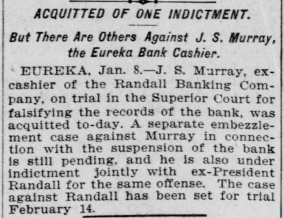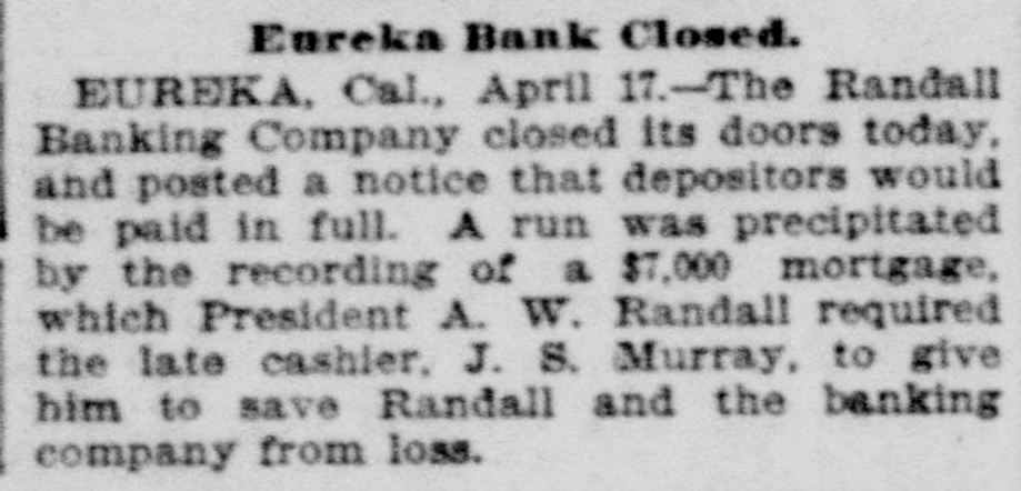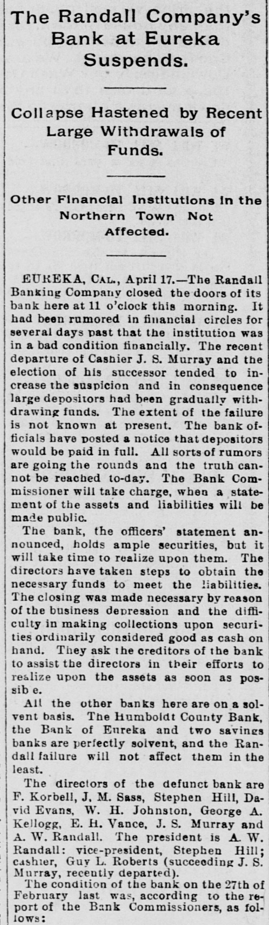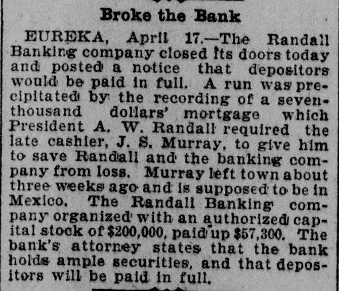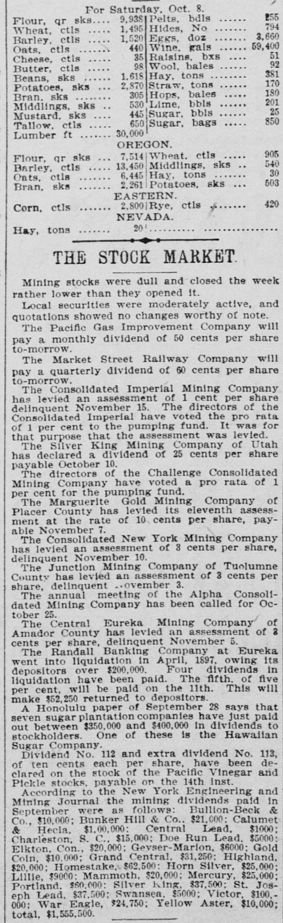 For Saturday. Oct. 8. 255 Pelts. bdls 9,938 Flour, qr sks 794 1,495 Hides, No Wheat, ctls 3,660 Eggs, doz 1,520 Barley, ctls 59,400 440 Wine, gals Oats, ctls 51 35 Raisins, bxs Cheese, ctis 92 98 Wool, bales Butter, ctls 381 1,618 Hay, tons Beans, sks 170 2,870 Straw, tons Potatoes, sks 180 305 Hops, bales Bran, sks 201 530 Lime, bbls Middlings, sks 25 445 Sugar, bbis Mustard. sks 850 650 Sugar, bags Tallow. ctls 30,000 Lumber ft OREGON. 905 Wheat, ctls 7,514 Flour, qr sks 540 Middlings, sks 13,450 Barley, ctls 30 6,445 Hay, tons Oats. ctls 503 2,261 Potatoes, sks Bran, sks EASTERN. 420 2,800|Rye, ctls Corn, ctls NEVADA. 20 Hay, tons THE STOCK MARKET Mining stocks were dull and closed the week rather lower than they opened it. Local securities were moderately active, and quotations showed no changes worthy of note. The Pacific Gas Improvement Company will pay a monthly dividend of 50 cents per share to-morrow. The Market Street Railway Company will pay a quarterly dividend of 60 cents per share to-morrow. The Consolidated Imperial Mining Company has levied an assessment of 1 cent per share delinquent November 15. The directors of the Consolidated Imperial have voted the pro rata of 1 per cent to the pumping fund. It was for that purpose that the assessment was levied. The Silver King Mining Company of Utah has declared a dividend of 25 cents per share payable October 10. The directors of the Challenge Consolidated Mining Company have voted a pro rata of 1 per cent for the pumping fund. The Marguerite Gold Mining Company of Placer County has levied its eleventh assessment at the rate of 10 cents per share, payable November 7. The Consolidated New York Mining Company has levied an assessment of 3 cents per share, delinquent November 10. The Junction Mining Company of Tuolumne County has levied an assessment of 3 cents per share, delinquent ovember 3. The annual meeting of the Alpha Consolidated Mining Company has been called for October 25. The Central Eureka Mining Company of Amador County has levied an assessment of 8 cents per share, delinquent November 5. The Randall Banking Company at Eureka went into liquidation in April, 1897, owing its depositors over $200,000. Four dividends in liquidation have been paid. The fifth. of five per cent, will be paid on the 11th. This will make $52,250 returned to depositors. A Honolulu paper of September 28 says that seven sugar plantation companies have just paid out between $350,000 and $400,000 in dividends to stockholders. One of these is the Hawaiian Sugar Company. Dividend No. 112 and extra dividend No. 113, of ten cents each per share, have been declared on the stock of the Pacific Vinegar and Pickle stocks, payable on the 14th inst. According to the New York Engineering and Mining Journal the mining dividends paid in September were as follows: Bullion-Beck & Co., $10,000; Bunker Hill & Co., $21,000; Calumet & Hecla, $1,00,000: Central Lead, $1000; Charleston, S. C., $15,000; Doe Run Lead. $5000: Elkton, Con., $20,000; Gevser-Marion, $6000; Gold Coin, $10,000; Grand Central. $31,250; Highland, $20,000; Homestake, $62,500: Horn Silver, $25,000; Lillie, $9000: Mammoth, $20,000; Mercury, $25,000; Portland, $60,000: Silver King, $37,500; St. Joseph Lead, $37,500; Swansea. $5000; Victor, $100.000: War Eagle, $24,750; Yellow Aster, $10,000; total, $1,555,500.