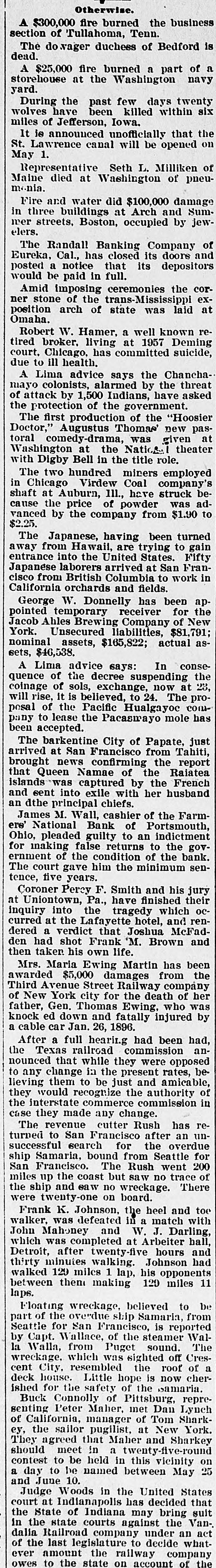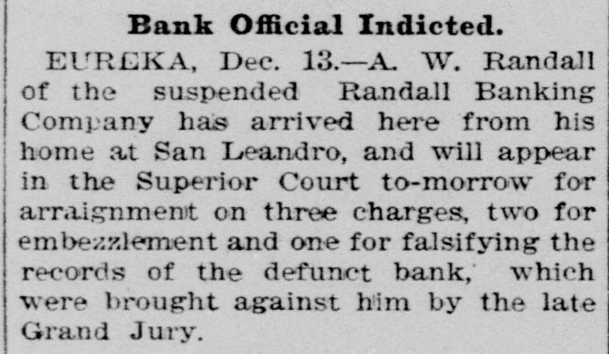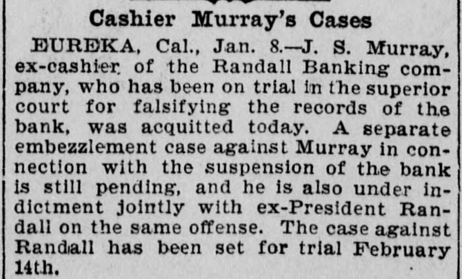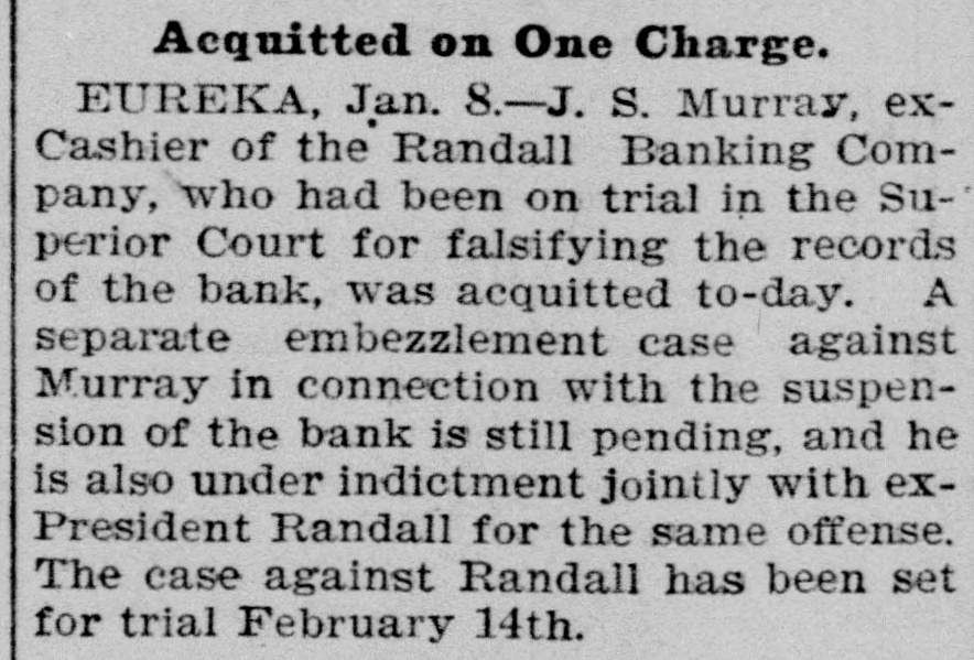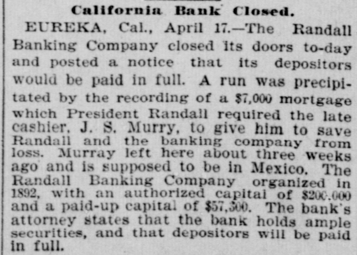For Saturday. Oct. 8. 255 Pelts. bdls 9,938 Flour, qr sks 794 1,495 Hides, No Wheat, ctls 3,660 Eggs, doz 1,520 Barley, ctls 59,400 440 Wine, gals Oats, ctls 51 35 Raisins, bxs Cheese, ctis 92 98 Wool, bales Butter, ctls 381 1,618 Hay, tons Beans, sks 170 2,870 Straw, tons Potatoes, sks 180 305 Hops, bales Bran, sks 201 530 Lime, bbls Middlings, sks 25 445 Sugar, bbis Mustard. sks 850 650 Sugar, bags Tallow. ctls 30,000 Lumber ft OREGON. 905 Wheat, ctls 7,514 Flour, qr sks 540 Middlings, sks 13,450 Barley, ctls 30 6,445 Hay, tons Oats. ctls 503 2,261 Potatoes, sks Bran, sks EASTERN. 420 2,800|Rye, ctls Corn, ctls NEVADA. 20 Hay, tons THE STOCK MARKET Mining stocks were dull and closed the week rather lower than they opened it. Local securities were moderately active, and quotations showed no changes worthy of note. The Pacific Gas Improvement Company will pay a monthly dividend of 50 cents per share to-morrow. The Market Street Railway Company will pay a quarterly dividend of 60 cents per share to-morrow. The Consolidated Imperial Mining Company has levied an assessment of 1 cent per share delinquent November 15. The directors of the Consolidated Imperial have voted the pro rata of 1 per cent to the pumping fund. It was for that purpose that the assessment was levied. The Silver King Mining Company of Utah has declared a dividend of 25 cents per share payable October 10. The directors of the Challenge Consolidated Mining Company have voted a pro rata of 1 per cent for the pumping fund. The Marguerite Gold Mining Company of Placer County has levied its eleventh assessment at the rate of 10 cents per share, payable November 7. The Consolidated New York Mining Company has levied an assessment of 3 cents per share, delinquent November 10. The Junction Mining Company of Tuolumne County has levied an assessment of 3 cents per share, delinquent ovember 3. The annual meeting of the Alpha Consolidated Mining Company has been called for October 25. The Central Eureka Mining Company of Amador County has levied an assessment of 8 cents per share, delinquent November 5. The Randall Banking Company at Eureka went into liquidation in April, 1897, owing its depositors over $200,000. Four dividends in liquidation have been paid. The fifth. of five per cent, will be paid on the 11th. This will make $52,250 returned to depositors. A Honolulu paper of September 28 says that seven sugar plantation companies have just paid out between $350,000 and $400,000 in dividends to stockholders. One of these is the Hawaiian Sugar Company. Dividend No. 112 and extra dividend No. 113, of ten cents each per share, have been declared on the stock of the Pacific Vinegar and Pickle stocks, payable on the 14th inst. According to the New York Engineering and Mining Journal the mining dividends paid in September were as follows: Bullion-Beck & Co., $10,000; Bunker Hill & Co., $21,000; Calumet & Hecla, $1,00,000: Central Lead, $1000; Charleston, S. C., $15,000; Doe Run Lead. $5000: Elkton, Con., $20,000; Gevser-Marion, $6000; Gold Coin, $10,000; Grand Central. $31,250; Highland, $20,000; Homestake, $62,500: Horn Silver, $25,000; Lillie, $9000: Mammoth, $20,000; Mercury, $25,000; Portland, $60,000: Silver King, $37,500; St. Joseph Lead, $37,500; Swansea. $5000; Victor, $100.000: War Eagle, $24,750; Yellow Aster, $10,000; total, $1,555,500.