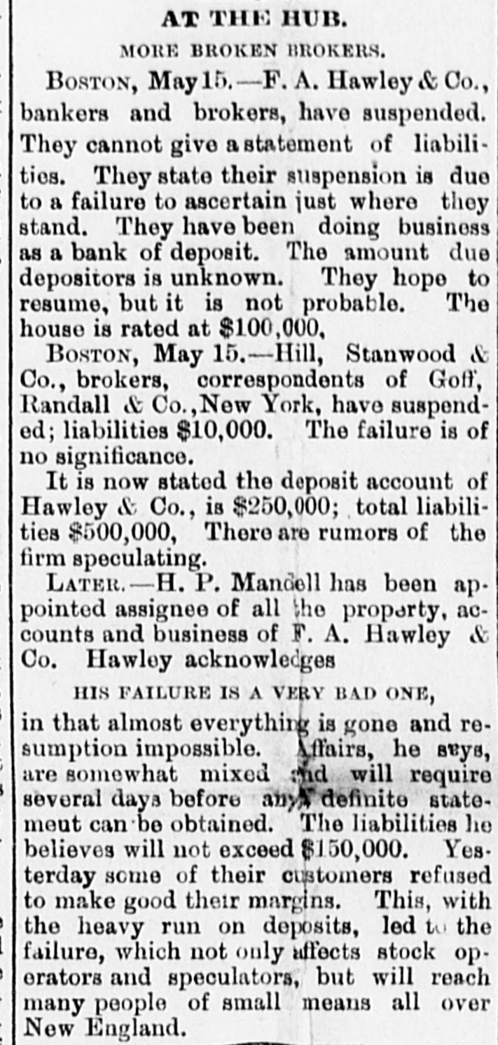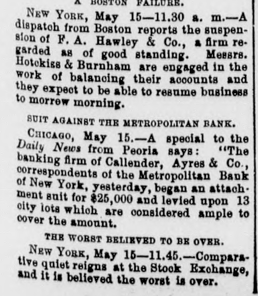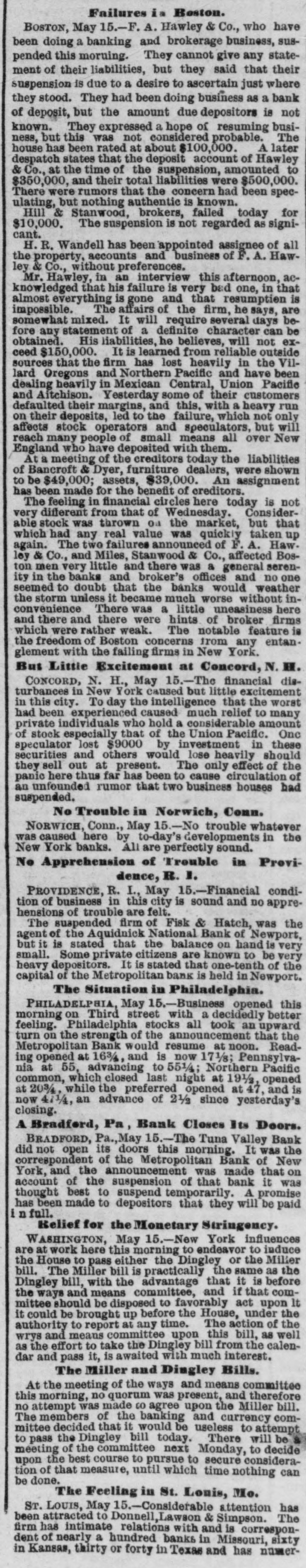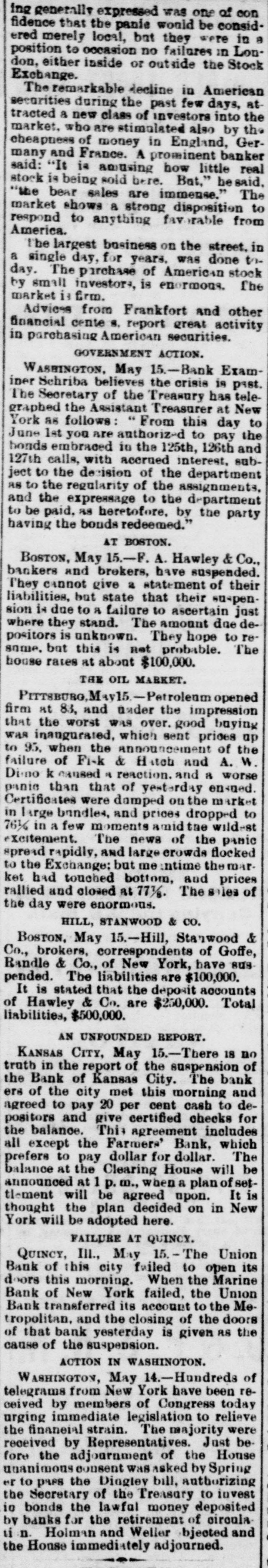 At the opening of the Produce Exchange prices fell off and wild rumors of failures were started. Subsequently the market regained what it had lost only to decline, however, on the announcement of further failures in Wall street. The closing was slightly lower than on Wednesday. There was talk at the Exchange of abolishing calls, as has already been done in Chicago. It was the general opinion that this would be done Immediately. THE COTTOCE EXCHANGE. At the Cotton Exchange the market opened firmer, prices being firmer than at Wednesday's close. There was little business done. When the news of thefailure of Fisk & Hatch reached the Exchange the market broke somewhat at the close, May had tallen off 12 points and June 4 points. Some of the others had fallen off one point and others none at all. There were no failures afeither exchange. BOSTON'S BREAKS. NEW YORK, May 15, 11:30 A. M.-A patch from Boston reports the supension of F.A. Hawley & Co., a firm which, although not heavy dealers, were regarded as of good standing. Messrs. Hotchkiss & Burnham are engaged in the work of balancing their accounts and expect to be able to resume business to-morrow morning. BOSTON, May 15, 2 PC M.-Hill, Stanwood & Co., brokers, and Boston correspondents of Goff, Randall & Co., of New York, have suspended. Their liabilities will probably not reach $10,000. The failure is not considered of any significance. It is now said that the deposit account of F. A. Hawley & Co., at the time of their suspension, amounted to $250,000, and that their total liabilities are $500,000- There are rumors that the firm has been speculating, but nothing authentic is yet known. HAWLEY & CO'S FAILURE. BOSTON, May 15, 11 P. M.-H. A. Mandell has been appointed assignee of all the property, accounts and business of F.A Hawley & Co., without preferences. Mr. Hawley, in an interview this afternoon, acknowledged that his failure is a very bad one in that almost everything is gone, and that resumption is impossible. He says that his affairs are somewhat mixed, and it will require several days before any statement of a definite character can be obtained. His liabilities, he believes, will not exceed $150,000. BRADFORD'S EXCITEMENT. BRADFORD, PA., May 15.-The Tuna Valley Bank did not open its doors this morning. It was the correspondent of the Metropolitan Bank of New York, and when the announcement was made of the suspension of that bank it was thought best to suspend temporarily. It is thought that the bank will resume in a few days. A promise has been made to the depositors that they will be paid in full. There was a run on other banks to-day, but all demands were met promptly and the excitement was over by noon. A QUINCY BANK CLOSES. CHICAGO, May 15. A Quincy, III., dispatch says: "The Union Bank of this city failed to open its doors this morning. When the Marine Bank of New York failed, the Union transferred its account to the Metropolitan, and the closing of that bank yesterday IS given as the cause for the suspension. BONDS NOT RUSHED IN FOR REDEMPTION. WASHINGTON, May 15.-Up to noon today but $10,000 of the $10,000,000 worth of bonds called by the Treasury on the 127th call had been presented for redemption. ENGLISH SPECULATORS NOT ALARMED. LONDON, May 15, 10 P. M.-An agent of the Associated Press called upon leading bankers having important American connections with a view to learning their opinions concerning the panic yesterday in Wall street. The feeling generally expressed was one of confidence that the panic should be considered merely a local occurrence. They were positive that it would occasion no failures in London, either inside or outside of the Stock Exchange. The general soundness of the financial situation here is evinced in the fact that there have not been rumors of large failures. The remarkable decline of American securities the last during few days has attracted a new class of investors into the market, who are stimulated also by the cheapness of money in England, Germany and France. One prominent banker said that it was amazing how little real stock was being sold here, but he said the bear sales were immense. The market shows a strong disposition to respond to anything favorable from America. The participation of bank officials in fraudulent schemes was censured. This one thing had done more than anything else to weaken public confidence. TRAVELERS IN ENGLAND ANXIOUS. LONDON, May 15, 7 P. M.-The failures in New York have caused great anxiety and excitement among the Americans residing here and having business connections or interests in the United States. The anxiety is particularly painful among travelers, and many of these have decided suddenly to terminate their trips and to return to America.
