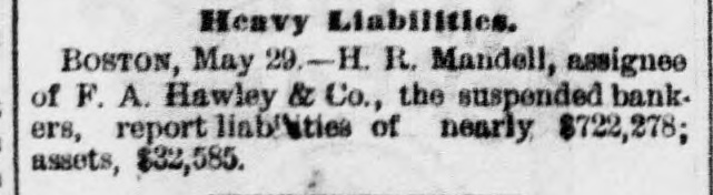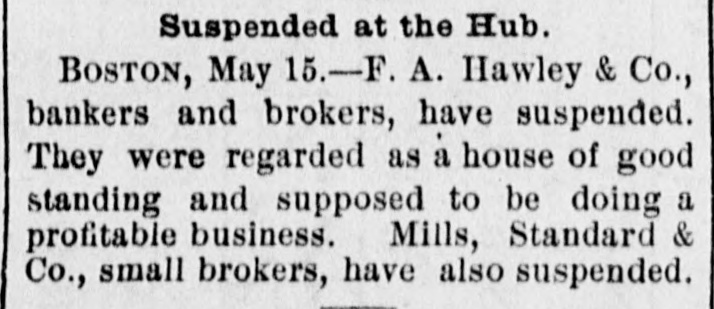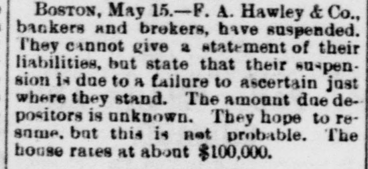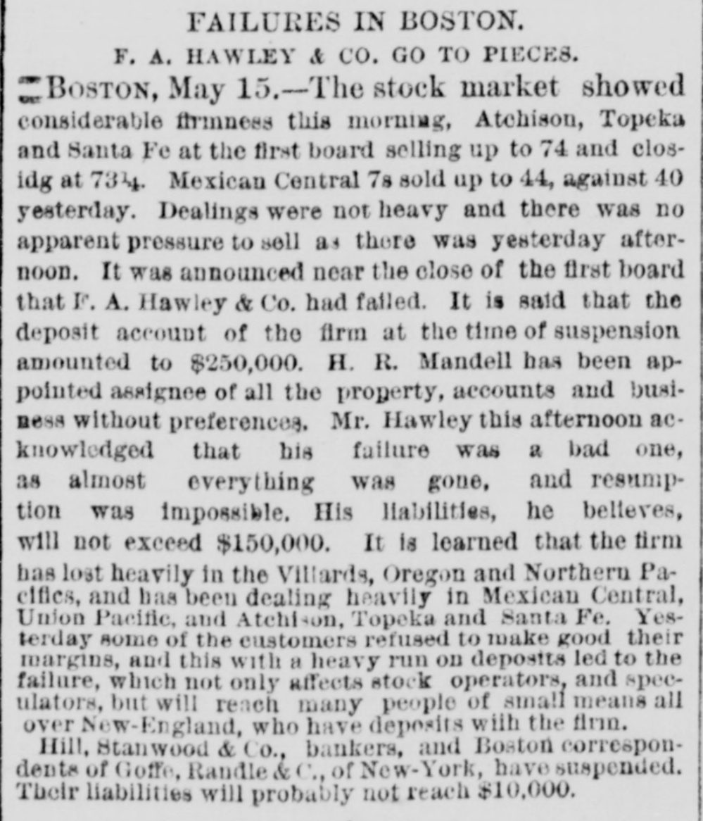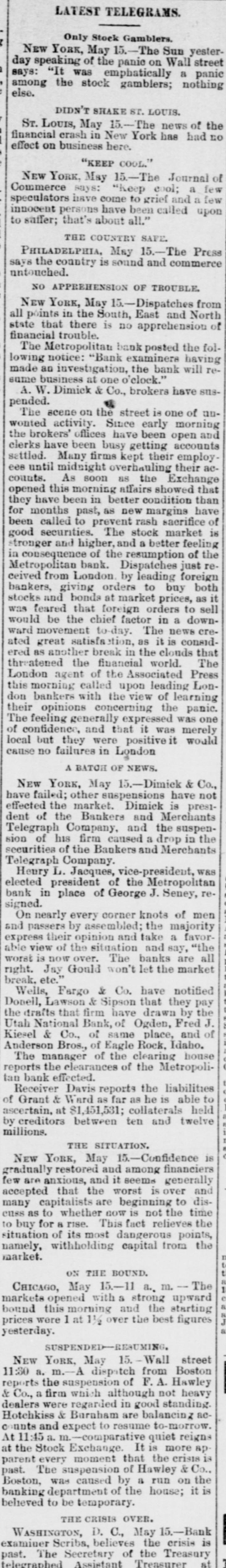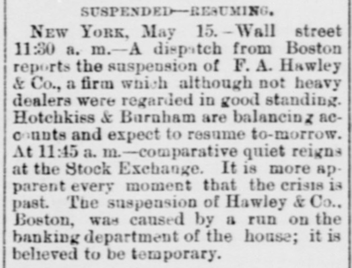 At the opening of the Produce Exchange prices fell off and wild rumors of failures were started. Subsequently the market regained what it had lost only to decline, however, on the announcement of further failures in Wall street. The closing was slightly lower than on Wednesday. There was talk at the Exchange of abolishing calls, as has already been done in Chicago. It was the general opinion that this would be done Immediately. THE COTTOCE EXCHANGE. At the Cotton Exchange the market opened firmer, prices being firmer than at Wednesday's close. There was little business done. When the news of thefailure of Fisk & Hatch reached the Exchange the market broke somewhat at the close, May had tallen off 12 points and June 4 points. Some of the others had fallen off one point and others none at all. There were no failures afeither exchange. BOSTON'S BREAKS. NEW YORK, May 15, 11:30 A. M.-A patch from Boston reports the supension of F.A. Hawley & Co., a firm which, although not heavy dealers, were regarded as of good standing. Messrs. Hotchkiss & Burnham are engaged in the work of balancing their accounts and expect to be able to resume business to-morrow morning. BOSTON, May 15, 2 PC M.-Hill, Stanwood & Co., brokers, and Boston correspondents of Goff, Randall & Co., of New York, have suspended. Their liabilities will probably not reach $10,000. The failure is not considered of any significance. It is now said that the deposit account of F. A. Hawley & Co., at the time of their suspension, amounted to $250,000, and that their total liabilities are $500,000- There are rumors that the firm has been speculating, but nothing authentic is yet known. HAWLEY & CO'S FAILURE. BOSTON, May 15, 11 P. M.-H. A. Mandell has been appointed assignee of all the property, accounts and business of F.A Hawley & Co., without preferences. Mr. Hawley, in an interview this afternoon, acknowledged that his failure is a very bad one in that almost everything is gone, and that resumption is impossible. He says that his affairs are somewhat mixed, and it will require several days before any statement of a definite character can be obtained. His liabilities, he believes, will not exceed $150,000. BRADFORD'S EXCITEMENT. BRADFORD, PA., May 15.-The Tuna Valley Bank did not open its doors this morning. It was the correspondent of the Metropolitan Bank of New York, and when the announcement was made of the suspension of that bank it was thought best to suspend temporarily. It is thought that the bank will resume in a few days. A promise has been made to the depositors that they will be paid in full. There was a run on other banks to-day, but all demands were met promptly and the excitement was over by noon. A QUINCY BANK CLOSES. CHICAGO, May 15. A Quincy, III., dispatch says: "The Union Bank of this city failed to open its doors this morning. When the Marine Bank of New York failed, the Union transferred its account to the Metropolitan, and the closing of that bank yesterday IS given as the cause for the suspension. BONDS NOT RUSHED IN FOR REDEMPTION. WASHINGTON, May 15.-Up to noon today but $10,000 of the $10,000,000 worth of bonds called by the Treasury on the 127th call had been presented for redemption. ENGLISH SPECULATORS NOT ALARMED. LONDON, May 15, 10 P. M.-An agent of the Associated Press called upon leading bankers having important American connections with a view to learning their opinions concerning the panic yesterday in Wall street. The feeling generally expressed was one of confidence that the panic should be considered merely a local occurrence. They were positive that it would occasion no failures in London, either inside or outside of the Stock Exchange. The general soundness of the financial situation here is evinced in the fact that there have not been rumors of large failures. The remarkable decline of American securities the last during few days has attracted a new class of investors into the market, who are stimulated also by the cheapness of money in England, Germany and France. One prominent banker said that it was amazing how little real stock was being sold here, but he said the bear sales were immense. The market shows a strong disposition to respond to anything favorable from America. The participation of bank officials in fraudulent schemes was censured. This one thing had done more than anything else to weaken public confidence. TRAVELERS IN ENGLAND ANXIOUS. LONDON, May 15, 7 P. M.-The failures in New York have caused great anxiety and excitement among the Americans residing here and having business connections or interests in the United States. The anxiety is particularly painful among travelers, and many of these have decided suddenly to terminate their trips and to return to America.