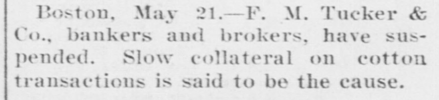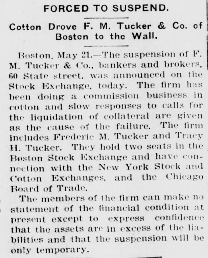 FORCED TO SUSPEND. Cotton Drove F. M. Tucker & Co. of Boston to the Wall. Boston. May 21.-The suspension of F. M. Tucker & Co., bankers and brokers, 60 State street. was announced on the Stock Exchange. today. The firm has been doing a commission business in cotton and slow responses to calls for the liquidation of collateral are given as the cause of the failure. The firm includes Frederic M. Tucker and Tracy H. Tucker. They hold two seats in the Boston Stock Exchange and have connection with the New York Stock and Cotton Exchanges, and the Chicago Board of Trade. The members of the firm can make no statement of the financial condition at present except to express confidence that the assets are in excess of the liabilities and that the suspension will be only temporary.