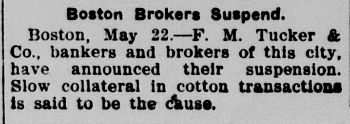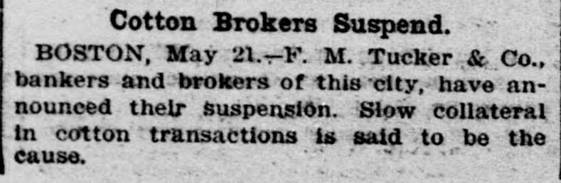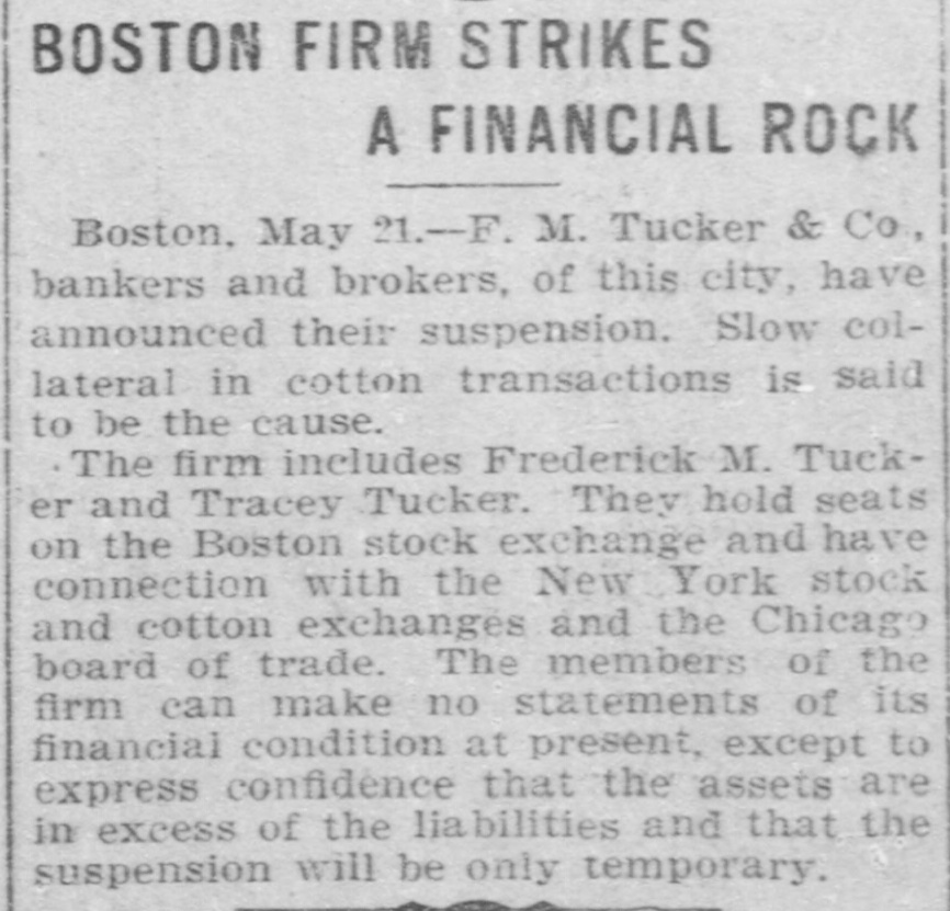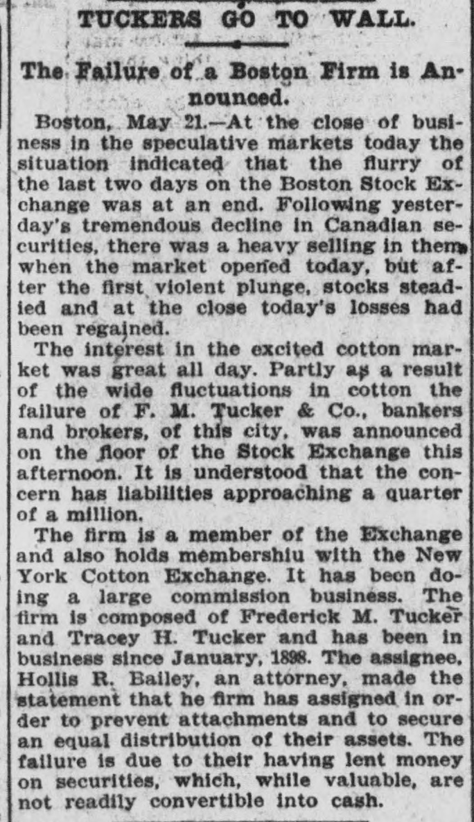 TUCKERS GO TO WALL. The Failure of a Boston Firm is Announced. Boston, May 21.-At the close of business in the speculative markets today the situation indicated that the flurry of the last two days on the Boston Stock Exchange was at an end. Following yesterday's tremendous decline in Canadian securities, there was a heavy selling in them when the market opened today, but after the first violent plunge, stocks steadied and at the close today's losses had been regained. The interest in the excited cotton market was great all day. Partly as a result of the wide fluctuations in cotton the failure of F. M. Tucker & Co., bankers and brokers, of this city, was announced on the floor of the Stock Exchange this afternoon. It is understood that the concern has liabilities approaching a quarter of a million. The firm is a member of the Exchange and also holds membershiu with the New York Cotton Exchange. It has been doing a large commission business. The firm is composed of Frederick M. Tucker and Tracey H. Tucker and has been in business since January, 1898. The assignee. Hollis R. Bailey, an attorney, made the statement that he firm has assigned in order to prevent attachments and to secure an equal distribution of their assets. The failure is due to their having lent money on securities, which, while valuable, are not readily convertible into cash.