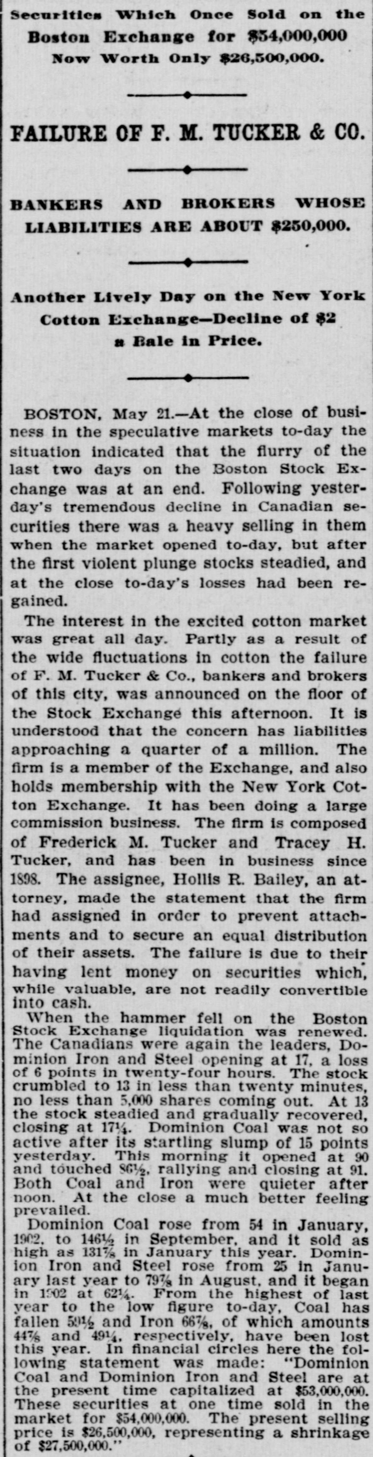 Their Failure Announced ou Floor Stock Exchange in the Hab-Liabilities of a Quarter of a Million-Large Dividend May be Paid-Wide Fluctuations in Cotton Caused the Trouble. Boston, May 21.-At the close of business in the speculative markets today the situation indicated that the flurry of the past two days on the Boston stock exchange was at an end. Following yesterday's tremendous decline in Canadian securities there was heavy selling in them when the market opened to-day, but after the first violent plunge, stocks steadied and at the close to-day's losses had been regained. The interest in the excited cotton market was great all day. Partly as a result of the wide fluctuation in cotton, the failure of F. M. Tucker & Co., bankers and brokers of 60 State street, this city, was announced on the floor of the stock exchange this afternoon. It is understood the concern has liabilities approaching a quarter of a million. The firm is a member of the exchange and also holds membership with the New York cotton exchange. It has been doing a large commission business, having devoted most of its attention to it. The firm is composed of Frederic M. Tucker and Tracey H. Tucker, and has been in business since January, 1398. The assignee, Hollis R. Bailey, a State street attorney, made the following statement to-night: "The firm of F. M. Tucker & Co., bankers and brokers at 60 State street, have assigned to Hollis R. Bailey of Cambridge, Mass., their attorney, in order to prevent attachments and secure an equal distribution of their assets. The failure is unexpected and is due to their having loaned money on securities which, while very valuable, are not readily convertible into cash. It is impossible to make any definite statement at present until the books have been examined, but it is believed that the assets will pay a large dividend and possibly may amount to enough to pay creditors in full. As is usual a Jarge amount of assets are pledged to various banking institutions as collateral for loans. The assignee expects to be able to make a careful report to the creditors at an early day. The total liabilities secured and unsecured amount to considerably over $200,000. (Signed) "Hollis R. Bailey." When the hammer fell on the Boston Stock Exchange at 10 o'clock liquidation was renewed. The Canadians were again the leaders, Dominion Iron & Steel opening at 17, a loss of 6 per cent. in twenty-four hours. The stock crumbled to 13 in less than twenty minutes, no less than 5,000 shares coming out. At 13, the stock steadied, and gradually recovered, closing at 17 1-4. Dominion Coal was not as active after its sensational clump of 15 points yesterday. This morning it opened here at 90 and touched 86 1-2, rallying and closing at 91. In the forenoon 1,250 shares changed hands. Both Coal and Iron were quieter after noon. At the close a much better feeling prevailed. Dominion Coal rose from 54 in January, 1902, to 146 1-2 in September, and it sold as high as 131 7-8 in January this year; Dominion Ore rose from 25 in January last year to 79 7-8 in August and it began in 1902 at 62 1-4. From highest of last year to the low figures to-day, Coal has fallen 59 1-2 and Iron 66 7-8, of which amounts 44 7-8 and 49 1-4 respectively have been lost this year. In financial circles here the following statement was made: "Dominion Coal and Dominion Iron & Steel are at present time capitalized for $53,000,000. These securities at one time sold in the market for $54,000,000. The present selling price is $26,500,000, representing a shrinkage of $27,500,000."