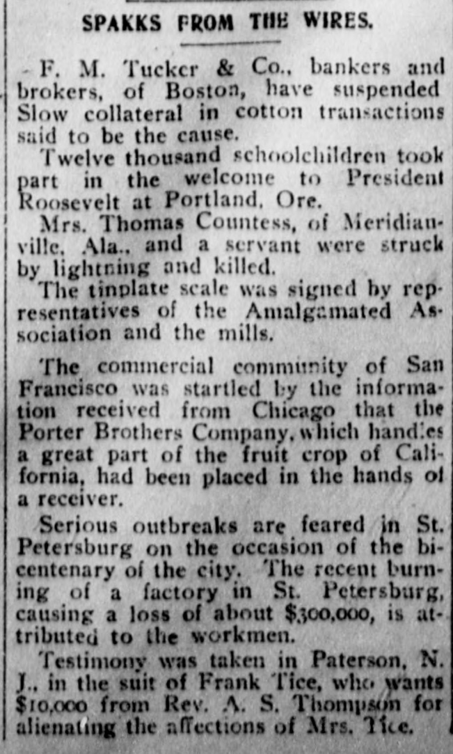 SPAKKS FROM THE WIRES. F. M. Tucker & Co., bankers and brokers, of Boston, have suspended Slow collateral in cotton transactions said to be the cause. Twelve thousand schoolchildren took part in the welcome to President Roosevelt at Portland, Ore. Mrs. Thomas Countess, of Meridianville. Ala., and a servant were struck by lightning and killed. The tinplate scale was signed by representatives of the Amalgamated Association and the mills. The commercial community of San Francisco was startled by the information received from Chicago that the Porter Brothers Company, which handles a great part of the fruit crop of California, had been placed in the hands of a receiver. Serious outbreaks are feared in St. Petersburg on the occasion of the bicentenary of the city. The recent burning of a factory in St. Petersburg, causing a loss of about $300,000, is attributed to the workmen. Testimony was taken in Paterson, N. J., in the suit of Frank Tice, who wants $10,000 from Rev. A. S. Thompson for alienating the affections of Mrs. Tice.