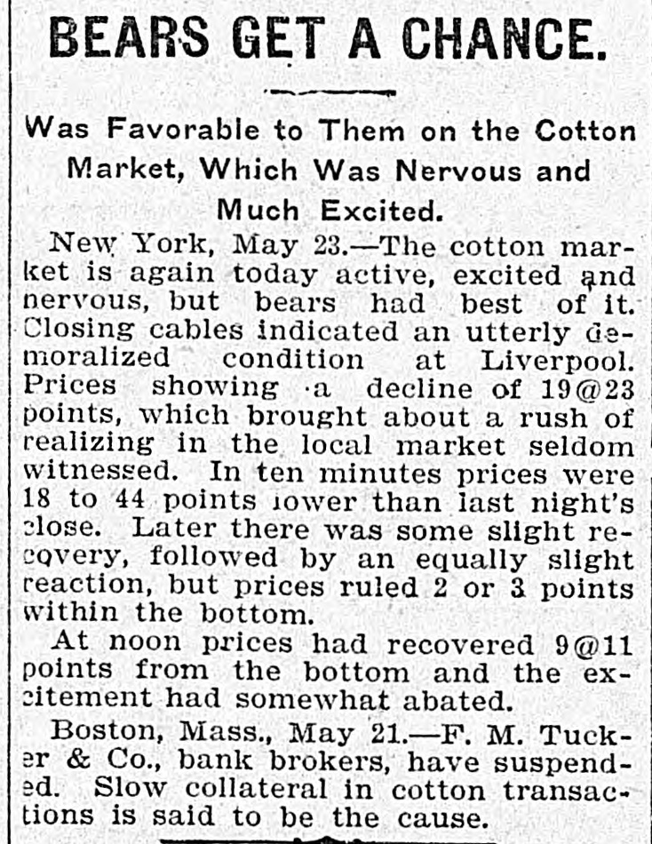 BEARS GET A CHANCE. Was Favorable to Them on the Cotton Market, Which Was Nervous and Much Excited. New York, May 23.-The cotton market is again today active, excited and nervous, but bears had best of it. Closing cables indicated an utterly demoralized condition at Liverpool. Prices showing a decline of 19@23 points, which brought about a rush of realizing in the local market seldom witnessed. In ten minutes prices were 18 to 44 points lower than last night's close. Later there was some slight recovery, followed by an equally slight reaction, but prices ruled 2 or 3 points within the bottom. At noon prices had recovered 9@11 points from the bottom and the excitement had somewhat abated. Boston, Mass., May 21.-F. M. Tucker & Co., bank brokers, have suspended. Slow collateral in cotton transactions is said to be the cause.