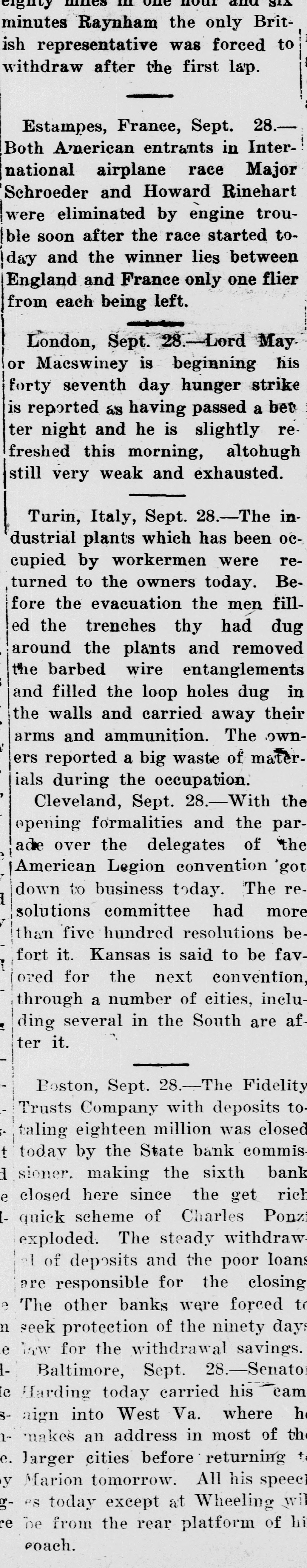eignty mires III one nour and SIX minutes Raynham the only British representative was forced to withdraw after the first lap. Estampes, France, Sept. 28.Both American entrants in International airplane race Major Schroeder and Howard Rinehart were eliminated by engine trouble soon after the race started today and the winner lies between England and France only one flier from each being left. 1 London, Sept. 28.-Lord May or Macswiney is beginning his forty seventh day hunger strike is reported as having passed a bet ter night and he is slightly refreshed this morning, altohugh still very weak and exhausted. Turin, Italy, Sept. 28.-The industrial plants which has been OCcupied by workermen were returned to the owners today. Before the evacuation the men filled the trenches thy had dug around the plants and removed the barbed wire entanglements and filled the loop holes dug in the walls and carried away their arms and ammunition. The own, ers reported a big waste of materials during the occupation. Cleveland, Sept. 28.-With the opening formalities and the parade over the delegates of the , American Legion convention 'got down to business today. The resolutions committee had more than five hundred resolutions befort it. Kansas is said to be favI ored for the next convention, through a number of cities, inclu. ding several in the South are after it. Boston, Sept. 28.-The Fidelity Trusts Company with deposits totaling eighteen million was closed t today by the State bank commis d sioner. making the sixth bank e closed here since the get rich [- quick scheme of Charles Ponz exploded. The steady withdrawel of deposits and the poor loans are responsible for the closing e The other banks were forced to n seek protection of the ninety days le law for the withdrawal savings. 1- Baltimore, Sept. 28.-Senator ic Harding today carried his cam S- aign into West Va. where h - makes an address in most of th e. Jarger cities before returning t y Marion tomorrow. All his speec g- es today except at Wheeling wil re he from the rear platform of hi eoach.