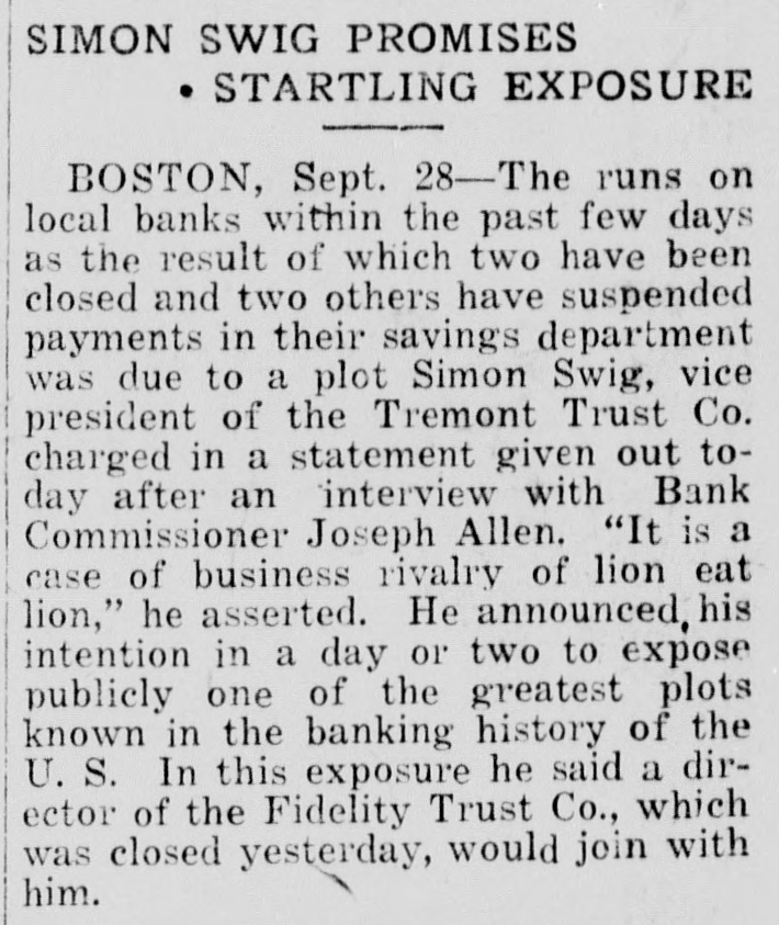 SIMON SWIG PROMISES STARTLING EXPOSURE BOSTON, Sept. 28-The runs on local banks within the past few days as the result of which two have been closed and two others have suspended payments in their savings department was due to a plot Simon Swig, vice president of the Tremont Trust Co. charged in a statement given out today after an interview with Bank Commissioner Joseph Allen. "It is a case of business rivalry of lion eat lion," he asserted. He announced, his intention in a day or two to expose publicly one of the greatest plots known in the banking history of the U. S. In this exposure he said a director of the Fidelity Trust Co., which was closed yesterday, would join with him.