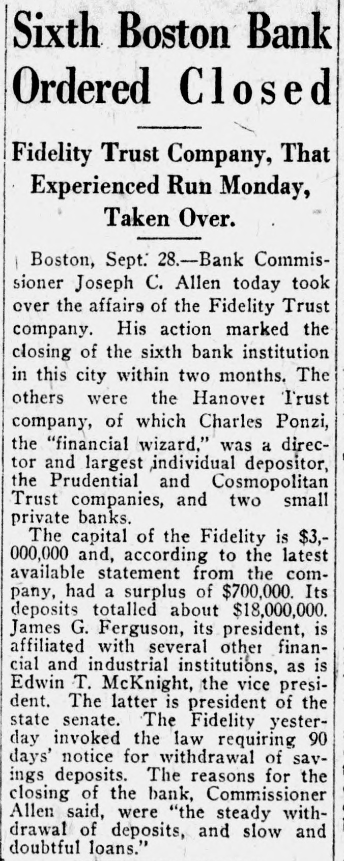 Sixth Boston Bank Ordered Closed Fidelity Trust Company, That Experienced Run Monday, Taken Over. Boston, Sept. 28.-Bank Commissioner Joseph C. Allen today took over the affairs of the Fidelity Trust company. His action marked the closing of the sixth bank institution in this city within two months. The others were the Hanover Trust company, of which Charles Ponzi, the "financial wizard." was a director and largest individual depositor, the Prudential and Cosmopolitan Trust companies, and two small private banks. The capital of the Fidelity is $3,000,000 and, according to the latest available statement from the company, had a surplus of $700,000. Its deposits totalled about $18,000,000. James G. Ferguson, its president, is affiliated with several other financial and industrial institutions, as is Edwin T. McKnight, the vice president. The latter is president of the state senate. The Fidelity yesterday invoked the law requiring 90 days' notice for withdrawal of savings deposits. The reasons for the closing of the bank, Commissioner Allen said, were "the steady withdrawal of deposits, and slow and doubtful loans."
