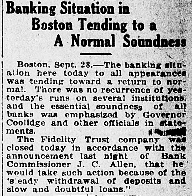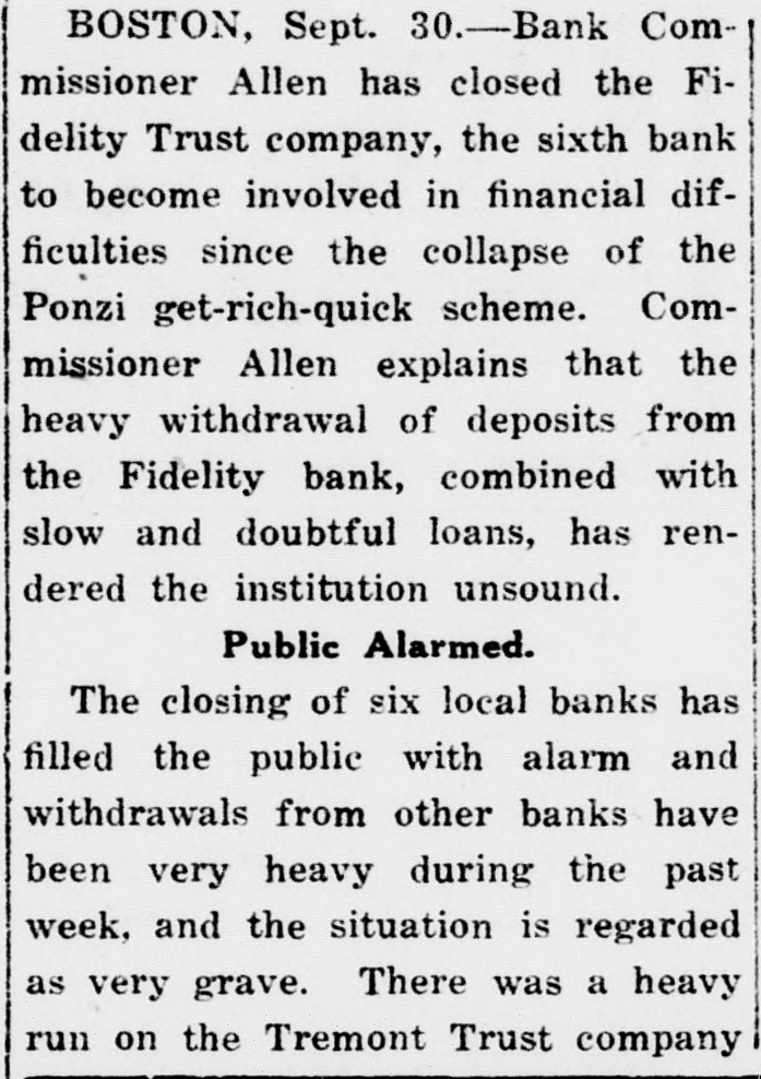 Tremont Trust and Fidelity Trust Invoke 90 Days' Notice for Withdrawal BIG RUNS STARTED THIS MORNING Ponzi Crash Clearly Reflected In Temporary Closing of Five Boston Institutions - None of Them Members of Federal Reserve System. BOSTON, Sept. 27.-Several hundred persons had gathered outside the offices of the Tremont Trust Co. when the doors were opened at 8.45 a. m., 15 minutes before the usual hour and lines quickly formed before the several paying tellers' windows. After withdrawal had been going on steadily for nearly an hour with the crowd const ntly increasing the bank officials annoanced that the law permitting a bank to require 90 days' notice for withdrawal from the savings department would be invoked forthwith "for the protection of the depositors. The regulation would be withdrawn "as soon as the public calmed itself' it was announced. "We have plenty of money to pay everybody, officials said, "and were prepared to do SO this morning, but the crowd became SO large that it was impossible to handle them and we invoked the law for the protection of the depositors, not for our own protection." Upon opening for business today the Fidelity Trust Co. served notice on depositors that it would take advantage of the law permitting them to require 90 days notice of withdrawal from the savings department. It was stated at the bank that this was done upon the direction of the bank commissioner. At the office of the latter it was said that the taking of this action was optional with the bank. The run on the Tremont Trust Co. was participated in by hundreds and the proportions of the crowd became 80 great that police were called to keep the crowd in order The bank tried for an hour to meet the claims against it and officials announced there was money on hand to pay all, but the crush became so great that Vice President Simon Swig announced that the 90-day notice would be required. At the Fidelity Trust Co. which also has offices in the downtown district the run was in smaller volume but the law I was called upon, it was stated, "to al low the public to recover from the prevailing unrest. There has been a run on the Dorchester Trust Co. for several days and the invocation of the law stopped it. f The virtual suspension of payment temporarily by the savings deposits of these three banks follows the closing of five banking institutions in this city within the past two months by Bank Commissioner Allen. In no case was e the bank a member of the federal reserve system. State officials say that the Ponzi crash i was clearly reflected in the troubles of the several banks which had been under r a run by depositors. In each case, ex cept that of the Hanover Trust and the small affiliated private banks, it has been 1 indicated that the banks were solvent but lacked ready cash to meet the de mands of alarmed depositors. At at three of the banks which suspended pay ments in their savings deposits it was an nounced that business in the commercial a departments would continue as usual. Governor Coolidge conferred with State Treasurer James Jackson and e Bank Commissioner Allen regarding the a only banking situation today. The it statement issued at the conclusion of the IS conference was by the governor, who said: "Some time ago I advised all bis banks in Boston that plans should be worked out through which there would gs ed be co-operation among all the banks. clearing house committee is now working he out details of such a plan."