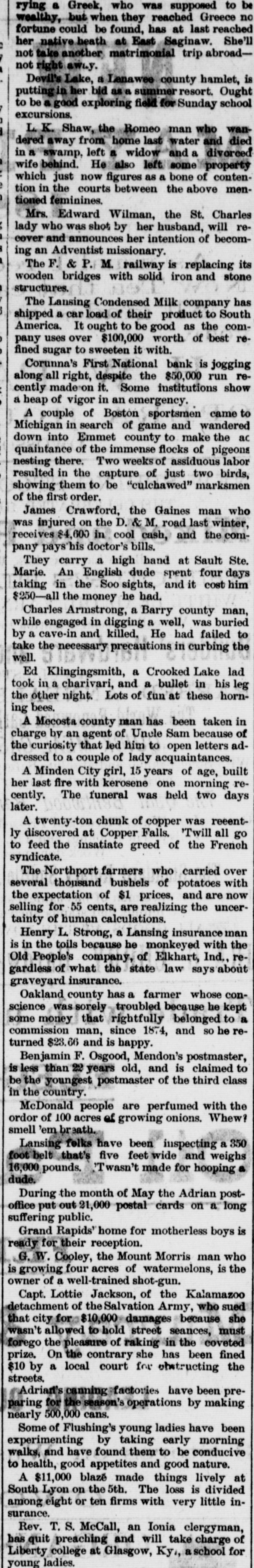 WOLVERINE WHISPERINGS. druggist Dr. T. liquor D. Quinn, the Muskegon in violation the convicted state liquor of selling law, will appeal. have just of the Michigan dischargecontral farmer's Five or six on old the conductors Mackinac railroad. division wife of Mrs. Robert was Peterson, kicked and was trampled on milking by a received die. Thomastown vicious cow which she internal injuries Mrs. Peterson will probably from which she wanted at Buffalo was to an- arJohn Connelly, of grand and larceny, locked up to swer rested a in charge East requisition Saginaw from the governor. await a is 26 years of age. Lake county Connelly Slade, sent from house of correction par10, months for enciente. for April Gertie three to the she Detroit is larceny, has been lost in because became doned Wehner's little Hope son and died from road the Frank woods near His Port body was found in a at exhaustion nine miles from home. been sentenced about Joseph Porteous years has in the state prison and Au- for Saginaw to assaulting five years little girl, old, to nine Chicago gustus criminally imprisonment Abeling, 18 for like charge. have been months' Callaghan & Co. for of printing from the June 1 supreme given reports the contract for eight years of wheat aday by ground court Eighteen hundred the Standard bushels roller mills at of a wheels are Holland. Malloy fell under branch the of the MichiPat on the Gladwin instantly killed. Central lumber on hand, crain gan stated and in was the little dry centers stock that to It is remarkably goes the sales there and is 80 far as small the green lots, with once in gun are while confined a small cargo sale. the Flint the man banks whose of river Flint April Charles and hat Moisley, were 6, found is believed upon to be in into the broken Canada. other The night postoffice and all at Caro the stolen. letters was The in the safe general and delivery department not molested. sendraw were has been stamp Coilins of Cadillac, the state house of Cham- cortenced Tim to 90 for threater days in that to place. kill L. De who arrested rection a merchant of William Parker, charge from plin, W R Smith. at East alias Saginaw William on Kelley a at Circum: evidence of Cadillac, was stealing has 8800 pleaded against not him guilty is considered the stantial strong E. C. 90 days Butler in the of house Cadillac, of correction will spend Grand for whipping next his wife. a Chicago & killed at George brakeman, Beattie, was other instantly morning; and His Mishawaka, Trunk fastened Ind., the in the guard rail, foot became over by the train. service weekly he was Michigan run weather ending June states crops that but bulletin for the weather has been favorThe effect of week past week on all rapid and corn the during the growth has rains been of the 27th had able encouraging. and the The an unfavorable heavy effect on the East and newly 28th planted corn. post G. A. R. of of the intimates one of the Saginaw Morgan well L. Gage as that the late it has youngest unpleasant one eighty men oldest participated as in One is in his years old. says years ness who third year upon and its he the roll. carried other a is sword 37 when 12 solThe latter old. is talking about erecting a Soldiers' 24. diers' Decatur monument. and sailors' reunion at Allegan the Aug. 21, 22, 23, Chandler, and a graduate of the univer- of Coldwater Miss Anna high pointed school Ruperintendent of sity, has been in Marquette. wheat public schools schooner Maggie tow McCool, of the steam- Ste. laden The for Kingston, was sunk in near ice Sault field. The was vessel valued Marie barge Bruno, by running at into $10,000; an the cargo at seriwas $20,000. Crawford of Flint, G. H. & who M. train $4,500 near by company, James injured by a D., has been paid bills were Gaines ously last winter, and all of his doctor's in Sand's the paid. Davidson, an employe county, was inWilliam in Crawford log. lumber camp by a falling at Hargrave, stantly killed girls employed mill in Bay City, 75 Thirty & two Co.' shingle of wages from was in Haven for an increase The increase girls. cents struck to 81 The e per employment day. shingles of an the innovation granted. emanufacture of proved successful. the has thus far mining and smelting Rapthat The Freeman been silver organized of at Grand which $75,company with has capital of do $100,000, general silver Mexico. mining is 000 is at San Jose, for business business ids, company paid in, is to organized of Chihuahua Grand Rapids years and have The made up mainly Rapids Friendless men. boys with of a Grand home E. through P. Fuller. the been provided (and cash) of Mrs. Paris township, uskindness A girl named was Ruby burned of to death by Huron county, to kindle a fire. planing ing kerosene in David Lyon's the other ing. at The several fish The South boiler Haven building exploded was houses completely near by. wrecked, For well as was killed. of tunately as no one son of Charlie out Chovin sailing Frank Chovin, Arenac county, sized was boat on nearly Sagwith Saganin, his father when in a a large gale throwing came up, the boy capsizing inaw bay the Before boat and the the father last could time. reach The overboard. he had sunk the next day. State Gleason's Deep the his body son was recovered store and postoffice River, was at burcash Road d crossing the other near night about All $30 of worth goods of stamps the store. glarized In the were postoffice taken, and and a quantity of firm of insurance arfrom Henry L. Strong at of Lapeer, the has prohibiting been Strong & Weston violation of companies the law from act- takrested for insurance The firm were company graveyard ing risks agent in this for state The the Old arrest People's of Mr. Strong's the bath of ing Elkhart. as will Ind. follow. Port Huron took partner W. E. Bancroft of of mails June 4. resumed of The as First superintendent business National after bank a temporary of Corunna sus- has the meeting 22-25. pension. anivation The second army annual w