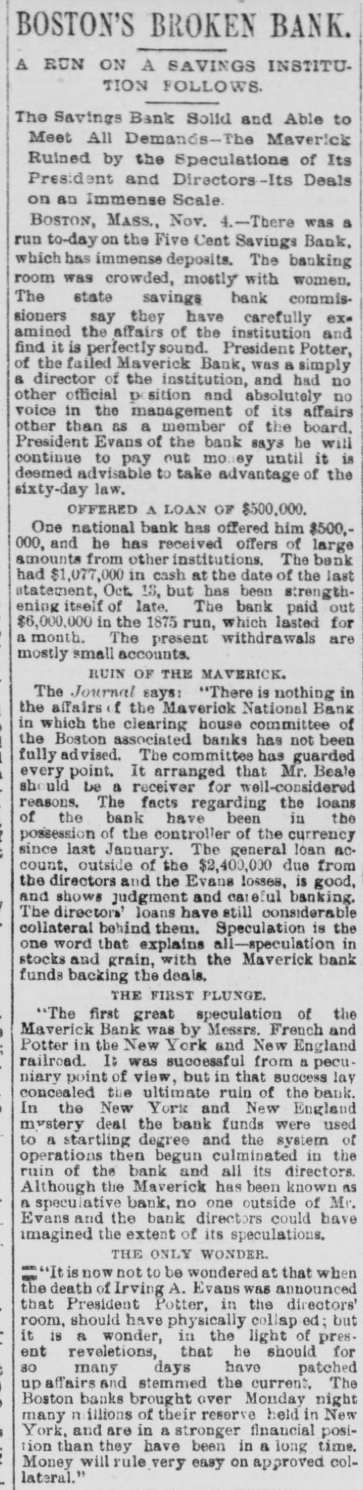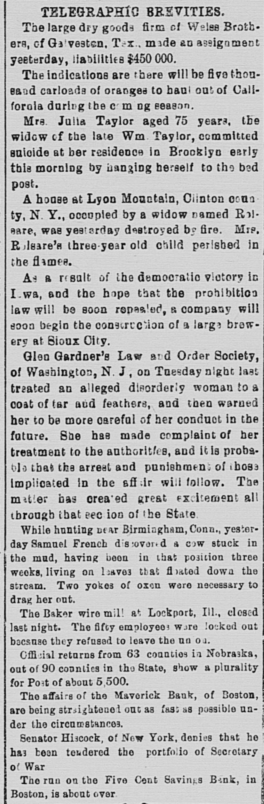 TELEGRAPHIC BREVITIES. The large dry goods firm of Welss Brothers, of Galvesten. Tex., made an assignment yesterday, liabilities $450 000. The indications are there will be ethousand carloads of oranges to haul out of Callforoia during the com ng season. Mrs. Julia Taylor aged 75 years, the widow of the late Wm. Taylor, committed suicide at ber residence in Brooklyn early this morning by hanging herself to the bed post. A house at Lyon Mountain, Olinton coun ty, N. Y., occupied by a widow named Roleare, was yesterday destroyed by fire. Mrs. Rolsare's three-year old child perished in the flames. As B result of the democratic victory in I.wa, and the hope that the prohibition law will be soon repeated, & company will soon begin the construction of a large brewery at Sioux City. Glen Gardner's Law and Order Society, of Washington, N.J, on Tuesday night last treated an alleged disorderly woman to a coat of tar and feathers, and then warned her to be more careful of her conduct in the future. She has made complaint of her treatment to the authorit/es, and it is probablo that the arrest and punishment of those implicated In the aff:ir will follow. The matter has created great excitement all through that 860 ion of the State While hunting near Birmingham, Conn., yesterday Samuel French discovered 8 cow stuck in the mud, having been in that position three weeks, living on leaves that floated down the stream. Two yokes of oxen were necessary to drag her out. The Baker wire mil! at Lockport, Ill., closed last night. The fifty employees were locked out because they refused to leave the un ou. Official returns from 63 counties in Nebraska, out of 90 counties in the State, show a plurality for Post of about 5,500. The affairs of the Maverick Bank, of Boston, are being strsightened out as fast 88 possible under the circumstances. Senator Hiscock, of New York, denies that he has been tendered the portfolio of Secretary of War The run on the Five Cent Savings Benk, in Boston, is about over