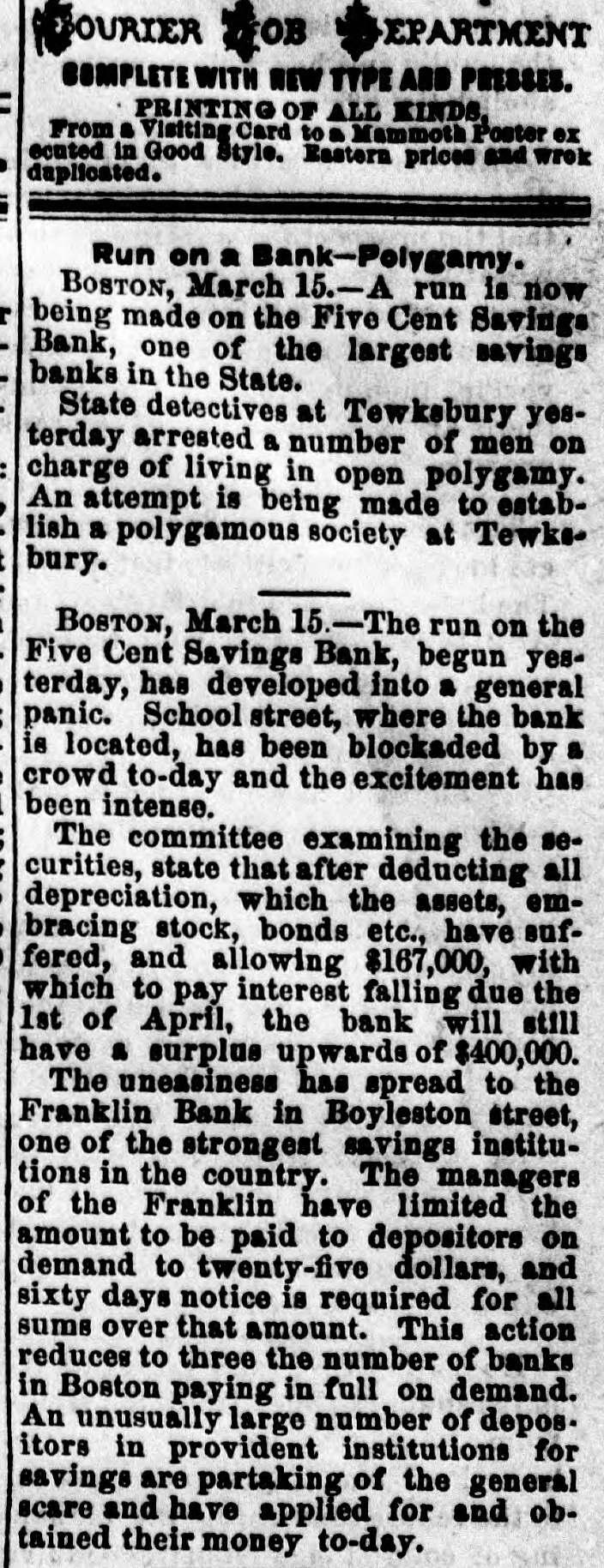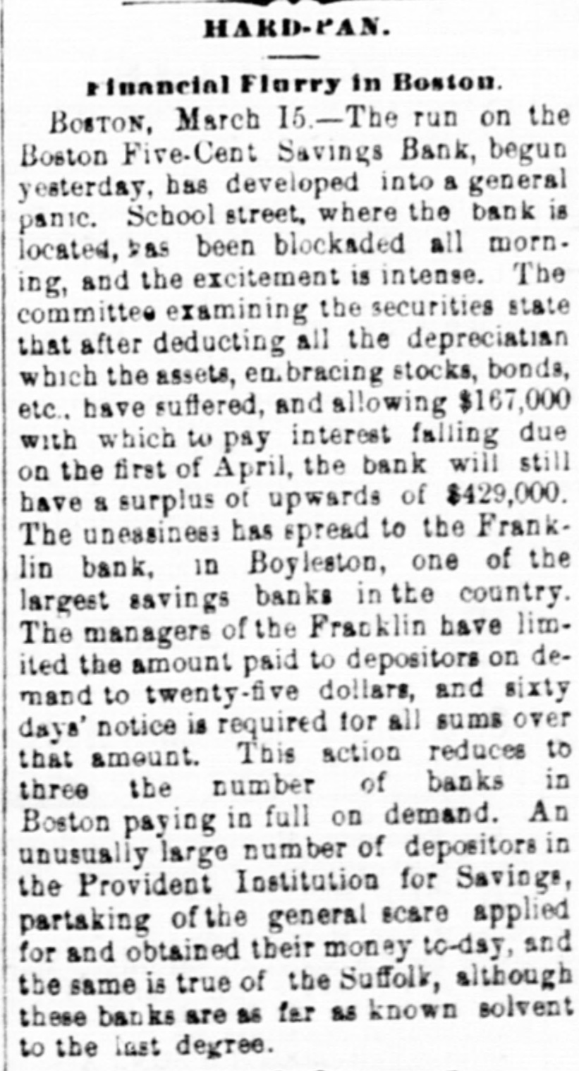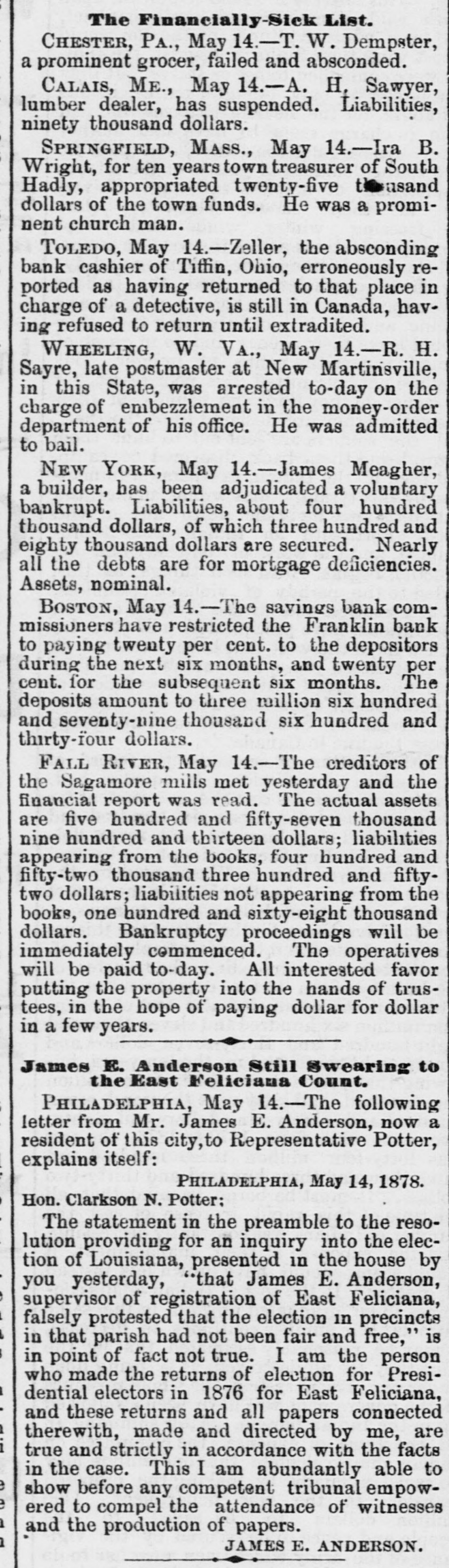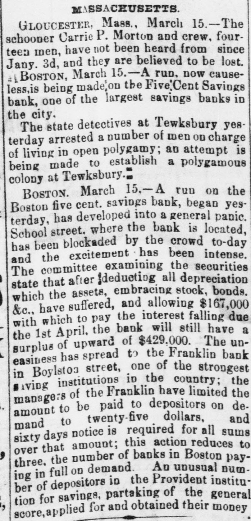 whole of the same, shall be educational fund, which said fund shall be invested in bonds of the United States bearing a rate of interest not less than four per centum per annum, both principal and interest payable in coin, the interest on such educational fund only to be appropriated as above provided, and that for the first ten years the distribution of the net proceeds and interest of the fund to and among the several States, Territories and the District of Columbia shall be made according to the number of their respective population of ten years old and upward who cannot read and write, as shown from time to time by the last preceding published census of the United States. The first apportionment is to be made on or before the 31st of July, 1878, when the States and Territories shall be entitled to receive their distributiv shares. Goode will offer an amendment providing that one-fourth of the money appropriated by this bill shall be given to agricultural colleges and institutions of learning established in accordance with the Act of Congress of July 2, 1862, unless in any case the State Legislature shall otherwise direct. Run on a Boston Savings Bank. BOSTOM, March 15.-The run on the Boston Five-Cent Savings Bank, begun yesterday, has developed into a genuine panic. School street, where the bank is located, has been blockaded by a crowd to-day, and the excitement has been intense. The committee examining the securities states that after deducting all the depreciation which the assets, embracing stocks, bonds, etc., have suffered, and allowing $16,700 with which to pay interest falling due on the 1st of April, the bank will still have a surplus of upward of $429,000. The uneasiness has spread to the Franklin Bank, Boylston street. one of the strongest banks in the country. The managers of the Franklin have limited the amount paid to depositors on demand to $25 and sixty days' notice is required for all sums over that amount. This action reduces to three the number of banks in Boston paying in full on demand. A large number of depositors in the provident institutions for savings are partaking of the general scare, and have applied for and obtained their money to-day, and the same is true of the Suffolk, although these banks are as far as known-solvent. A suit Against the Panama Trau⑉18 Company. NEW YORK, February 15.-The World says Charles A. Jones has sued the Panama Transit Company for $50,000. His agent purchased the stoamship Georgia when ashore in the Straits of Magellan for $950, but before he could take possession the company's steamer Wilmington arrived and Captain Holmes threatened to seize the Georgia if not given up peaceably, whereupon Jones, agent, entered into an agreement to sell her for $1,350 and Captain Holmes gave draft on Valparaiso for that amount. The draft was dishonored, it is claimed. at the instance of Holmes. Meauwhile the Georgia was taken away. Ats Peruvian port Captain Dow. in the employ of the Panama Transit Steamship Company, made an offer on the 12th of June to give Jones $16,250 gold and costs in settlement of his claim. This offer was accepted, but the gold was not forthcoming, drafts being offered instead. These Jones, owing to his former experience, refused. Ten days afterwards the Georgia escaped and Jones now seeks $50,000 damages. Judge Freedman denied the application to strike out a portion of the complaint. A Queer Assertion. NEW YORK, March 15.-A Herald's Washington special says that silver bullion is now held at a higher price in San Francisco than in London. It looks as though the mine owners who are few in number, and who control the supply in California and Nevada, are putting up the price on the Government now that the silver bill has forced the Treasury to be a regular purchaser of a fixed amount. The Secretary, it is understood. has not yet had occasion to buy in the San Francisco market and he will doubtless buy in the cheapest market, wherever that may be; but if the country sees that the Nevada mine owners mean to use the silver act to make a corner, it will not be inclined patiently to submit to this. General Anderson's Case. NEW YORK, March 14.-A Herald New Orleans special says There appears little doubt that the extra Legislature is to be held here in connection with the Returning Board pardons. It was stated this morning by undoubted authority that fourteen Democratic Senators have agreed to stand by Governor Nicholls in pardoning Anderson, and they would delay legistion until Anderson's case was decided by the Supreme Court. In furtherance of this arrangement they have not passed any of the important House bills sent to them and are delaying matters in every possible way. The correspondent hints that this movement is likely to cause a disruption of the Democratic party. aliver Bullion Certificates. WASHINGTON, March 15.-The Committee on Banking and Currency this morning agreed upon a bill providing for the issuing of silver bullion certificates, The bullion is be counted at its equivalent in coin, less Mint charges and cost of transportation. Certificates are to be issued by any silver coining Mint or Assay office, and to be redeemable at the Assay office in New York and the Mint in San Francisco. The certificates are to be legal tender in payment for all Government dues. A Louisinum Representative Dead. WASHINGTON, March 15. Secretary Evarts this afternoon telegraphed from the State Department the following, addressed to Hon. Samuel J. Randall, Speaker of the House of Representatives: "A telegraphic communication has just been received from the United States Consul General at Havana, stating that Hon. John Edwards Leonard, Representative from Louisiana, died this morning of W. M. EVARTS, yellow fever. "Secretary of State," The Union Pacific Open. OMAHA, March 14.-The first overland passenger express train from the West since Friday last arrived this afternoon. All the snow-bound passengers have now reached this city. The Unio