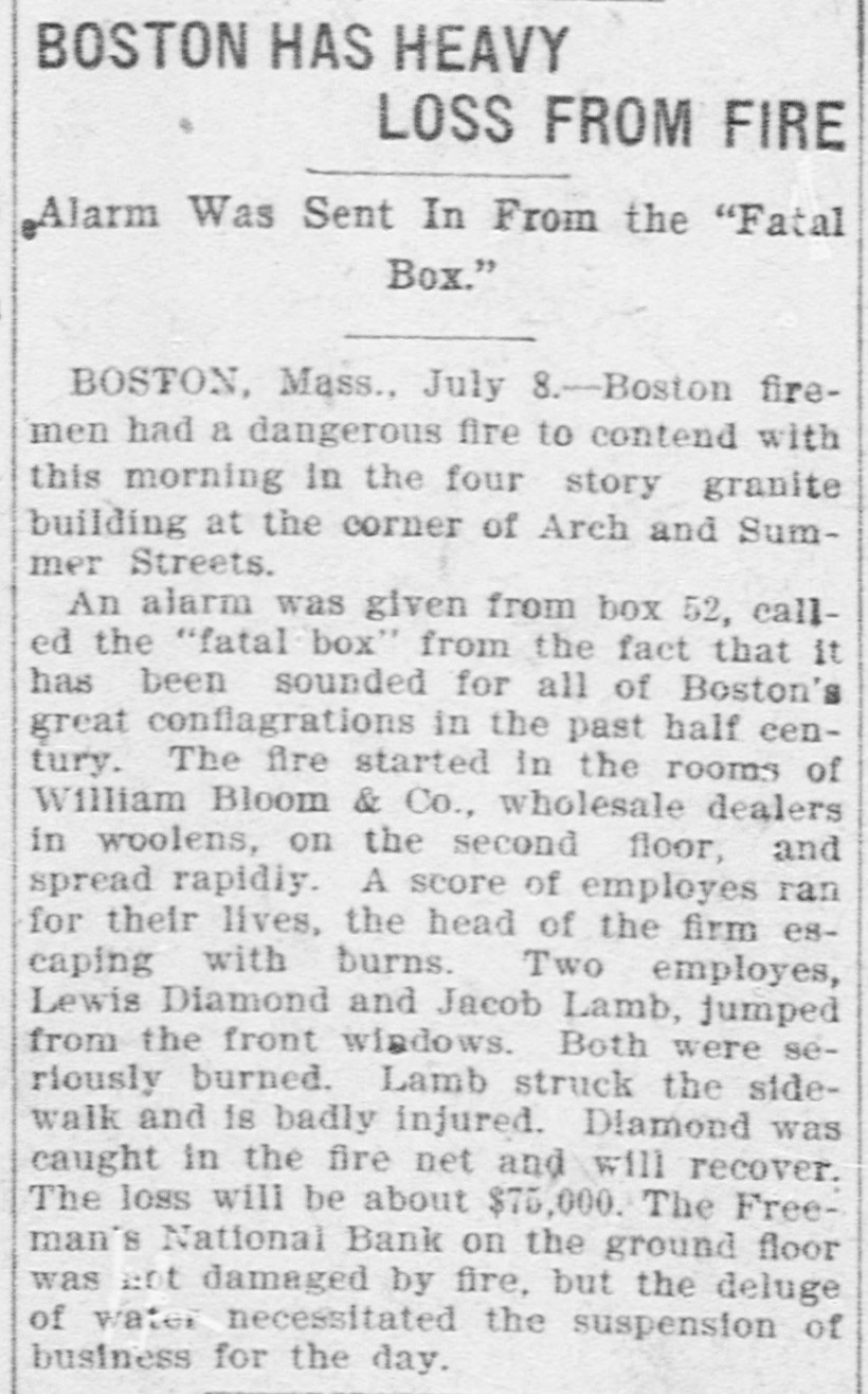 BOSTON HAS HEAVY LOSS FROM FIRE Alarm Was Sent In From the "Fatal Box." BOSTON, Mass.. July 8.-Boston firemen had a dangerous fire to contend with this morning in the four story granite building at the corner of Arch and Summer Streets. An alarm was given from box 52, called the "fatal box" from the fact that It has been sounded for all of Boston's great conflagrations in the past half century. The fire started in the rooms of William Bloom & Co., wholesale dealers in woolens, on the second floor, and spread rapidly. A score of employes ran for their lives, the head of the firm escaping with burns. Two employes, Lewis Diamond and Jacob Lamb, jumped from the front windows. Both were seriously burned. Lamb struck the sidewalk and is badly injured. Dlamond was caught in the fire net and will recover. The loss will be about $75,000. The Freeman's National Bank on the ground floor was ant damaged by fire, but the deluge of water necessitated the suspension of business for the day.