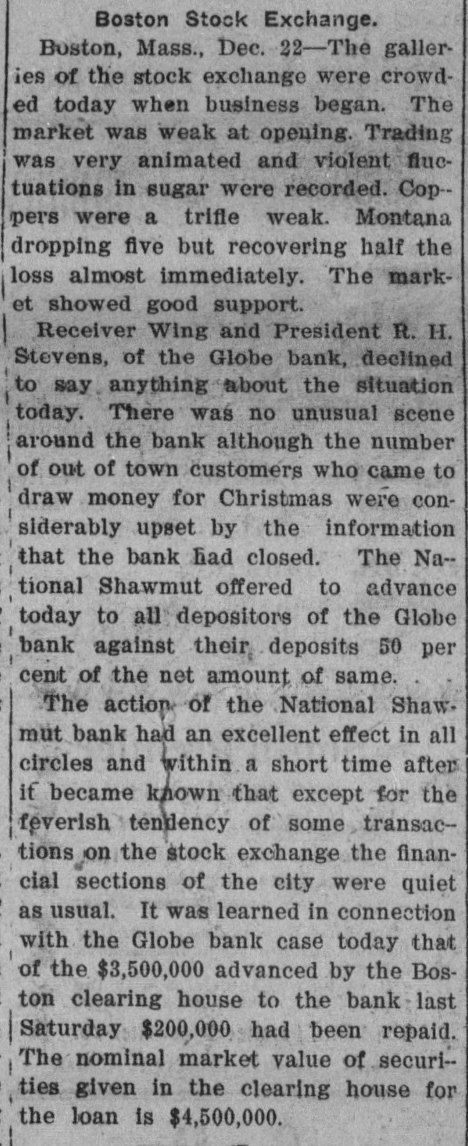 Boston Stock Exchange. Boston, Mass., Dec. 22-The galleries of the stock exchange were crowded today when business began. The market was weak at opening. Trading was very animated and violent fluctuations in sugar were recorded. Cop-pers were a trifle weak. Montana dropping five but recovering half the loss almost immediately. The market showed good support. Receiver Wing and President R. H. Stevens, of the Globe bank, declined to say anything about the situation today. There was no unusual scene around the bank although the number of out of town customers who came to draw money for Christmas were considerably upset by the information that the bank had closed. The Na-tional Shawmut offered to advance today to all depositors of the Globe bank against their deposits 50 per cent of the net amount of same. The action of the National Shaw. mut bank had an excellent effect in all circles and within a short time after if became known that except for the feverish tendency of some transactions on the stock exchange the financial sections of the city were quiet as usual. It was learned in connection with the Globe bank case today that of the $3,500,000 advanced by the Boston clearing house to the bank last Saturday $200,000 had been repaid. The nominal market value of securi-ties given in the clearing house for the loan is $4,500,000.
