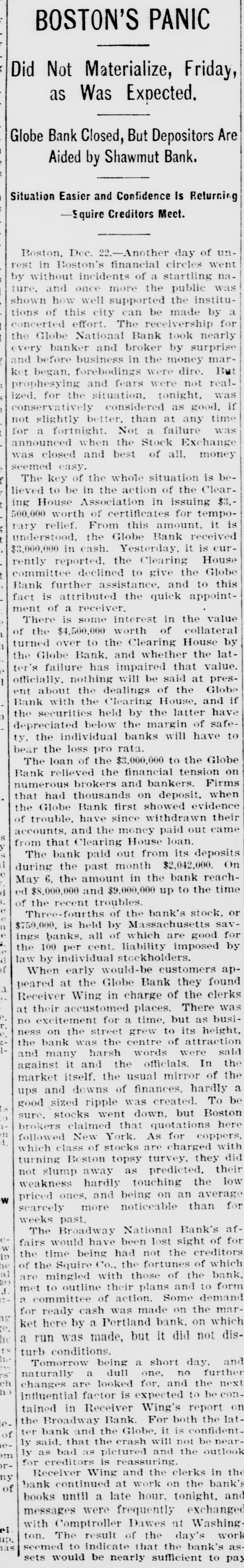BOSTON'S PANIC Did Not Materialize, Friday, as Was Expected. Globe Bank Closed, But Depositors Are Aided by Shawmut Bank. Situation Easier and Confidence Is Returning -Squire Creditors Meet. Boston, Dec. 22.-Another day of unrest in Boston's financial circles went by without incidents of a startling nature, and once more the public was shown how well supported the institutions of this city can be made by a concerted effort. The receivership for the Globe National Bank took nearly every banker and broker by surprise and before business in the money market began, forebodings were dire. But prophesying and fears were not realized, for the situation, tonight, was conservatively considered as good, if not slightly better, than at any time for o fi