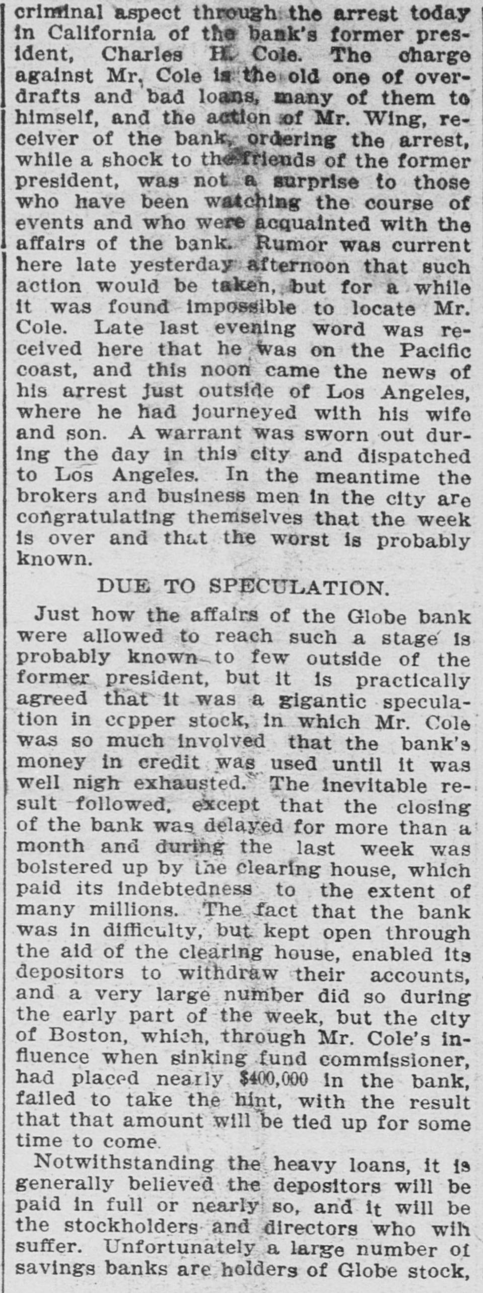 criminal aspect through the arrest today in California of the bank's former president, Charles H Cole. The charge against Mr. Cole is the old one of overdrafts and bad loans, many of them to himself, and the action of Mr. Wing, receiver of the bank, ordering the arrest, while a shock to the friends of the former president, was not a surprise to those who have been watching the course of events and who were acquainted with the affairs of the bank. Rumor was current here late yesterday afternoon that such action would be taken, but for a while it was found impossible to locate Mr. Cole. Late last evening word was received here that he was on the Pacific coast, and this noon came the news of his arrest just outside of Los Angeles, where he had journeyed with his wife and son. A warrant was sworn out during the day in this city and dispatched to Los Angeles. In the meantime the brokers and business men in the city are congratulating themselves that the week is over and that the worst is probably known. DUE TO SPECULATION Just how the affairs of the Globe bank were allowed to reach such a stage is probably known-to few outside of the former president, but it is practically agreed that it was a gigantic speculation in ccpper stock, in which Mr. Cole was so much involved that the bank's money in credit was used until it was well nigh exhausted. The inevitable result followed, except that the closing of the bank was delayed for more than a month and during the last week was bolstered up by the clearing house, which paid its indebtedness to the extent of many millions. The fact that the bank was in difficulty, but kept open through the aid of the clearing house, enabled its depositors to withdraw their accounts, and a very large number did so during the early part of the week, but the city of Boston, which, through Mr. Cole's influence when sinking fund commissioner, had placed nearly $400,000 in the bank, failed to take the hint, with the result that that amount will be tied up for some time to come Notwithstanding the heavy loans, it is generally believed the depositors will be paid in full or nearly so, and it will be the stockholders- and directors who wih suffer. Unfortunately a large number of savings banks are holders of Globe stock,