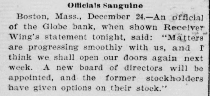 Officials Sanguine Boston, Mass., December 24.-An official of the Globe bank, when shown Receiver Wing's statement tonight, said: "Matters are progressing smoothly with us, and I think we shall open our doors again next week. A new board of directors will be appointed, and the former stockholders have given options on their stock."