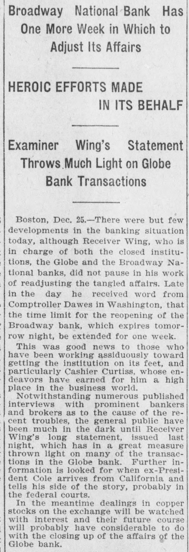Broadway National Bank Has One More Week in Which to Adjust Its Affairs HEROIC EFFORTS MADE IN ITS BEHALF Examiner Wing's Statement Throws Much Light on Globe Bank Transactions Boston, Dec. 25.-There were but few developments in the banking situation today, although Receiver Wing, who is in charge of both the closed institutions, the Globe and the Broadway National banks, did not pause in his work of readjusting the tangled affairs. Late in the day he received word from Comptroller Dawes in Washington, that the time limit for the reopening of the Broadway bank, which expires tomorrow night, be extended for one week. This was good news to those who have been working assiduously toward getting the institution on its feet, and particularly Cashier Curtiss, whose endeavors have earned for him a high place in the business world. Notwithstanding numerous published interviews with prominent bankers and brokers as to the cause of the recent troubles, the general public have been much in the dark until Receiver Wing's long statement, issued last night, which has in a great measure thrown light on many of the transactions in the Globe bank. Further information is looked for when ex-President Cole arrives from California and tells his side of the story, probably in the federal courts. In the meantime dealings in copper stocks on the exchange will be watched with interest and their future course will probably have considerable to do with the closing up of the affairs of the Globe bank.