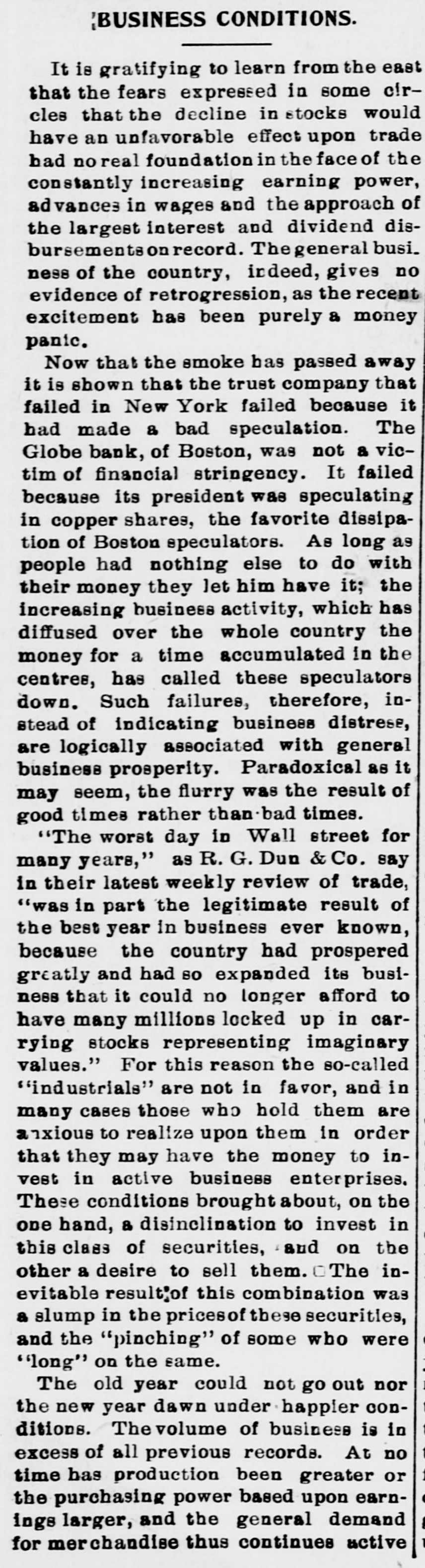 BUSINESS CONDITIONS. It is gratifying to learn from the east that the fears expressed in some circles that the decline in stocks would have an unfavorable effect upon trade had no real foundation in the face of the constantly increasing earning power, advances in wages and the approach of the largest interest and dividend disbursements on record. The general busi. ness of the country, indeed, gives no evidence of retrogression, as the recent excitement has been purely a money panic. Now that the smoke has passed away it is shown that the trust company that failed in New York failed because it had made a bad speculation. The Globe bank, of Boston, was not a victim of financial stringency. It failed because its president was speculating in copper shares, the favorite dissipation of Boston speculators. As long as people had nothing else to do with their money they let him have it; the increasing business activity, which has diffused over the whole country the money for a time accumulated in the centres, has called these speculators down. Such failures, therefore, instead of indicating business distress, are logically associated with general business prosperity. Paradoxical as it may seem, the flurry was the result of good times rather than bad times. "The worst day in Wall street for many years," as R. G. Dun & Co. say in their latest weekly review of trade, "was in part the legitimate result of the best year in business ever known, because the country had prospered greatly and had so expanded its business that it could no longer afford to have many millions locked up in carrying stocks representing imaginary values." For this reason the so-called "industrials" are not in favor, and in many cases those who hold them are anxious to realize upon them in order that they may have the money to invest in active business enterprises. These conditions brought about, on the one hand, a disinclination to invest in this class of securities, and on the The inother a desire to sell them. evitable result'of this combination was a slump in the pricesof these securities, and the "pinching" of some who were "long" on the same. The old year could not go out nor the new year dawn under happier conditions. The volume of business is in excess of all previous records. At no time has production been greater or the purchasing power based upon earnings larger, and the general demand for merchandise thus continues active