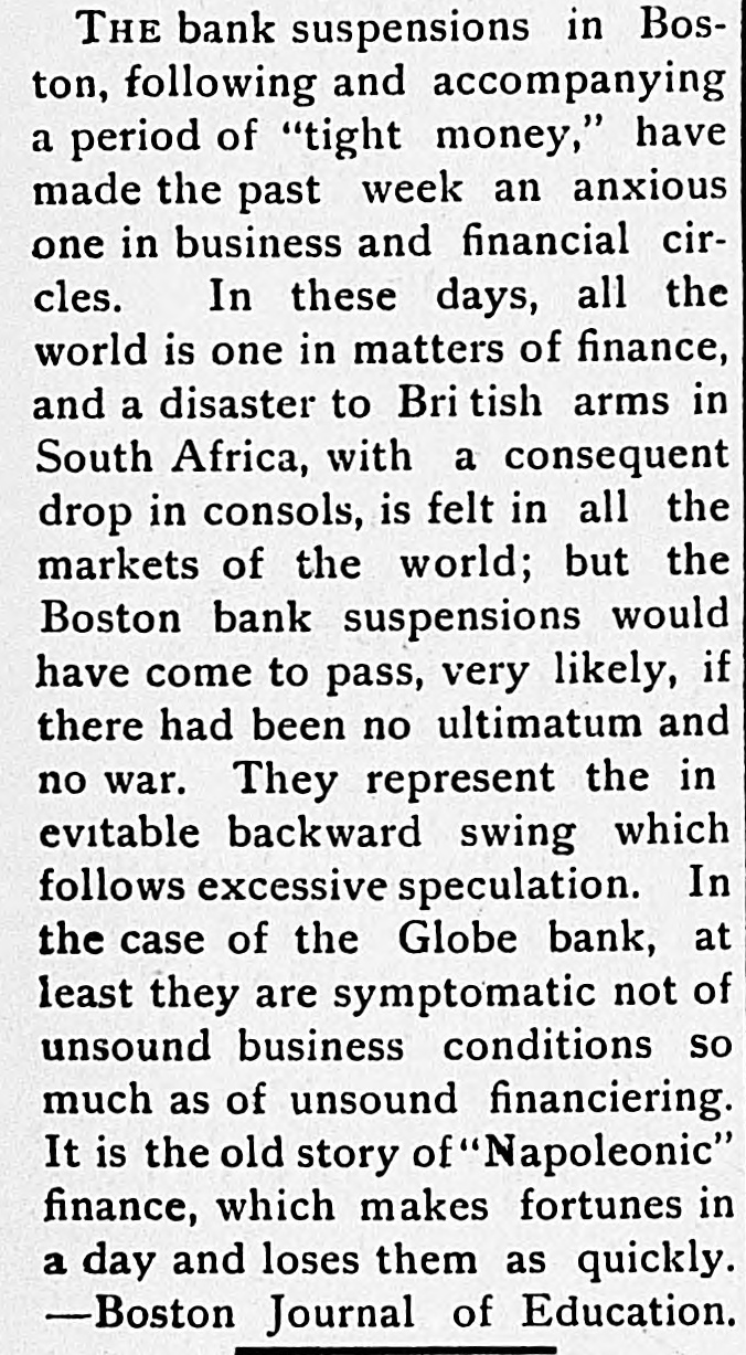 THE bank suspensions in Boston, following and accompanying a period of "tight money," have made the past week an anxious one in business and financial circles. In these days, all the world is one in matters of finance, and a disaster to British arms in South Africa, with a consequent drop in consols, is felt in all the markets of the world; but the Boston bank suspensions would have come to pass, very likely, if there had been no ultimatum and no war. They represent the in evitable backward swing which follows excessive speculation. In the case of the Globe bank, at least they are symptomatic not of unsound business conditions so much as of unsound financiering. It is the old story of 'Napoleonic" finance, which makes fortunes in a day and loses them as quickly. -Boston Journal of Education.