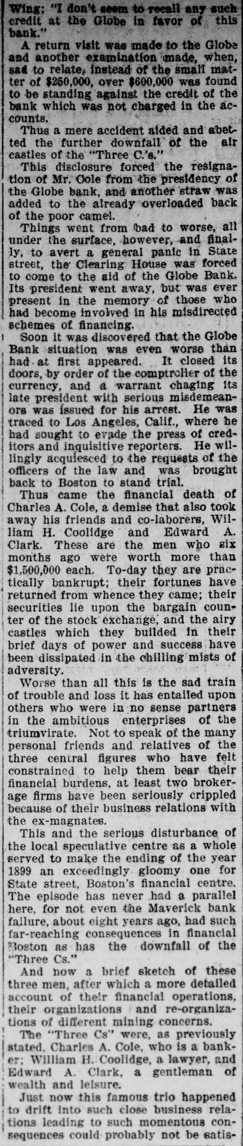 Wing; "I don't seem to recall any such credit at the Globe in favor of this bank." A return visit was made to the Globe and another examination made, when, sad to relate, instead of the small matter of $250,000, over $600,000 was found to be standing against the credit of the bank which was not charged in the accounts. Thus a mere accident aided and abetted the further downfall of the air castles of the "Three C.'s." This disclosure forced the resignation of Mr. Cole from the presidency of the Globe bank, and another straw was added to the already overloaded back of the poor camel. Things went from Ibad to worse, all under the surface, however, and finally, to avert a general panic in State street, the Clearing House was forced to come to the aid of the Globe Bank. Its president went away, but was ever present in the memory of those who had become involved in his misdirected schemes of financing. Soon it was discovered that the Globe Bank situation was even worse than had at first appeared. It closed its doors, by order of the comptroller of the currency, and a warrant chaging its late president with serious misdemeanors was issued for his arrest. He was traced to Los Angeles, Calif., where he had sought to evade the press of creditors and inquisitive reporters. He willingly acquiesced to the requests of the officers of the law and was brought back to Boston to stand trial. Thus came the financial death of Charles A. Cole, a demise that also took away his friends and co-laborers, William H. Coolidge and Edward A. Clark. These are the men who six months ago were worth more than $1,500,000 each. To-day they are practically bankrupt; their fortunes have returned from whence they came; their securities lie upon the bargain counter of the stock exchange, and the airy castles which they builded in their brief days of power and success have been dissipated in the chilling mists of adversity. Worse than all this is the sad train of trouble and loss it has entailed upon others who were in no sense partners in the ambitious enterprises of the triumvirate. Not to speak of the many personal friends and relatives of the three central figures who have felt constrained to help them bear their financial burdens, at least two brokerage firms have been seriously crippled because of their business relations with the ex-magnates. This and the serious disturbance of the local speculative centre as a whole served to make the ending of the year 1899 an exceedingly gloomy one for State street, Boston's financial centre. The episode has never had a parallel here, for not even the Maverick bank failure, about eight years ago, had such far-reaching consequences in financial Boston as has the downfall of the "Three Cs." And now a brief sketch of these three men, after which a more detailed account of their financial operations, their organizations and re-organizations of different mining concerns. The "Three Cs" were, as previously stated, Charles A. Cole, who is a banker; William H. Coolidge, a lawyer, and Edward A. Clark, a gentleman of wealth and leisure. Just now this famous trio happened to drift into such close business relations leading to such momentous consequences could probably not be satis-