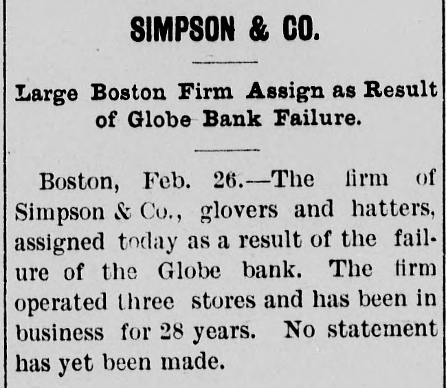 SIMPSON & CO. Large Boston Firm Assign as Result of Globe Bank Failure. Boston, Feb. 26.-The firm of Simpson & Co., glovers and hatters, assigned today as a result of the failure of the Globe bank. The firm operated three stores and has been in business for 28 years. No statement has yet been made.