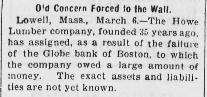 Old Concern Forced to the Wall. Lowell, Mass., March 6.-The Howe Lumber company, founded 35 years ago, has assigned, as a result of the failure of the Globe bank of Boston, to which the company owed a large amount of money. The exact assets and liabilities are not yet known.