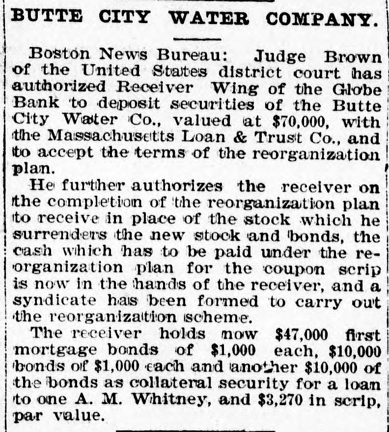 Boston News Bureau: Judge Brown of the United States district court has authorized Receiver Wing of the Globe Bank to deposit securities of the Butte City Water Co., valued at $70,000, with the Massachusetts Loan & Trust Co., and to accept the terms of the reorganization plan.