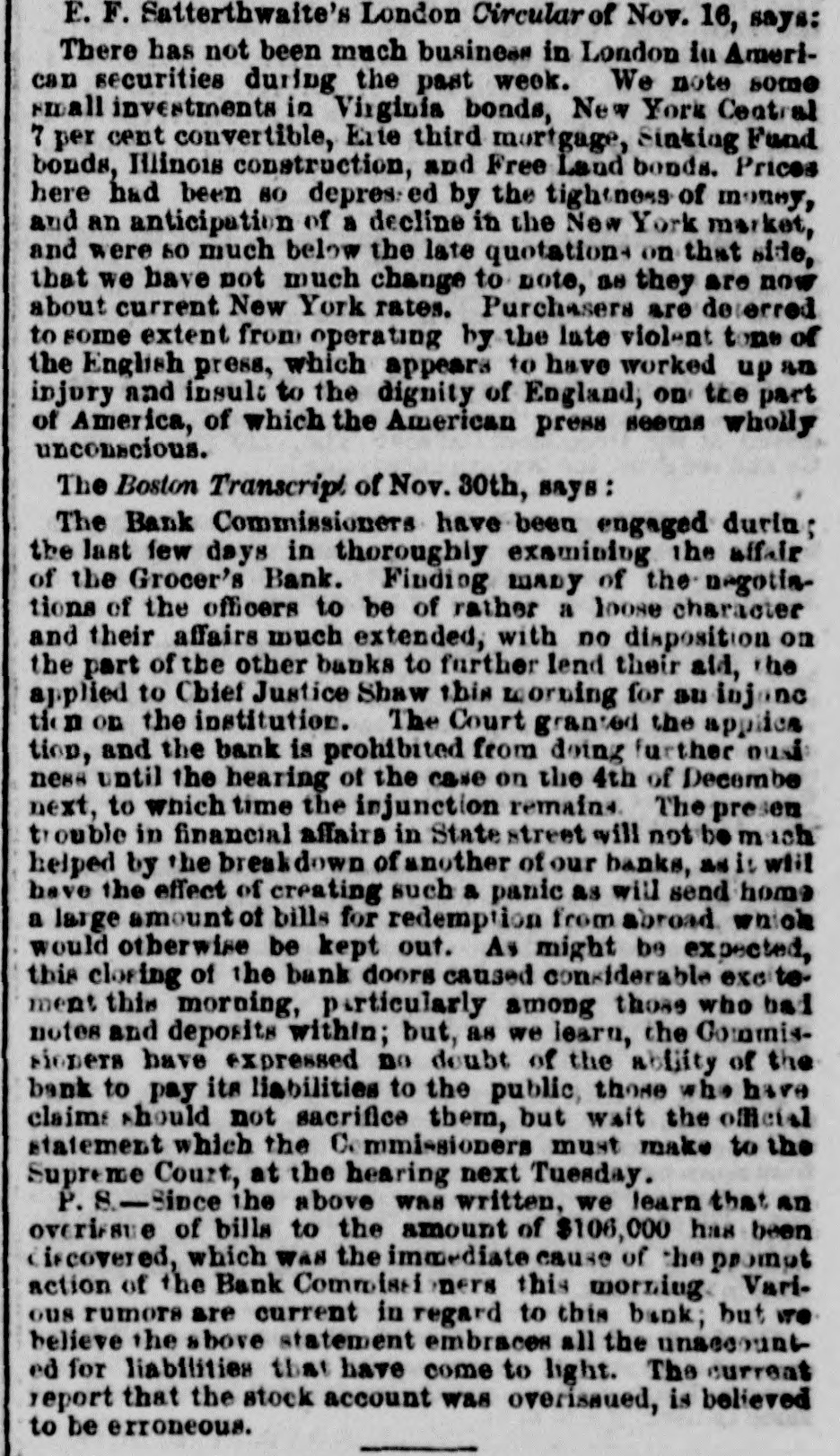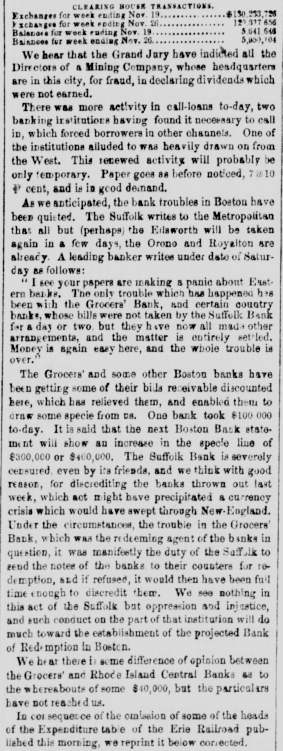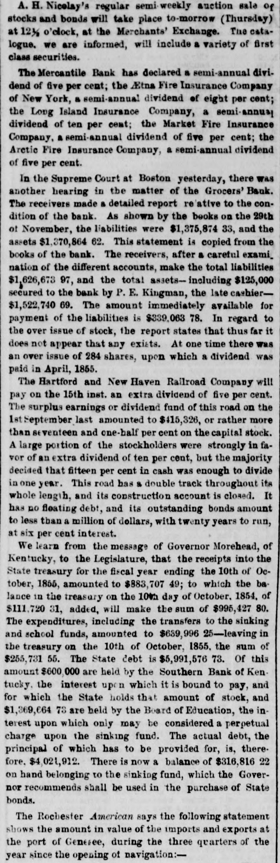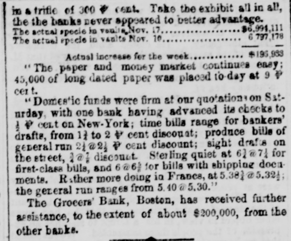 FINANCIAL AND COMMERCIAL. MONEY MARKET. SUNDAY, Nov. 25-6 P. M. The stock market during the past week has been very unsettled. Prices have fluctuated considerably, and operators on both sides of the account have had at times the movement in their favor. The arrival of later European advices gave for the time an upward impetus to the market, but it was not of long duration. In the midst of the inflation the announcement that several Eastern banks had been dissontinued, caused a reaction, and stocks receded full as much as they had previously gained. The apprehension that the New England banks, which had been flooding the West with their currency, had strained a point too much, and that several failures would follow, WAS visible among speculators, but It did not last long. It served to show how sensitive the public mind was, and how easily it was affected. This fact shows how dangerous it is to operate in fancy stocks for a rise. Almost any day something may occur to disturb confidence and produce a temporary panic, and seatter speculators like 80 many frightened fawns. It is, therefore, best to deal in nothing but what has real value, and has dividends in the prospective large enough to cover interest at least on the investment. Such stocks are not much affected by the bugbears of the day, and holders are not troubled by any temporary depreciation in market value. There were no shipments of specie from this port last week, and none that we hear of from Boston. There was a decrease in the Sub-treasury last week of $540,883. Notwithstanding this favorable movement, we do not look for any increase in the specie department of our banks in the next weekly statement. We have been sending specie out in almost every direction except across the Atlantic. Boston has been drawing from us largely, and considerable has gone South and West. The advices by mail from Europe are not NO satisfactory 0.8 reported by telegraph. The improvement in Consols and other stock securities are reported as entirely artificial while the probability of a drain of bullion continuing is as strong 165 ever. Payments on account of the Turkish loan, it was stringency in money matters, expected, would cause and keep up the exportation of specie. It appears that another arrival of gold from Australia bad been sent into the Bank of England, whi prevented the returns for the week ending Nov. 3 showing reduction in buttion. It was expected that the next monthly statement of the Bank of France would show a large and steady drain of specie. We shall not get the official returns until the next Curard steamer to Halifax. The anthracite coal trade has fallen off considerably the past week, particularly from the Schuylkill region. The shipments on the Lehigh Navigation for the week ending OR Saturday last were 33,751 tons, and for the 1,238,820 tons. The shipments by the Schaylkill Navigation Company for the week ending on Thursday were 30,413 tons, and for the sesson 1,045,092 tons, against 872,312 tons to corresponding time last year. The Reading Railroad brought down for the week ling on Thursday, only 29,388 tons, and for the season 2,188,154 tons, against 1,940,768 tons to the same time last year. The whole tonnage for the week from the Schuyl kill was 59,801 tons, and including that of the Lehigh, only reached 93,552 tons. The season, now protty well over, has been one of the most productive in many years for the carrying companies. There has been little or no interruption to any one of them from any cause, and prices, all things considered, have been more remuners. tive than ever before. The aggregate tonnage has been largely increased. The Boston Journal of the 23d inst says:The Grocers' Bank has promptly redeemed every de. mand made upon it, and will continue to to The bills are paid in specie on presentation The deposits have been reduced to about $100 000, and the circu att LA coming in rapidly. Should it be deemed best to wind up the affairs of the bank, it is confidently believed by those who have given its accounts a thorough investigati n, that but little if any loss can accrue to stockholders. An amount sufficient to redeem every liability of the bank matures in loans previous to January 1. We understand that bills of the Orono Bank, Searsport Bank. Ellsworth Bank of Maine, and Derby Line Bank, of Vermont, were refused yesterday by the Grocers', where they have bitherto been redeemed as fast as presented from the Suffolk. This will of course involve their refusal by the Suffolk. It should be understood however, that this is in consequence of an accidental over draft on the Grocers', which under other circumstances would have protected them, and doe not affect the safety of the bills mentioned. The result will be probably a delay of two 05 three days in the redemp In of the bills bere, until the banks have time to remit funds for their protection. The annexed communication from a stockholder, rets tive to the dishonest management of the Nicacagua Fran sit Company, is pointed and deserved. That men interested in such a concern will quietly look on and Fee a clique of financiers and speculators use their property, year after year, solely for private parposes, 1a even at this day, most extraordinary. Schuy er had the credit of managing the New Haven Railroad Company judiciously up to the last moment of his administration and the stockholders have nothing to blame but their neglect and blind confidence; but in the Nicaragus Transit Company it is 18 clear as day that a set of leaches have Exed themselves upon its vitals, and will only let go their hold when completely gorged. The following stidetures of a stockholder are perfectly correct; but as those most interested have the remedy in ther own hands, some action should be taken in the matter, and Fee If some change cannot be made before the meat is all extracted from the shell. It has been reported that arrangements were about being made to amalgamate the Pacific Mail Stesm