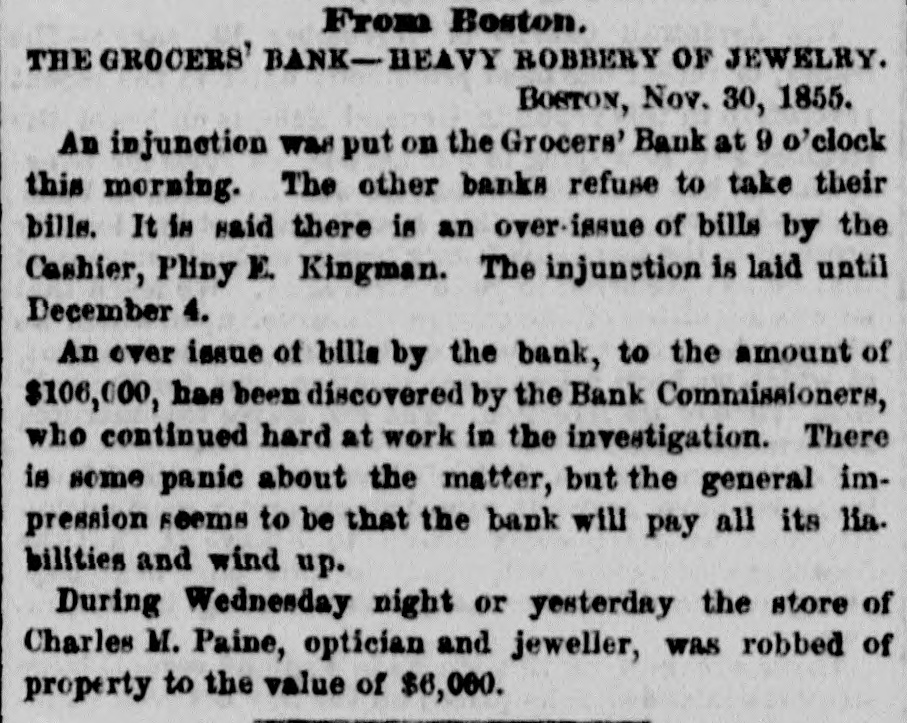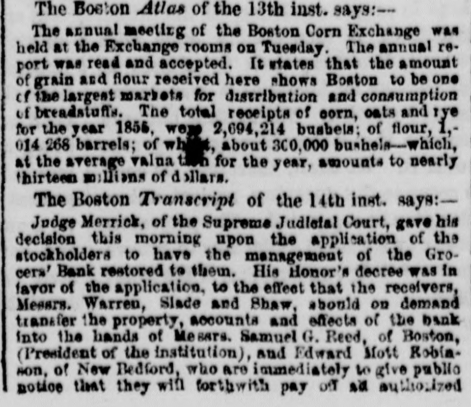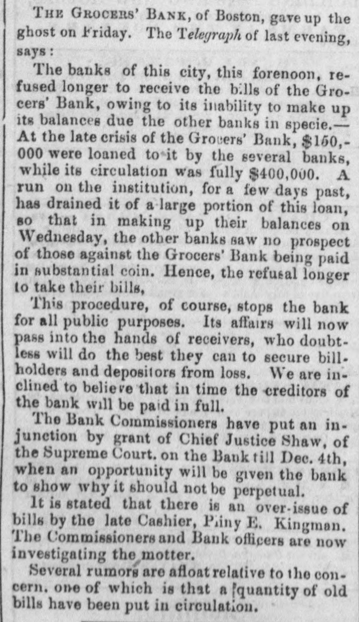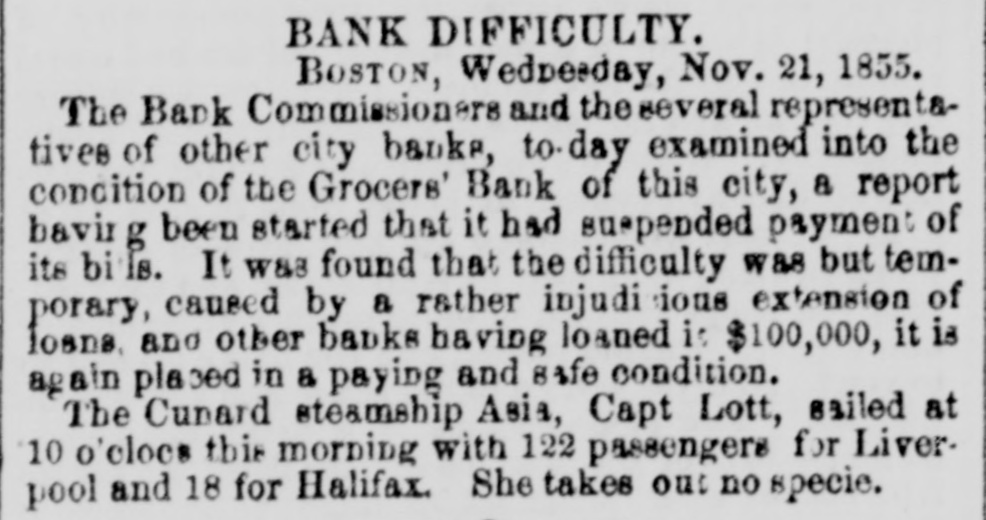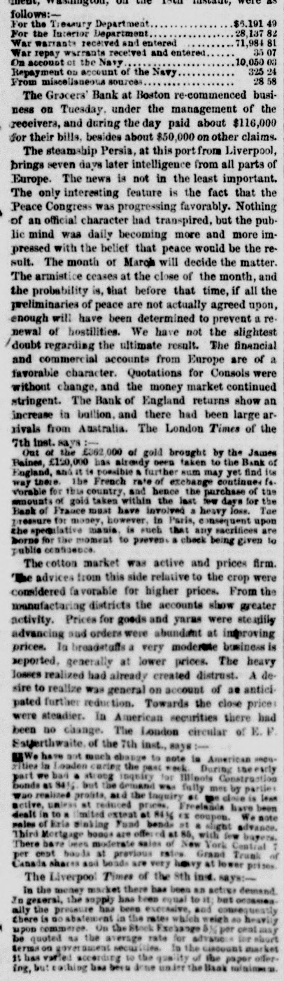 FINANCIAL AND COMMERCIAL. MONEY MARKET. SUNDAY, Nov. 25-6 P. M. The stock market during the past week has been very unsettled. Prices have fluctuated considerably, and operators on both sides of the account have had at times the movement in their favor. The arrival of later European advices gave for the time an upward impetus to the market, but it was not of long duration. In the midst of the inflation the announcement that several Eastern banks had been dissontinued, caused a reaction, and stocks receded full as much as they had previously gained. The apprehension that the New England banks, which had been flooding the West with their currency, had strained a point too much, and that several failures would follow, WAS visible among speculators, but It did not last long. It served to show how sensitive the public mind was, and how easily it was affected. This fact shows how dangerous it is to operate in fancy stocks for a rise. Almost any day something may occur to disturb confidence and produce a temporary panic, and seatter speculators like 80 many frightened fawns. It is, therefore, best to deal in nothing but what has real value, and has dividends in the prospective large enough to cover interest at least on the investment. Such stocks are not much affected by the bugbears of the day, and holders are not troubled by any temporary depreciation in market value. There were no shipments of specie from this port last week, and none that we hear of from Boston. There was a decrease in the Sub-treasury last week of $540,883. Notwithstanding this favorable movement, we do not look for any increase in the specie department of our banks in the next weekly statement. We have been sending specie out in almost every direction except across the Atlantic. Boston has been drawing from us largely, and considerable has gone South and West. The advices by mail from Europe are not NO satisfactory 0.8 reported by telegraph. The improvement in Consols and other stock securities are reported as entirely artificial while the probability of a drain of bullion continuing is as strong 165 ever. Payments on account of the Turkish loan, it was stringency in money matters, expected, would cause and keep up the exportation of specie. It appears that another arrival of gold from Australia bad been sent into the Bank of England, whi prevented the returns for the week ending Nov. 3 showing reduction in buttion. It was expected that the next monthly statement of the Bank of France would show a large and steady drain of specie. We shall not get the official returns until the next Curard steamer to Halifax. The anthracite coal trade has fallen off considerably the past week, particularly from the Schuylkill region. The shipments on the Lehigh Navigation for the week ending OR Saturday last were 33,751 tons, and for the 1,238,820 tons. The shipments by the Schaylkill Navigation Company for the week ending on Thursday were 30,413 tons, and for the sesson 1,045,092 tons, against 872,312 tons to corresponding time last year. The Reading Railroad brought down for the week ling on Thursday, only 29,388 tons, and for the season 2,188,154 tons, against 1,940,768 tons to the same time last year. The whole tonnage for the week from the Schuyl kill was 59,801 tons, and including that of the Lehigh, only reached 93,552 tons. The season, now protty well over, has been one of the most productive in many years for the carrying companies. There has been little or no interruption to any one of them from any cause, and prices, all things considered, have been more remuners. tive than ever before. The aggregate tonnage has been largely increased. The Boston Journal of the 23d inst says:The Grocers' Bank has promptly redeemed every de. mand made upon it, and will continue to to The bills are paid in specie on presentation The deposits have been reduced to about $100 000, and the circu att LA coming in rapidly. Should it be deemed best to wind up the affairs of the bank, it is confidently believed by those who have given its accounts a thorough investigati n, that but little if any loss can accrue to stockholders. An amount sufficient to redeem every liability of the bank matures in loans previous to January 1. We understand that bills of the Orono Bank, Searsport Bank. Ellsworth Bank of Maine, and Derby Line Bank, of Vermont, were refused yesterday by the Grocers', where they have bitherto been redeemed as fast as presented from the Suffolk. This will of course involve their refusal by the Suffolk. It should be understood however, that this is in consequence of an accidental over draft on the Grocers', which under other circumstances would have protected them, and doe not affect the safety of the bills mentioned. The result will be probably a delay of two 05 three days in the redemp In of the bills bere, until the banks have time to remit funds for their protection. The annexed communication from a stockholder, rets tive to the dishonest management of the Nicacagua Fran sit Company, is pointed and deserved. That men interested in such a concern will quietly look on and Fee a clique of financiers and speculators use their property, year after year, solely for private parposes, 1a even at this day, most extraordinary. Schuy er had the credit of managing the New Haven Railroad Company judiciously up to the last moment of his administration and the stockholders have nothing to blame but their neglect and blind confidence; but in the Nicaragus Transit Company it is 18 clear as day that a set of leaches have Exed themselves upon its vitals, and will only let go their hold when completely gorged. The following stidetures of a stockholder are perfectly correct; but as those most interested have the remedy in ther own hands, some action should be taken in the matter, and Fee If some change cannot be made before the meat is all extracted from the shell. It has been reported that arrangements were about being made to amalgamate the Pacific Mail Stesm