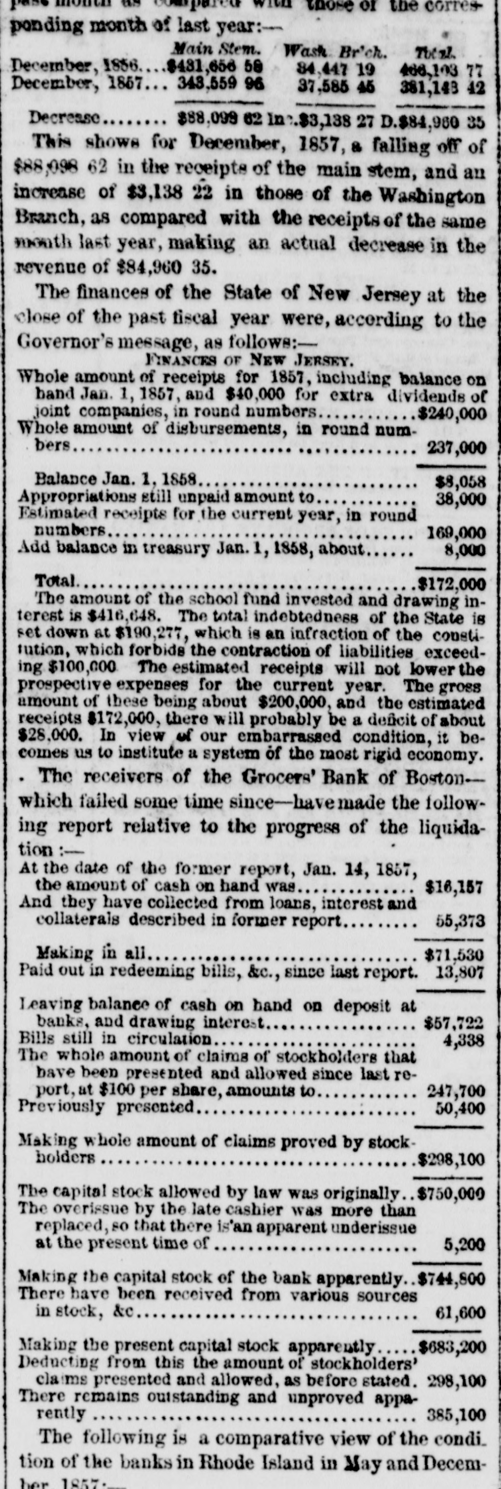 or the corresthose ponding month of last year:-Main Stem. Wash Br'ch. Total 1856 $431,656 December, 84,447 19 466,103 77 343,559 December, 1857 42 37,585 381,143 Decrease $88,099 62 $3,138 27 D.$84,950 35 This shows for December, 1857, & falling off of $88,098 62 in the receipts of the main stem, and an increase of $3,138 22 in those of the Washington Branch, as compared with the receipts of the same month last year, making an actual decrease in the revenue of $84,960 35. The finances of the State of New Jersey at the close of the past fiscal year were, according to the Governor's message, as follows:FINANCES OF NEW JERSEY. Whole amount of receipts for 1857, including balance on hand Jan. 1, 1857, and $40,000 for extra dividends of joint companies, in round numbers $240,000 Whole amount of disbursements, in round numbers 237,000 Balance Jan. 1, 1858 $8,058 Appropriations still unpaid amount to 38,000 Estimated receipts for the current year, in round numbers 169,000 Add balance in treasury Jan. 1, 1858, about 8,000 Total $172,000 The amount of the school fund invested and drawing interest is $416,648. The total indebtedness of the State is set down at $190,277, which is an infraction of the constitution, which forbids the contraction of liabilities exceeding $100,000 The estimated receipts will not lower the prospective expenses for the current year. The gross amount of these being about $200,000, and the estimated receipts $172,000, there will probably be a deficit of about $28,000. In view of our embarrassed condition, it becomes us to institute a system of the most rigid economy. The receivers of the Grocers' Bank of Boston-which failed some time since-havemade the following report relative to the progress of the liquidation :At the date of the former report, Jan. 14, 1857, the amount of cash on hand was $16,157 And they have collected from loans, interest and collaterals described in former report 55,373 Making in all $71,530 Paid out in redeeming bills, &c., since last report. 13,807 Leaving balance of cash on hand on deposit at banks, and drawing interest $57,722 Bills still in circulation 4,338 The whole amount of claims of stockholders that have been presented and allowed since last report, at $100 per share, amounts to 247,700 Previously presented 50,400 Making whole amount of claims proved by stockholders $298,100 The capital stock allowed by law was originally $750,000 The overissue by the late cashier was more than replaced, so that there is'an apparent underissue at the present time of 5,200 Making the capital stock of the bank apparently $744,800 There have been received from various sources in stock, &c 61,600 Making the present capital stock apparently $683,200 Deducting from this the amount of stockholders' claims presented and allowed, as before stated. 298,100 There remains outstanding and unproved apparently 385,100 The following is a comparative view of the condi_ tion of the banks in Rhode Island in May and Decemher 1857-