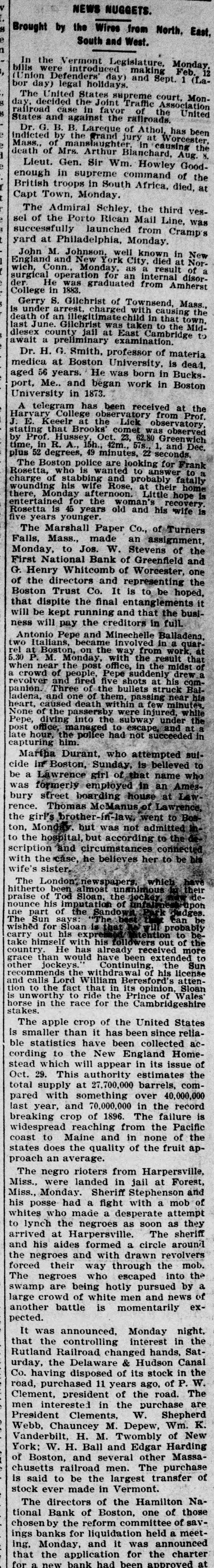 NEWS NUGGETS. Brought by the Wires from North. East. South and West. In the Vermont Legislature. Monday, 12 bills were introduced making Feb. (Union Defenders' day) and Sept. 1 (Labor day) legal holidays. The United States supreme court, Monday, decided the Joint Traffic Association railroad case in favor of the United States and against the ratiroads, Dr. G. B. B. Lareque of Athol has been indicted by the grand jury at Worcester Mass.. of manslaughter in causing death of Mrs. Arthur Blanchard, Aug. the 8. Lieut. Gen. Sir Wm. Howley Goodenough in supreme command of the British troops in South Africa, died, Capt Town, Monday. The Admiral Schley, the third vessel of the Porto Rican Mail Line, was successfully launched from Cramp's yard at Philadelphia, Monday. John M. Johnson, well known in New England and New York City, died at Norwich, Conn., Monday. as result surgical operation for an internal disorder. He was graduated from Amherst College in 1883. Gerry S. Gilchrist of Townsend, Mass. is under arrest, charged with causing the death of anillegitimatechild in that town, last June. Gilchrist was taken to the Middlesex county jail at East Cambridge to await a preliminary examination. Dr. H. G. Smith, professor of materia medical at Boston University, is dead, aged 56 years. He was born in Bucks. port, Me.. and began work in Boston University in 1873. A telegram has been received at the Harvary College obser vatory from Prof. E. Keeelr at the Lick observatory stating that Brooks comet was observed by Prof Hussey, Oct. 23, 62.80 Greenwich time in R. A.. 15h. 42m.. 57s., and Dec. plus 52 degrees, 49 minutes, 22 seconds. The Boston police are looking for Frank Rosetta, who is wanted to answer charge of stabbing and probably fatally wounding wife Rose. at their home there. Monday afternoon. Little hope Is entertained for the woman's recovery Rosetta is 45 years old and his wife five years younger. The Marshall Paper Co., of Turners Falls, Mass. made an assignment, Monday, to Jos. W. Stevens of the First National Bank of Greenfield and G. Henry Whitcomb of Worcester, one of the directors and representing the Boston Trust Co. It is to be hoped. that dispite the final entanglements it will be kept running and that the business will pay the creditors in full. Antonio Pepe and Minechelle Balladena two Italians, became involved a quarrel at Bosto on the way from work at 5.30 P M. Monday with the result that when near the post office. in the midst of crowd of people, Pepe suddenly drew a revolver and fired five shots at his companton. Three of the bullets struck Balladena, and one of them. passing near his heart, caused death within a few minutes. None of the passersby were injured, white Pepe. diving into the subway under the post office, managed to escape and at late hour, the police had not succeeded in capturing him Martha Durant. who attempted sufcide in Boston, Sunday, is believed to be a Lawrence girl of that name who was formerly employed in an Amesbury street boarding house at Lawrence, Thomas McManus of Lawrence, the girl's brother-in-law went to Boston, Monday but was not admitted to the hospital, but according to the scription and circumstances connected with the case, he believes her to be his wife's sister. The London,newspapers which have hitherto been almost unanimous heir praise of Tod Sloan. the jockey denounce his imputation of unfalin upon the part of the Sandown Park Judges. The Sun "The be can wished for Sloan is that will probably carry out his expres tention to betake himself with his followers out of the country. He has already received more grace than would have been extended to other jockeys. Continuing, the Sun recommends the withdrawal of his license and calls Lord William Beresford's attention to the fact that in its opinion, Sloan is unworthy to ride the Prince of Wales horse in the race for the Cambridgeshire stakes The apple crop of the United States is smaller than it has been since reliable statistics have been collected according to the New England Homestead which will appear in its issue of Oct. 29. This authority estimates the total supply at 27.700,000 barrels, compared with something over 40,000,000 last year, and 70.000.000 in the record breaking crop of 1896. The failure is widespread reaching from the Pacific coast to Maine and in none of the states does the quality of the fruit approach an average. The negro rioters from Harpersville, Miss. were landed in jail at Forest, Miss., Monday. Sheriff Stephenson and his posse had a fight with a mob of whites who made a desperate attempt to lynch the negroes as soon as they arrived at Harpersville. The sheriff and his aides formed a circle around the negroes and with drawn revolvers forced their way through the mob. The negroes who escaped into the swamp are being hotly pursued by a large crowd of white men and news of another battle is momentarily expected. It was announced, Monday night, that the controlling interest in the Rutland Railroad changed hands, Saturday, the Delaware & Hudson Canal Co. having disposed of its stock in the road, purchased 11 years ago, of P. W. Clement, president of the road. The men interested in the purchase are President Clements, W. Shepherd Webb, Chauncey M. Depew, Wm. K. Vanderbilt, H. M. Twombly of New York: W. H. Ball and Edgar Harding of Boston, and several other Massachusetts railroad men. The purchase is said to be the largest transfer of stock ever made in Vermont. The directors of the Hamilton National Bank of Boston, one of those chosen by the reform committee of sayings banks for liquidation held a meeting. Monday, and it was announced that the application for the charter for a new bank had been approved at