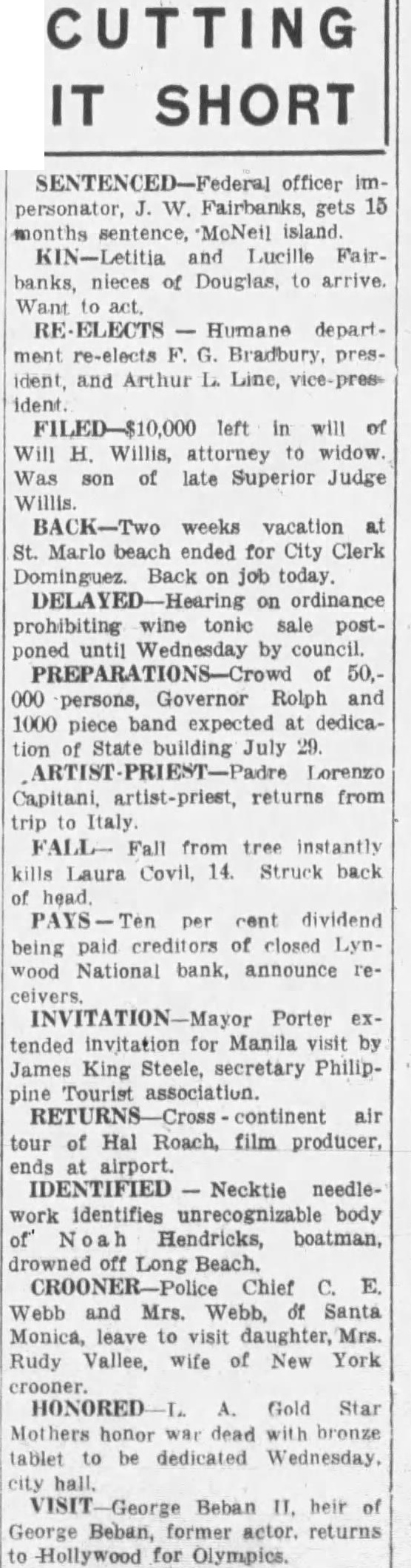 Receiver Now Has Office In Linwood (Continued from page 1) The National Band of Lynwood closed its doors and the liquidation of this Bank was also assigned to Mr. Heathcote. In order to cut down the overhead expense of liquidation, the Receiver has now discontinued the office in the Beaux Arts Building and has consolidated all his work in the banking room of the former National Bank of Lynwood at 11316 Long Beach Boulevard, Lynwood, this being located about two miles South of Huntington Park. It is pointed out by Mr. Heathcote that these developments have resulted in very greatly reducing the cost of liquidation of the South Pasadena National Bank, not only in the elimination of rent, telephone, etc., but also in the matter of salaries, inasmuch as the majority of these are now charged against The National Bank of Lynwood liquidation. As costs of liquidation are first charged against collections, this information will prove of interest to creditors of the South Pasadena National Bank. The Receiver points out that he is prohibited by Government Regulations from expressing opinions in regard to payment of future dividends. Up to this time 80 per cent has already been paid to creditors of the failed South Pasadena National Bank and further collections are being made from time to time. It is pointed out by Mr. Heathcote that it takes over $40,000.000 to pay a 10 per cent dividend and that particularly in view of the present economic conditions, it is no easy matter to collect $40,000.00 in small amounts from a large number of debtors, many of whom have become insolvent, or nearly so. Sortly following suspension of the bank, a Stock Assessment of 100 per cent was levied and upon which approximately $76,000.00 was collected by the Receiver. Suit was started and judgments obtained by the Receiver against most of those Stockholders who were unable to pay the assessment when levied. In addition to the $76,000.00 collected by the Receiver from Stockholders, he was also successful in concluding very complicated negotiations with Directors of the failed bank, as a result of which, the Receiver obtained from said Directors a settlement of $94,000.00. In other words, this represented a collection by the Receiver of approximately $170,000.00, which was not on the books of the Bank at suspension. Had it not been for this collection by the Receiver, it would not have been posible to have paid more than possibly 40 or 50 per cent to creditors up to this time. While it may not be possible for the Receiver to pay a further dividend, in the near future, nevertheless, the work of liquidation is proceeding steadily and collections are being made by the Receiver from time to time, even though in many instances this has been as a result of legal action or other drastic steps taken by the Receiver.. A good many former depositors or other creditors of the South Pasadena National Bank are writing or telephoning to the Receiver in regard to possible future dividends and it is pointed out by Mr. Heathcot that no good pupose can be served by this, inasmuch as all creditors will be notified b ymail whenever another dividend becomes possible.