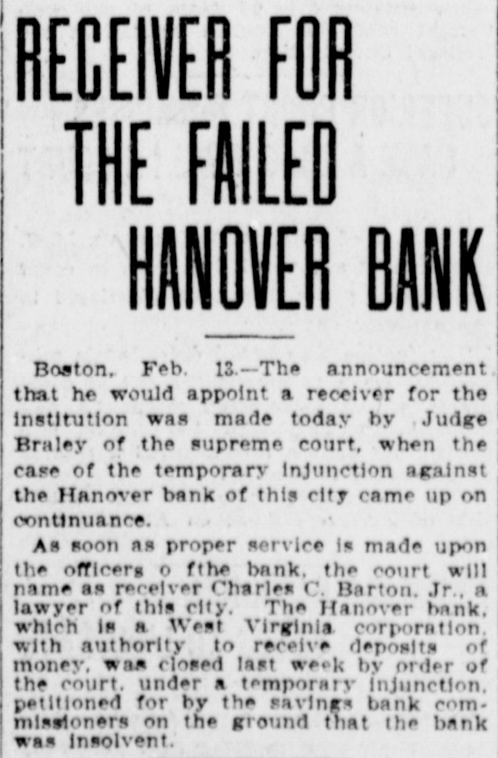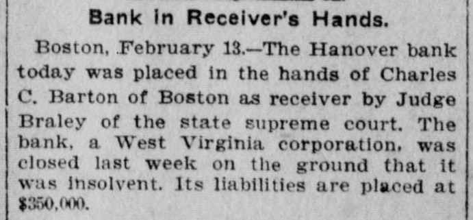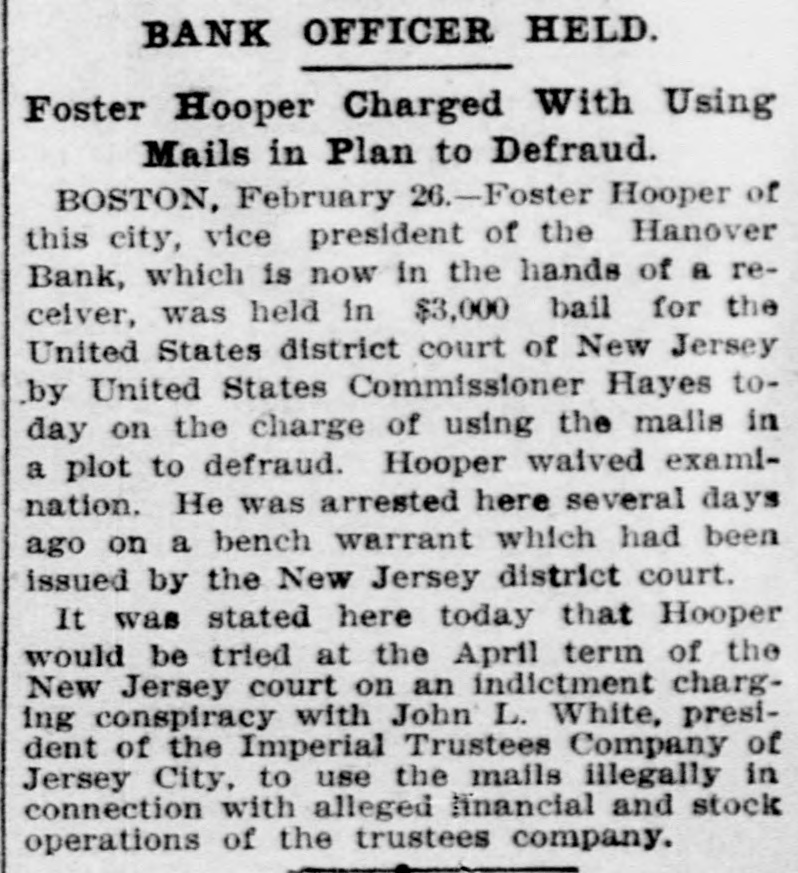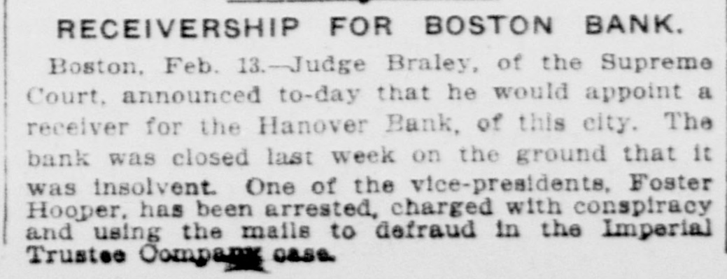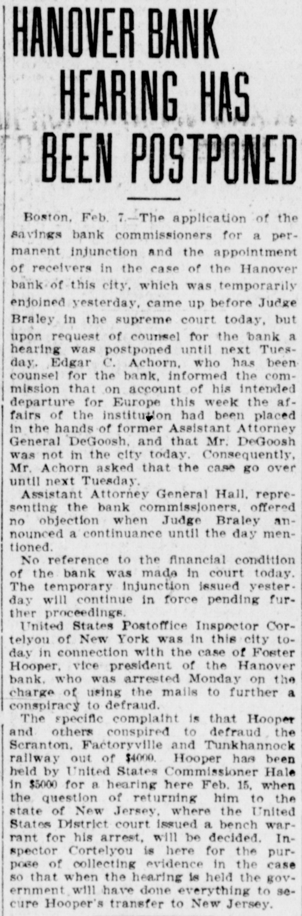 Doors of Hanover Bank of Boston Are Closed. Savings Bank Commissioners Make the Complaint Alleging That Continuance Would Be Hazardous to Public and Depositors. Boston, Feb. 6.-The savings bank commissioners alleging that the continuance of the institution would be hazardous to the public and to those having funds in its custody, Judge Braley, of the supreme judicial court, today issued a temporary injunction against the Hanover Bank, a West Virginia corporation, which has its main office at 133 Hanover street, this city, and branches in the towns of Norwood and Stoughton, Mass. All the officers and directors of this bank are residents of New York. One of the directors, Robert G. Ruxton, was arrested yesterday in New York with John S. White, president of the Imperial Trustees Co. of Jersey City, and Clyde Colt. a New York broker, by United States authorities on indictments charging them with using the mails to defraud. Foster Hooper. who has been known as the vice president of the Hanover Bank. was also arrested yesterday, having been taken into custody in this city on a bench warrant issued by the Caited States district court of New Jersey and charging Hooper with using the mails to further a conspiracy to defraud. The records of the state commissioner of corporations indicate that M. S. Rosewig. of the firm of McJilton & Co., corner of Washington and Courtland streets. New York, is president of the Hanover Bank: that F. W. Jacobs of 32 Broadway, New York, is secretary and treasurer, and that the directors include Robert G. Ruxton, H. B. Mahn, 32 Broadway, New York, and W. Z. Holmes, Fifth avenue and 23d street, New York. The savings bank commissioners decline to disclose the exact condition of affairs of the bank. having turned the entire matter over to Attorney General Dana Malone. The question of making the injunction against the bank permanent and the question of appointing receivers will be heard tomorrow in the supreme court and until that time had arrived the attorney general preferred not to make public the details of the commissioner's report. Mr. Mr. Malone stated, however, that the liabilities of the institution representing the amount due depositors was $32,535. The Hanover Bank occupies a unique position in banking circies, as it is rated neither as a savings nor a national bank. It is a foreign corporation, having received its charter in West Virginia in June, 1905. Its capital stock is $250,000. In the year of its incorporation the Hanover Bank took over the State Banking and Safe Deposit Co., an Arizona corporation with a capital of $1,000,000 and, with its main offices at Hanover street, this city. The president was Charles K. Amidon and the treasurer Albert H. Eastman. The directors included Edward K. Amidon, Foster Hooper, who was arrested yesterday, and Edgar F. Power. In their bill of information to the court the bank commissioners declare that on examination into the company's affairs it appeared that its condition was such as to render the continuance of its business hazardous to the publie and to those having funds in its custody. It is understood that if losses are to be sustained by depositors they will not be as heavy as they would have been several months ago, because of the recent closing of the Provident Securities and Banking Co., which now owes over $193,000 to over 9000 depositors. The embarrassment of the Provident institution induced many persons having money on deposit with the Hanover Bank, both at its main office here and in its branche offices at Stoughton and Norwood, to withdraw their deposits. It is alleged that Hooper. the vice president, and President White of the Imperial Trustees Co. were concerned in a conspiracy to defraud the Scranton. Factoryville & Tunkhannock Railread Co. made a business of investigating and guaranteeing certain stocks. Those that upon investigation proved is a satisfactory investment were, it claimed, divided among banks connect(Continued on Page Five.)