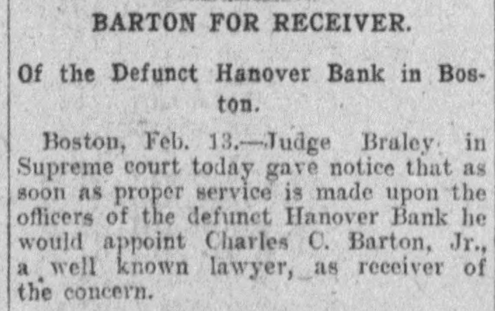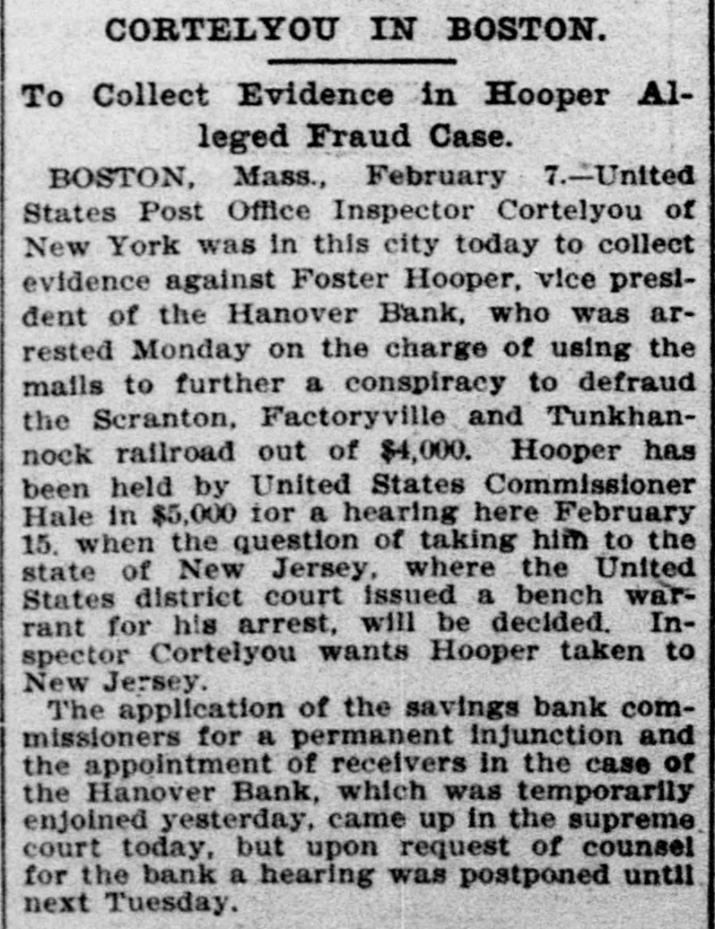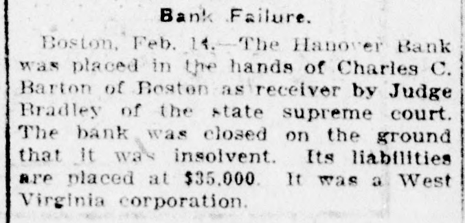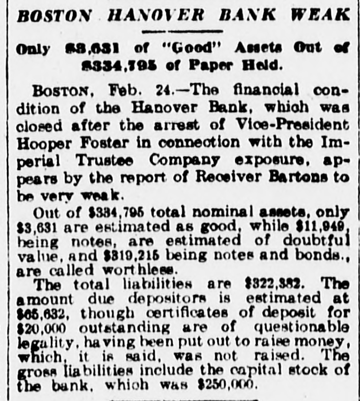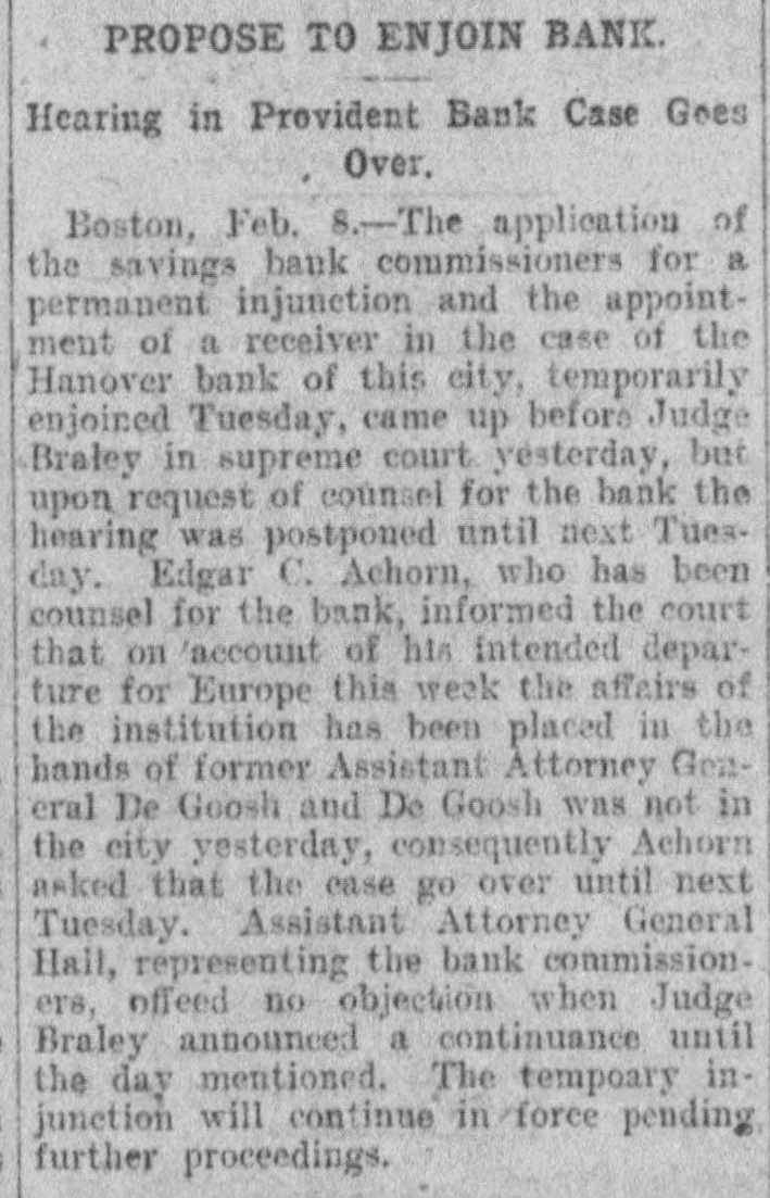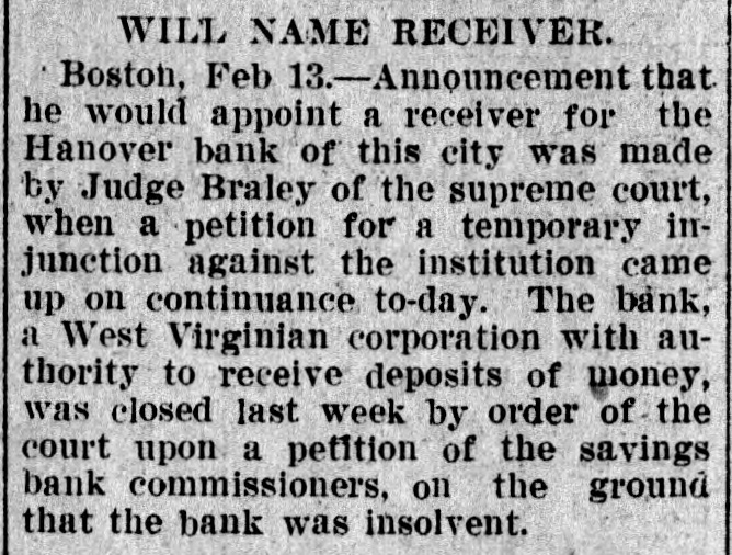 Doors of Hanover Bank of Boston Are Closed. Savings Bank Commissioners Make the Complaint Alleging That Continuance Would Be Hazardous to Public and Depositors. Boston, Feb. 6.-The savings bank commissioners alleging that the continuance of the institution would be hazardous to the public and to those having funds in its custody, Judge Braley, of the supreme judicial court, today issued a temporary injunction against the Hanover Bank, a West Virginia corporation, which has its main office at 133 Hanover street, this city, and branches in the towns of Norwood and Stoughton, Mass. All the officers and directors of this bank are residents of New York. One of the directors, Robert G. Ruxton, was arrested yesterday in New York with John S. White, president of the Imperial Trustees Co. of Jersey City, and Clyde Colt. a New York broker, by United States authorities on indictments charging them with using the mails to defraud. Foster Hooper. who has been known as the vice president of the Hanover Bank. was also arrested yesterday, having been taken into custody in this city on a bench warrant issued by the Caited States district court of New Jersey and charging Hooper with using the mails to further a conspiracy to defraud. The records of the state commissioner of corporations indicate that M. S. Rosewig. of the firm of McJilton & Co., corner of Washington and Courtland streets. New York, is president of the Hanover Bank: that F. W. Jacobs of 32 Broadway, New York, is secretary and treasurer, and that the directors include Robert G. Ruxton, H. B. Mahn, 32 Broadway, New York, and W. Z. Holmes, Fifth avenue and 23d street, New York. The savings bank commissioners decline to disclose the exact condition of affairs of the bank. having turned the entire matter over to Attorney General Dana Malone. The question of making the injunction against the bank permanent and the question of appointing receivers will be heard tomorrow in the supreme court and until that time had arrived the attorney general preferred not to make public the details of the commissioner's report. Mr. Mr. Malone stated, however, that the liabilities of the institution representing the amount due depositors was $32,535. The Hanover Bank occupies a unique position in banking circies, as it is rated neither as a savings nor a national bank. It is a foreign corporation, having received its charter in West Virginia in June, 1905. Its capital stock is $250,000. In the year of its incorporation the Hanover Bank took over the State Banking and Safe Deposit Co., an Arizona corporation with a capital of $1,000,000 and, with its main offices at Hanover street, this city. The president was Charles K. Amidon and the treasurer Albert H. Eastman. The directors included Edward K. Amidon, Foster Hooper, who was arrested yesterday, and Edgar F. Power. In their bill of information to the court the bank commissioners declare that on examination into the company's affairs it appeared that its condition was such as to render the continuance of its business hazardous to the publie and to those having funds in its custody. It is understood that if losses are to be sustained by depositors they will not be as heavy as they would have been several months ago, because of the recent closing of the Provident Securities and Banking Co., which now owes over $193,000 to over 9000 depositors. The embarrassment of the Provident institution induced many persons having money on deposit with the Hanover Bank, both at its main office here and in its branche offices at Stoughton and Norwood, to withdraw their deposits. It is alleged that Hooper. the vice president, and President White of the Imperial Trustees Co. were concerned in a conspiracy to defraud the Scranton. Factoryville & Tunkhannock Railread Co. made a business of investigating and guaranteeing certain stocks. Those that upon investigation proved is a satisfactory investment were, it claimed, divided among banks connect(Continued on Page Five.)