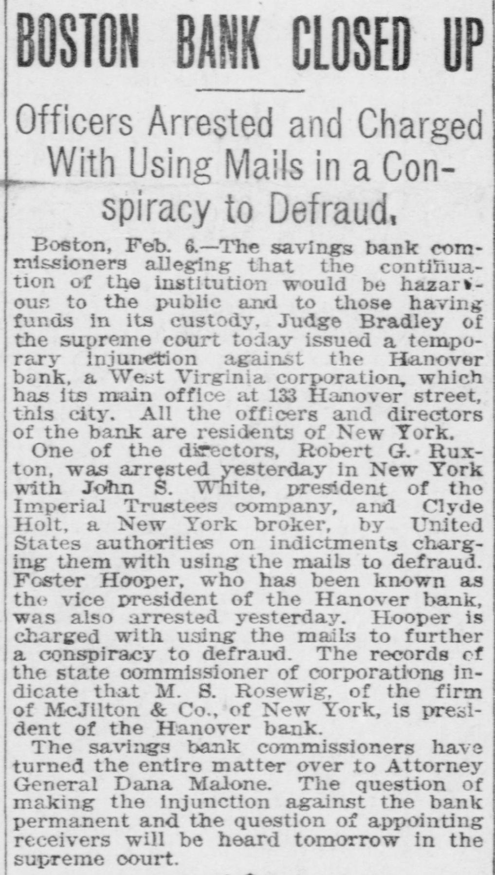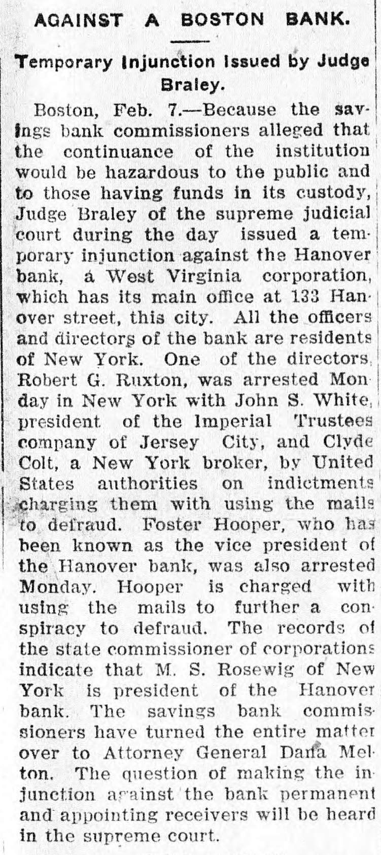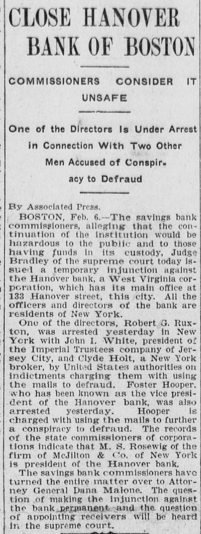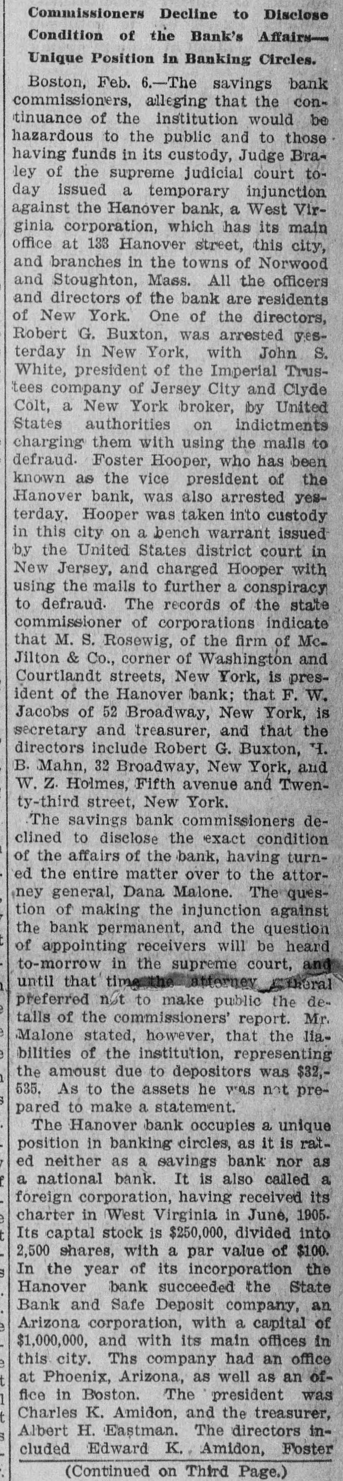 Commissioners Decline to Disclose Condition of the Bank's AffairsUnique Position in Banking Circles. Boston, Feb. 6.-The savings bank commissioners, alleging that the continuance of the institution would be hazardous to the public and to those having funds in its custody, Judge Bra= ley of the supreme judicial court today issued a temporary injunction against the Hanover bank, a West Virginia corporation, which has its main office at 133 Hanover street, this city, and branches in the towns of Norwood and Stoughton, Mass. All the officers and directors of the bank are residents of New York. One of the directors, Robert G. Buxton, was arrested yesterday in New York, with John S. White, president of the Imperial Trustees company of Jersey City and Clyde Colt, a New York broker, by United States authorities on indictments charging them with using the mails to defraud. Foster Hooper, who has been known as the vice president of the Hanover bank, was also arrested yesterday. Hooper was taken into custody in this city on a bench warrant issued by the United States district court in New Jersey, and charged Hooper with using the mails to further a conspiracy to defraud. The records of the state commissioner of corporations indicate that M. S. Rosewig, of the firm of Mc= Jilton & Co., corner of Washington and Courtlandt streets, New York, is president of the Hanover bank; that F. W. Jacobs of 52 Broadway, New York, is secretary and treasurer, and that the directors include Robert G. Buxton, H. B. Mahn, 32 Broadway, New York, and W. Z. Holmes, Fifth avenue and Twenty-third street, New York. The savings bank commissioners declined to disclose the exact condition of the affairs of the bank, having turned the entire matter over to the attorney general, Dana Malone. The question of making the injunction against the bank permanent, and the question of appointing receivers will be heard to-morrow in the supreme court, and until that timesth attorney theral preferred not to make public the detalls of the commissioners' report. Mr. Malone stated, however, that the liabilities of the institution, representing the amoust due to depositors was $32,535. As to the assets he was not prepared to make a statement. The Hanover bank occupies a unique position in banking circles, as it is rated neither as a savings bank nor as a national bank. It is also called a foreign corporation, having received its charter in West Virginia in June, 1905. Its captal stock is $250,000, divided into 2,500 shares, with a par value of $100. In the year of its incorporation the Hanover bank succeeded the State Bank and Safe Deposit company, an e Arizona corporation, with a capital of $1,000,000, and with its main offices in e this city. Ths company had an office t at Phoenix, Arizona, as well as an of1 fice in Boston. The president was t Charles K. Amidon, and the treasurer, Albert H. Eastman. The directors included Edward K. Amidon, Foster (Continued on Third Page.)