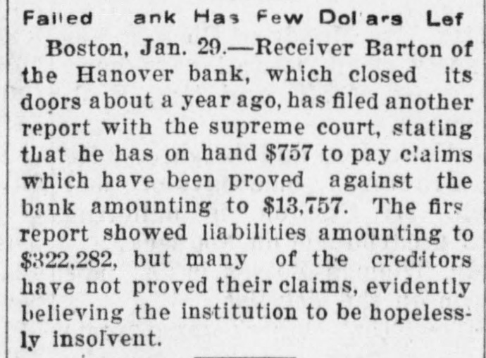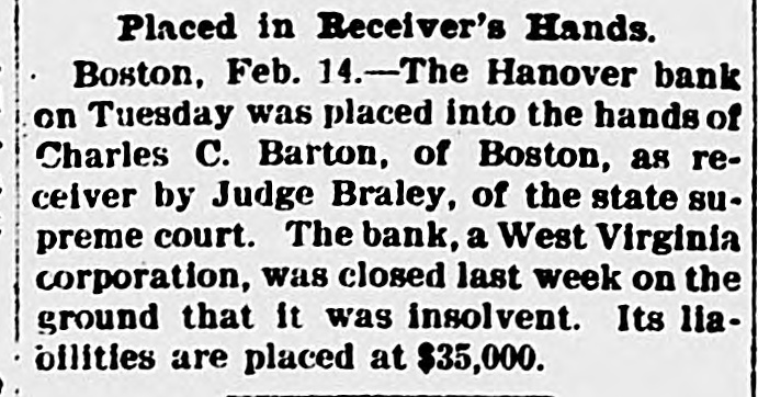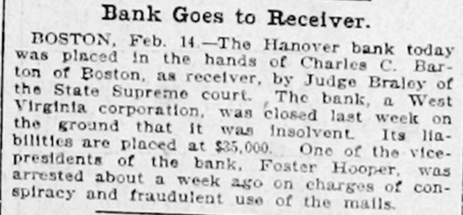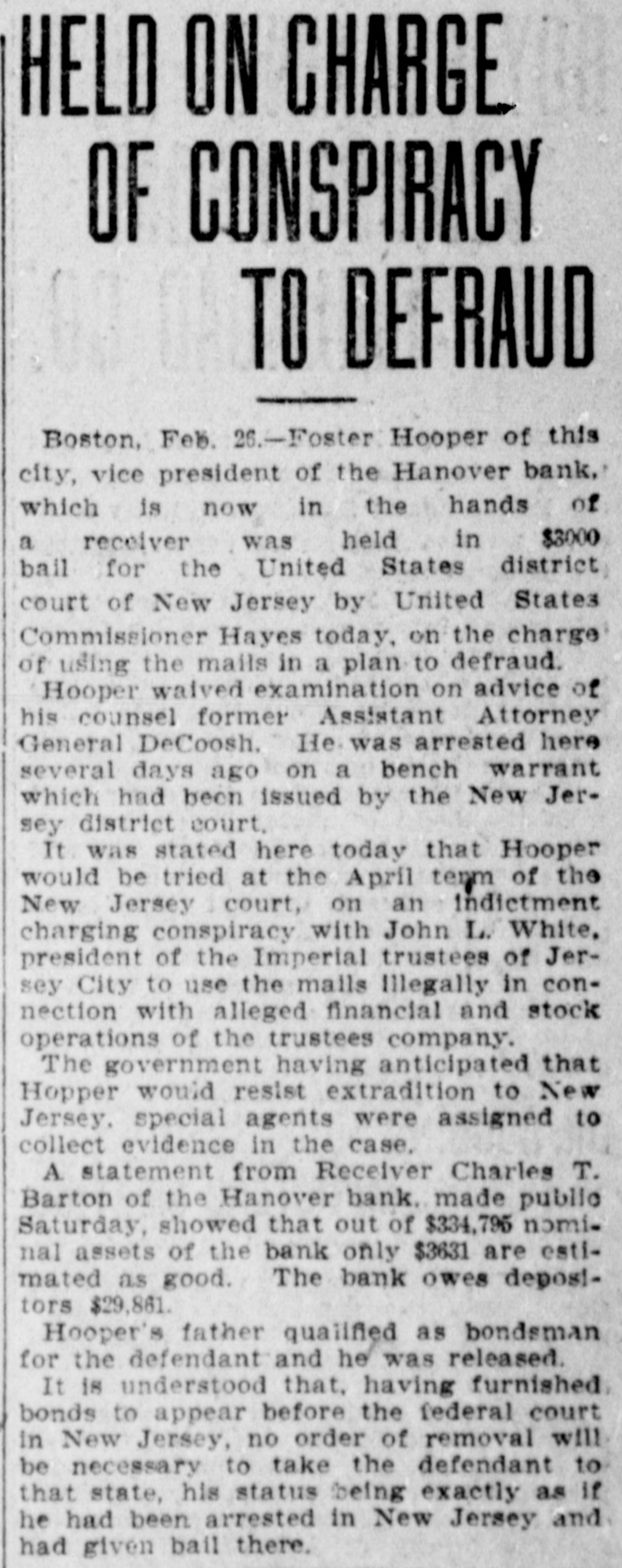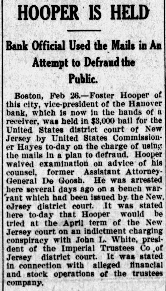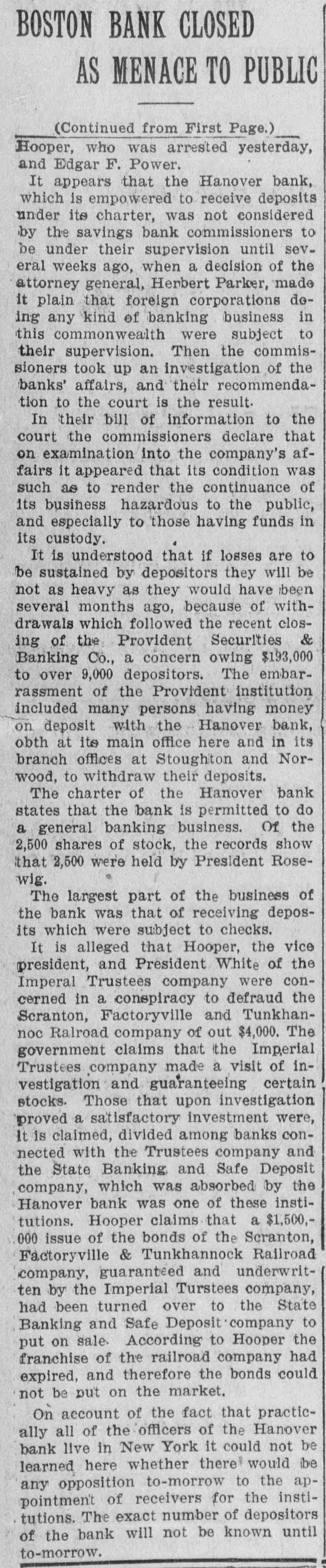 Commissioners Decline to Disclose Condition of the Bank's AffairsUnique Position in Banking Circles. Boston, Feb. 6.-The savings bank commissioners, alleging that the continuance of the institution would be hazardous to the public and to those having funds in its custody, Judge Bra= ley of the supreme judicial court today issued a temporary injunction against the Hanover bank, a West Virginia corporation, which has its main office at 133 Hanover street, this city, and branches in the towns of Norwood and Stoughton, Mass. All the officers and directors of the bank are residents of New York. One of the directors, Robert G. Buxton, was arrested yesterday in New York, with John S. White, president of the Imperial Trustees company of Jersey City and Clyde Colt, a New York broker, by United States authorities on indictments charging them with using the mails to defraud. Foster Hooper, who has been known as the vice president of the Hanover bank, was also arrested yesterday. Hooper was taken into custody in this city on a bench warrant issued by the United States district court in New Jersey, and charged Hooper with using the mails to further a conspiracy to defraud. The records of the state commissioner of corporations indicate that M. S. Rosewig, of the firm of Mc= Jilton & Co., corner of Washington and Courtlandt streets, New York, is president of the Hanover bank; that F. W. Jacobs of 52 Broadway, New York, is secretary and treasurer, and that the directors include Robert G. Buxton, H. B. Mahn, 32 Broadway, New York, and W. Z. Holmes, Fifth avenue and Twenty-third street, New York. The savings bank commissioners declined to disclose the exact condition of the affairs of the bank, having turned the entire matter over to the attorney general, Dana Malone. The question of making the injunction against the bank permanent, and the question of appointing receivers will be heard to-morrow in the supreme court, and until that timesth attorney theral preferred not to make public the detalls of the commissioners' report. Mr. Malone stated, however, that the liabilities of the institution, representing the amoust due to depositors was $32,535. As to the assets he was not prepared to make a statement. The Hanover bank occupies a unique position in banking circles, as it is rated neither as a savings bank nor as a national bank. It is also called a foreign corporation, having received its charter in West Virginia in June, 1905. Its captal stock is $250,000, divided into 2,500 shares, with a par value of $100. In the year of its incorporation the Hanover bank succeeded the State Bank and Safe Deposit company, an e Arizona corporation, with a capital of $1,000,000, and with its main offices in e this city. Ths company had an office t at Phoenix, Arizona, as well as an of1 fice in Boston. The president was t Charles K. Amidon, and the treasurer, Albert H. Eastman. The directors included Edward K. Amidon, Foster (Continued on Third Page.)